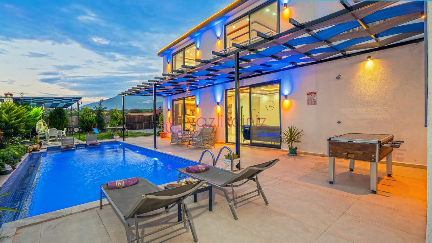 Havuz terasında; Özel korunaklı yüzme havuzu, masa tenisi, şezlong, şemsiye, salıncak, bahçe oturma grubu, çocuk oyun parkı, mini kale, barbekü bulunmaktadır.