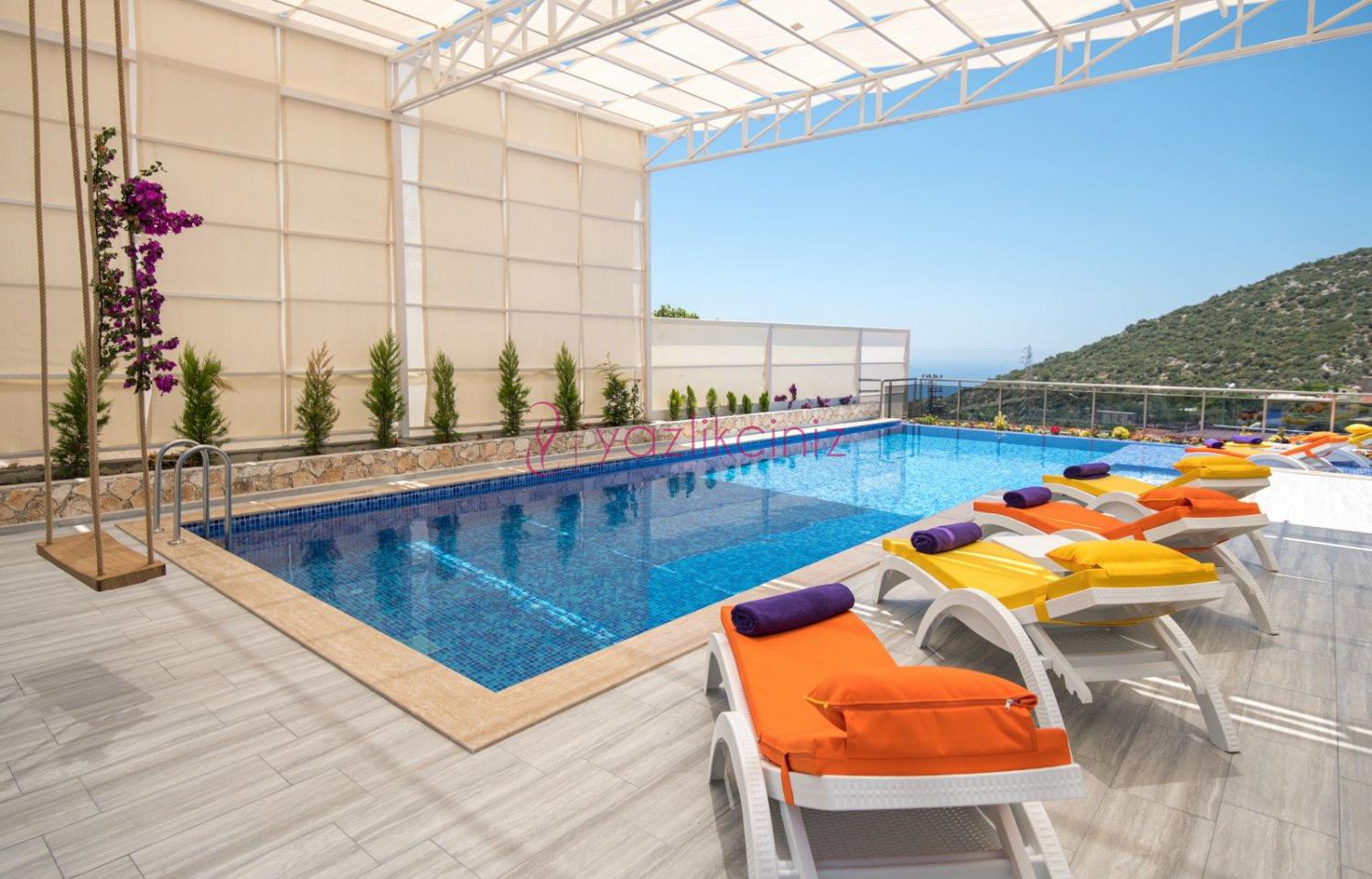 Korunaklı Havuzlu, Jakuzili, Saunalı, Sinema Salonlu, Kalkan ve deniz manzaralı, 3 yatak odalı 6 kişilik kiralık villa