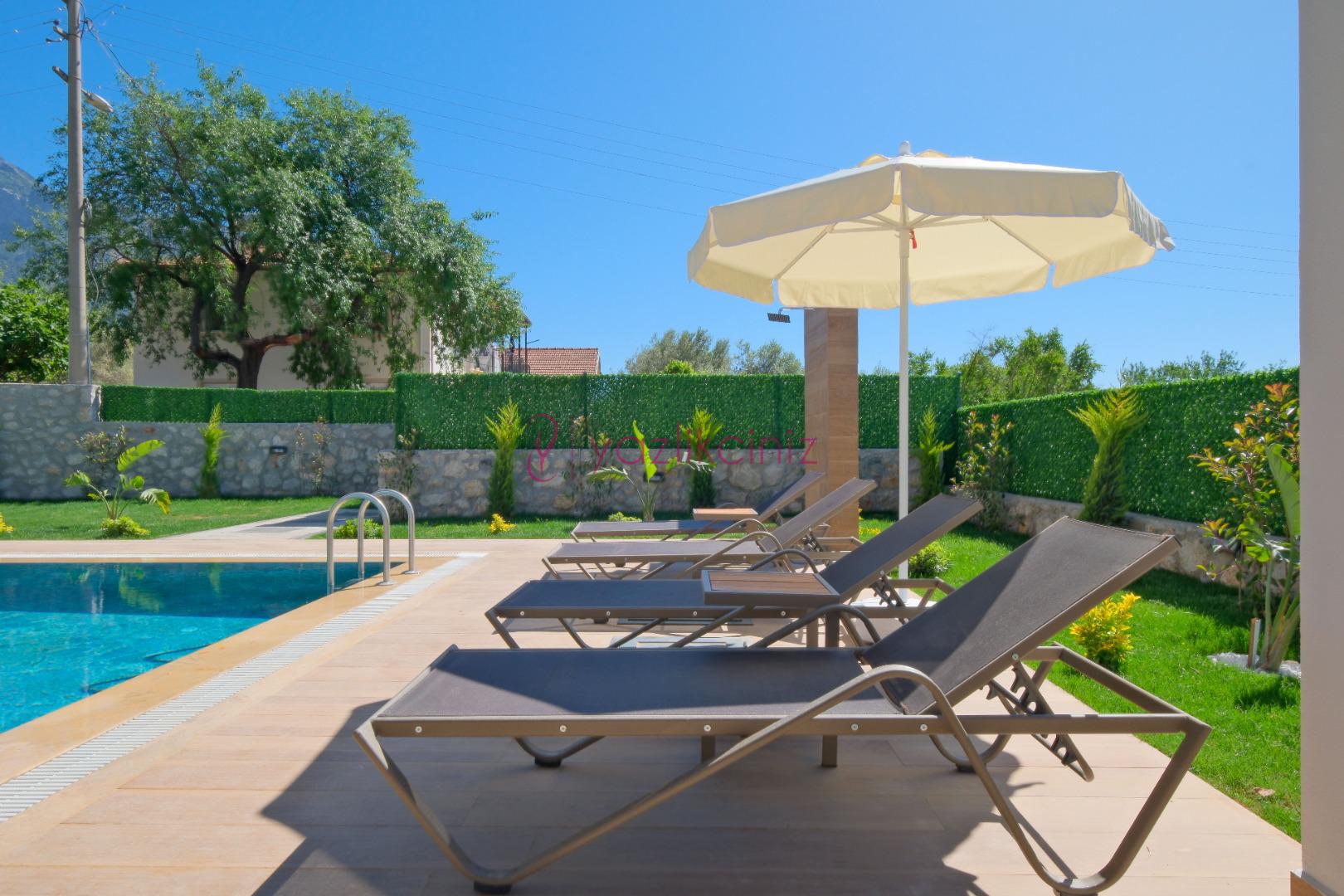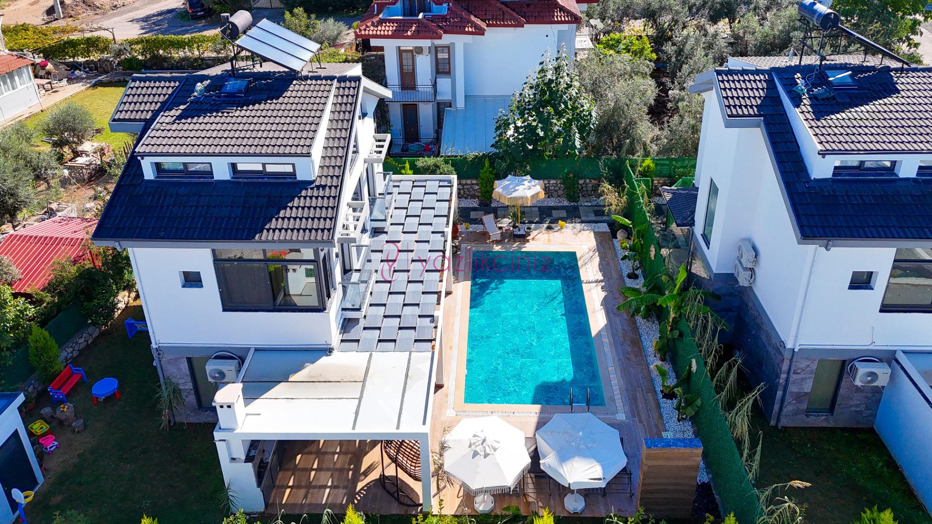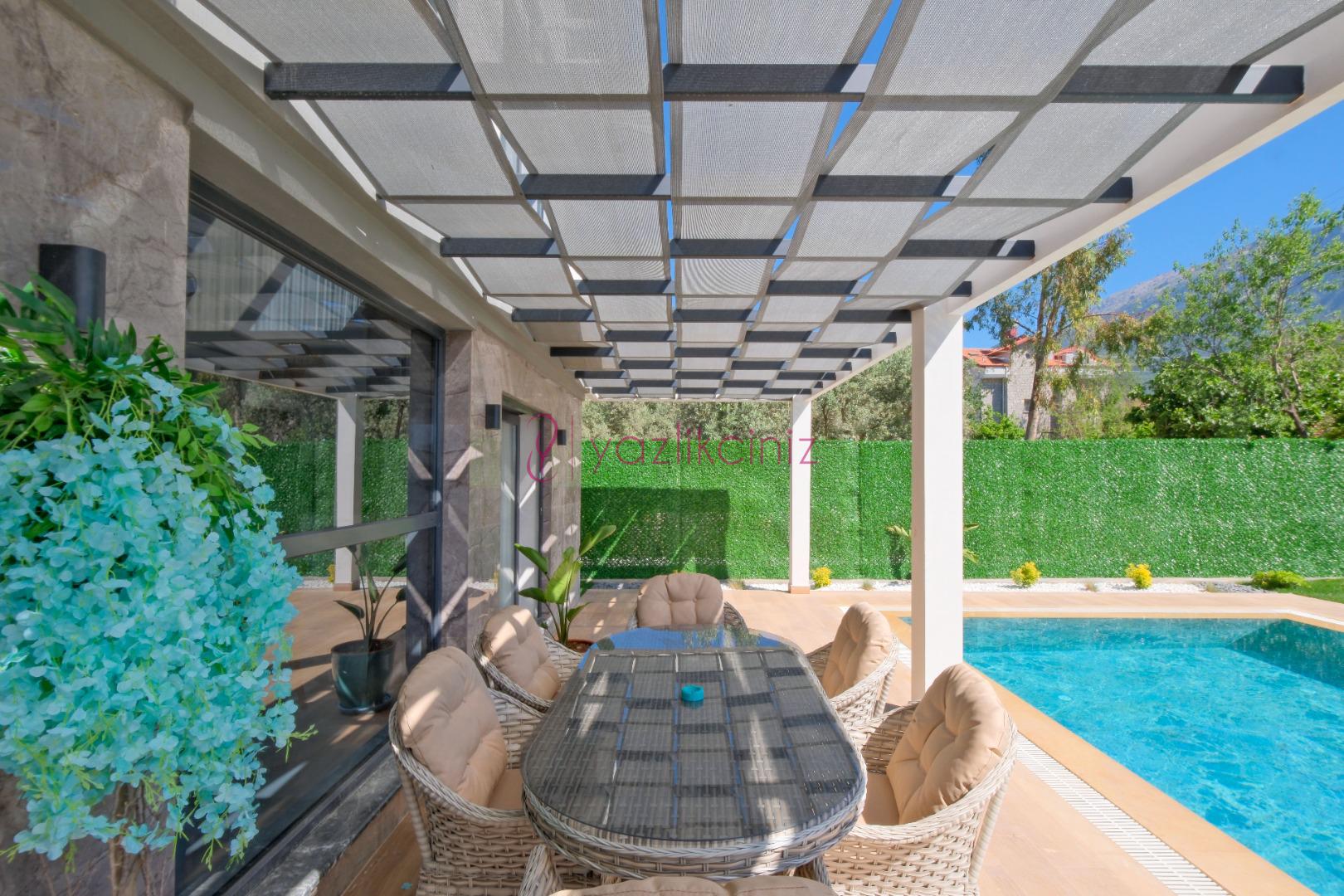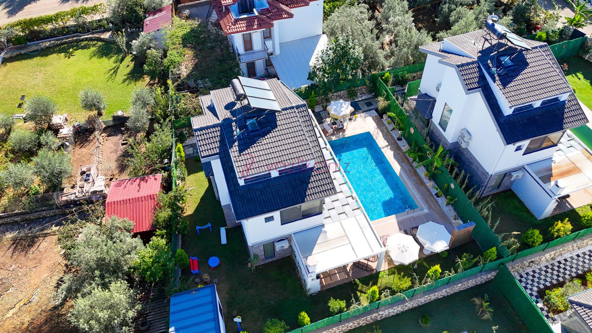 Villanın güneşlenme terası ve havuzunun dış taraftan görünmemesi için gerekli önlemler alınmıştır fakat villanın diğer bölümlerinin görünürlüğü kesin olarak garanti edilememektedir.