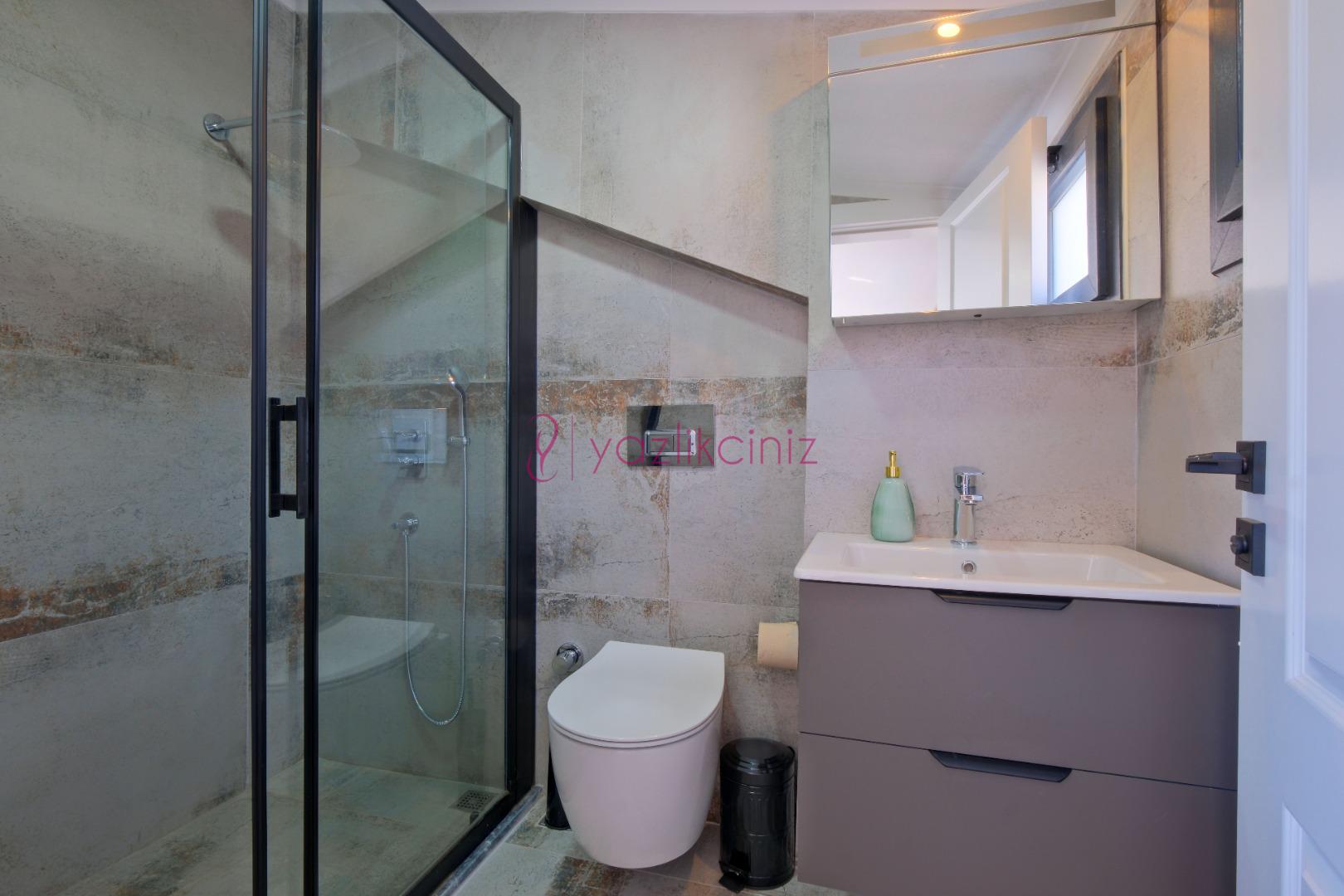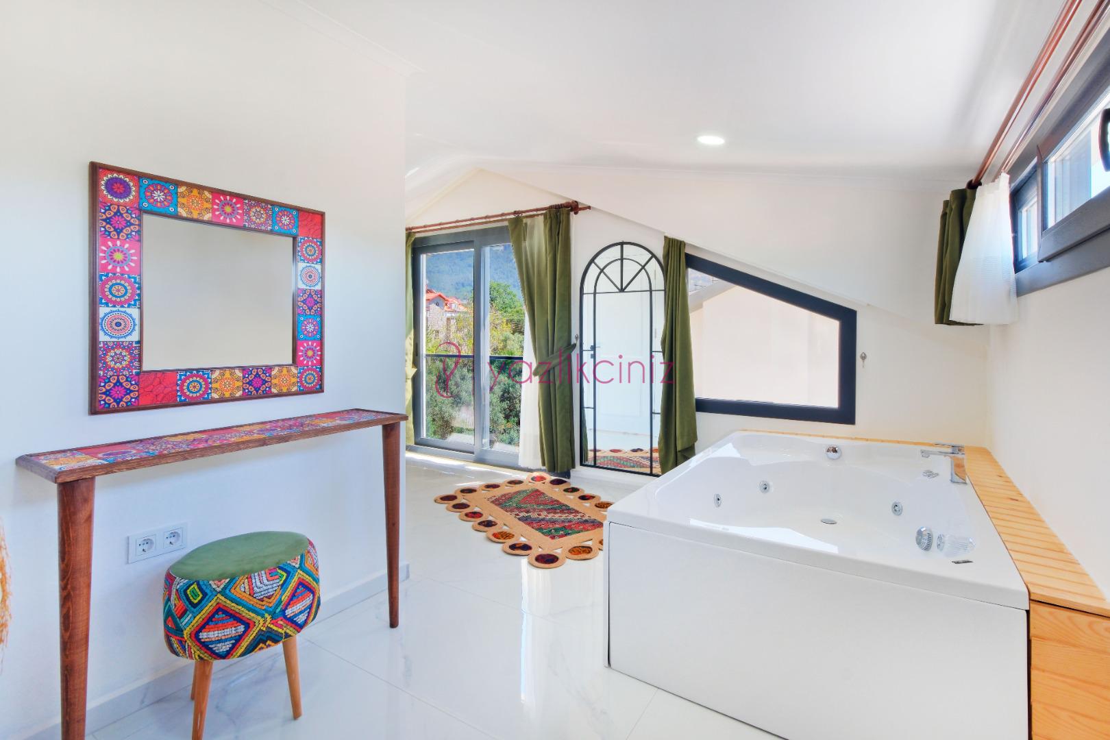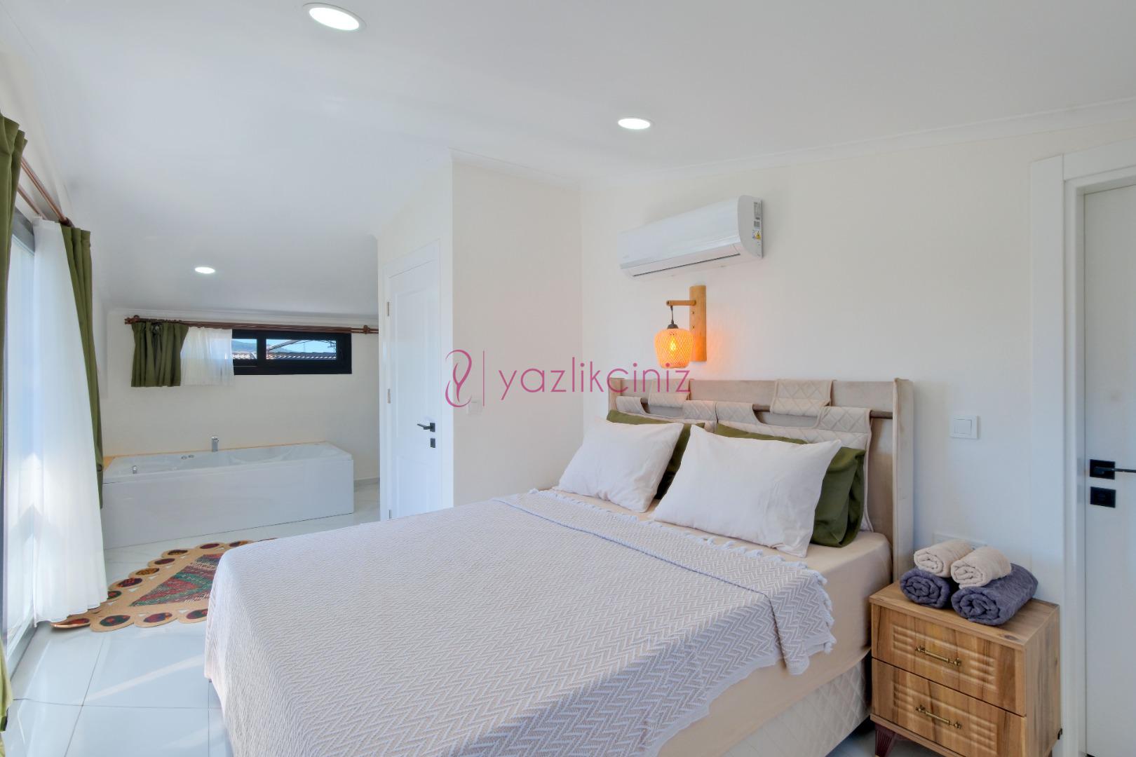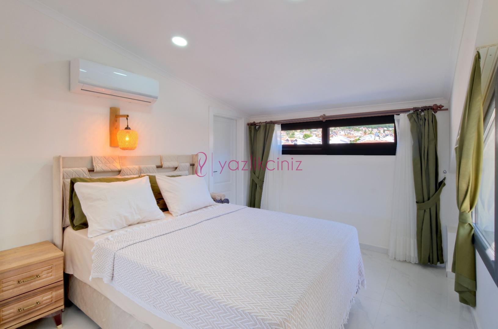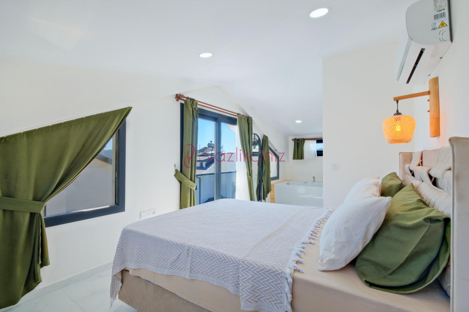 3.Yatak Odası: 1 adet çift kişilik yatak, komodin, klima, elbise dolabı, jakuzi, tuvalet ve banyo bulunmaktadır. (Çatı katı)