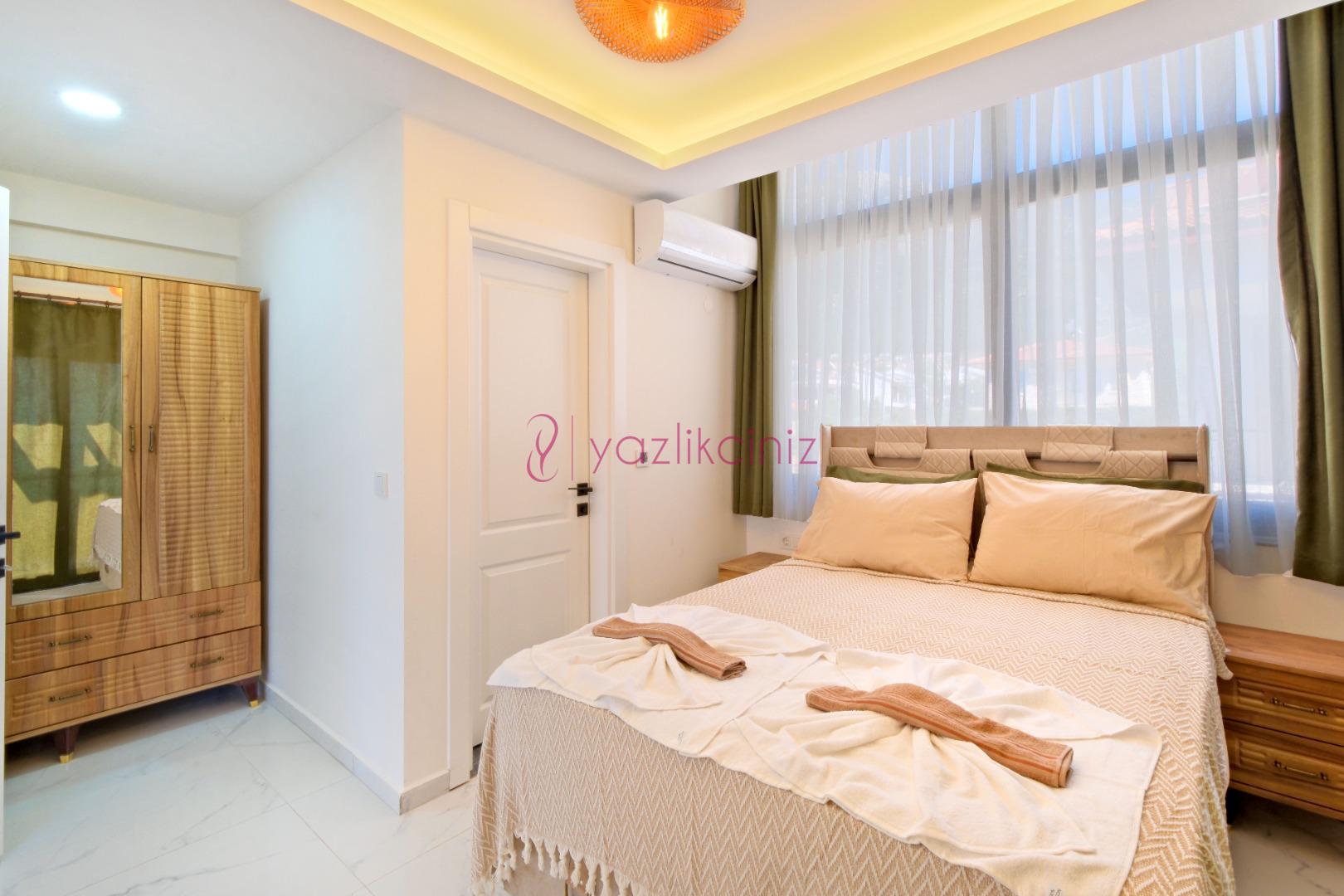 1.Yatak Odası: 1 adet çift kişilik yatak, komodin, klima, elbise dolabı, tuvalet ve banyo bulunmaktadır. (Birinci kat)