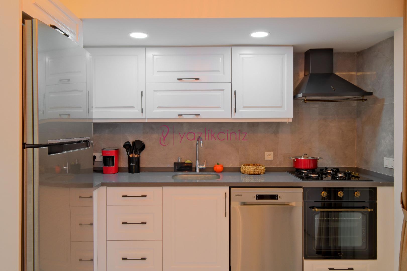 Amerikan mutfak, buzdolabı, bulaşık makinesi, çamaşır makinesi, fırın, 4’lü Ocak (ankastre), elektrikli su ısıtıcı, tava, tencere vb. mutfak ekipmanları, yemek masası, yemek takımı bulunmaktadır.