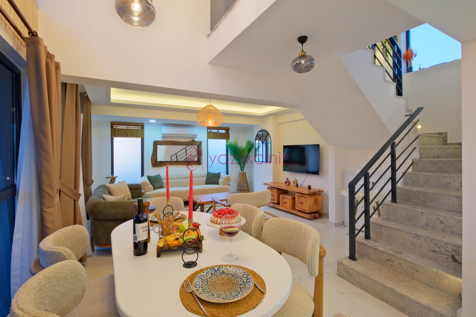 Doğa ve havuz manzaralı salonunda oturma grubu, plazma TV, uydu alıcısı, klima ve havuz başına çıkış bulunmaktadır.