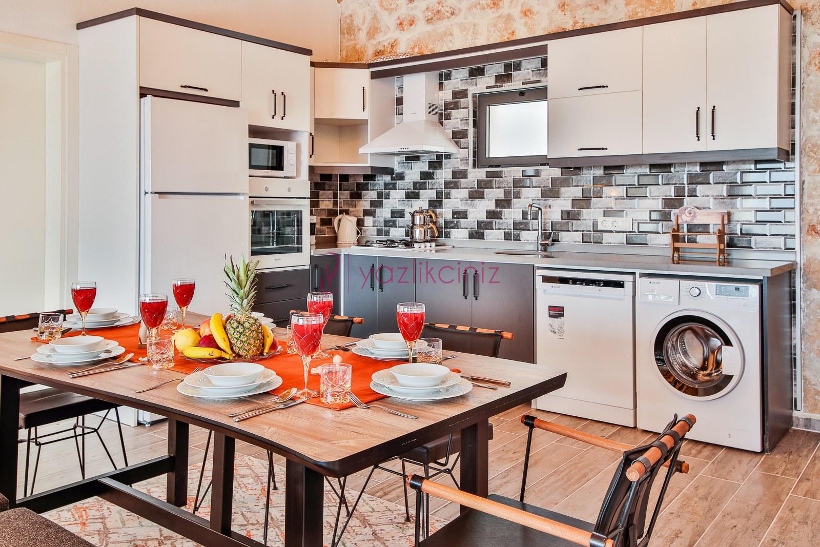 Geniş, Ferah ve Modern Dizayn Edilmiş Amerikan Mutfak, Buzdolabı, Bulaşık Makinesi, Çamaşır Makinesi, Fırın, 4’lü Ocak (ankastre), Mikrodalga Fırın, Elektrikli Su Isıtıcısı, Tost Makinesi, Tava & Tencere vb. Mutfak Ekipmanları, 4 Kişilik Yemek Takımı