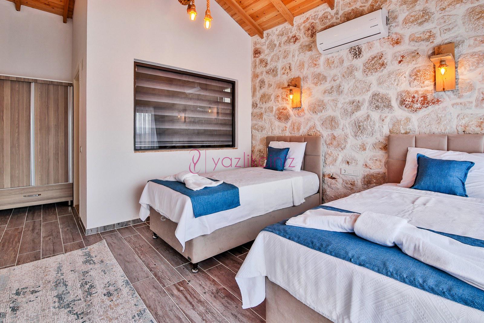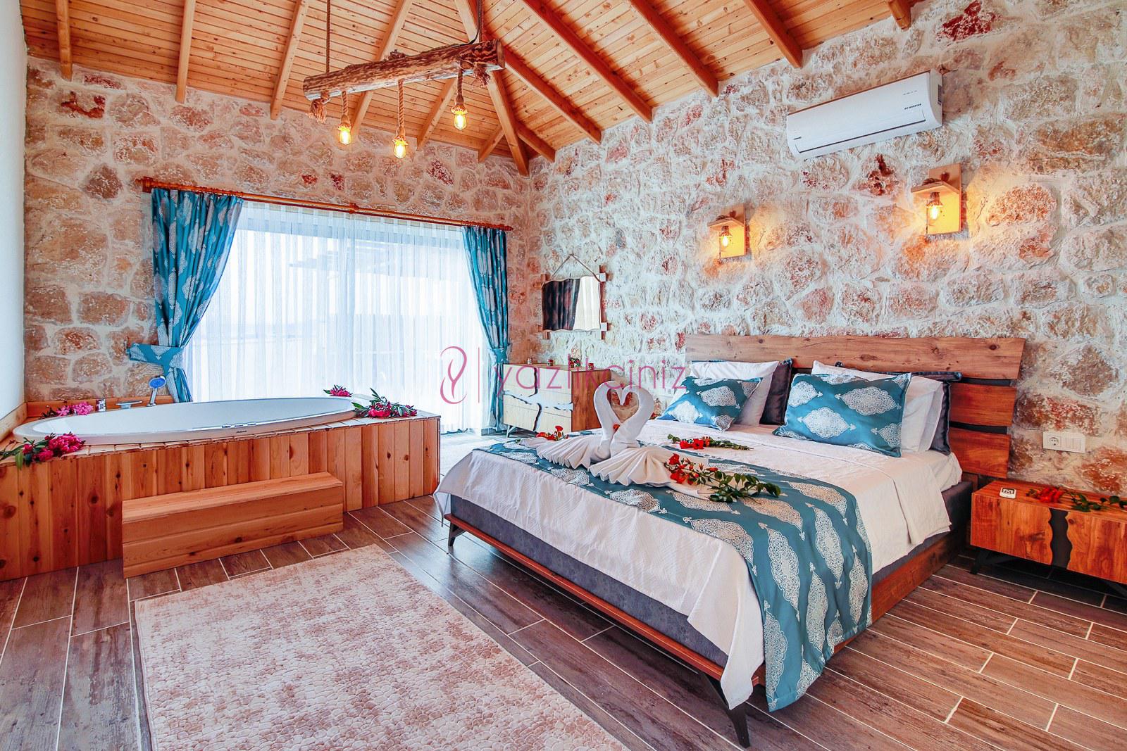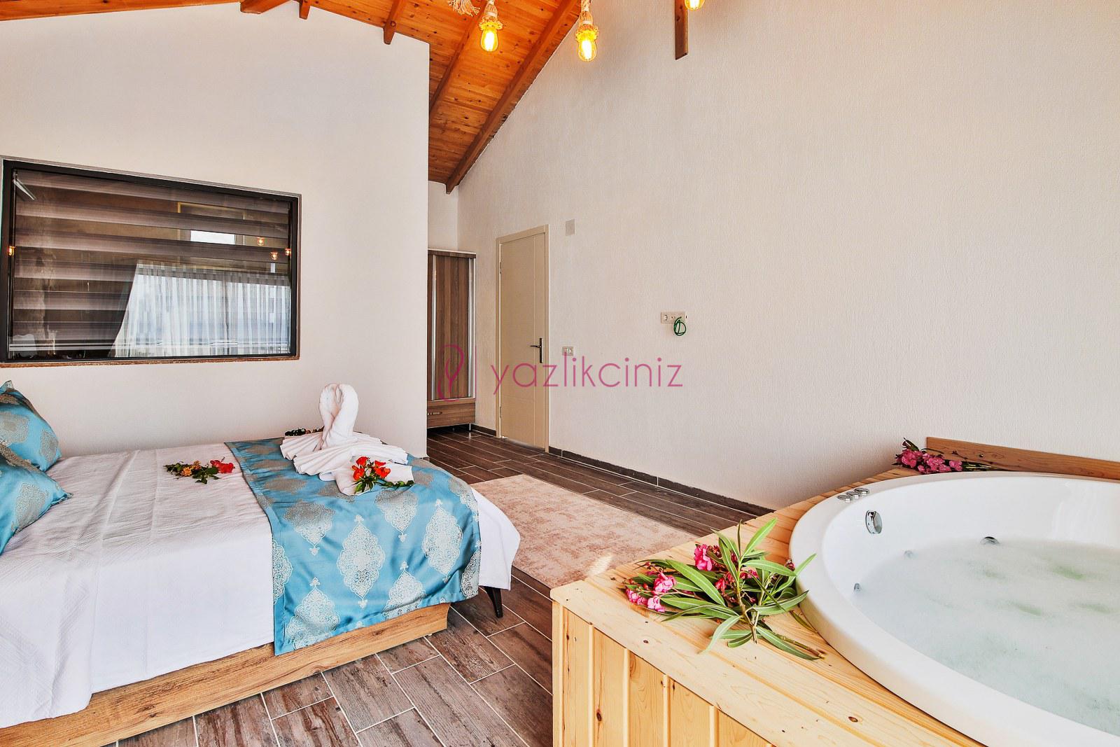1.Yatak Odası: Süit oda, 1 adet çift kişilik yatak, jakuzi, komodin, klima, makyaj masası, elbise dolabı, banyo, tuvalet bulunmaktadır.