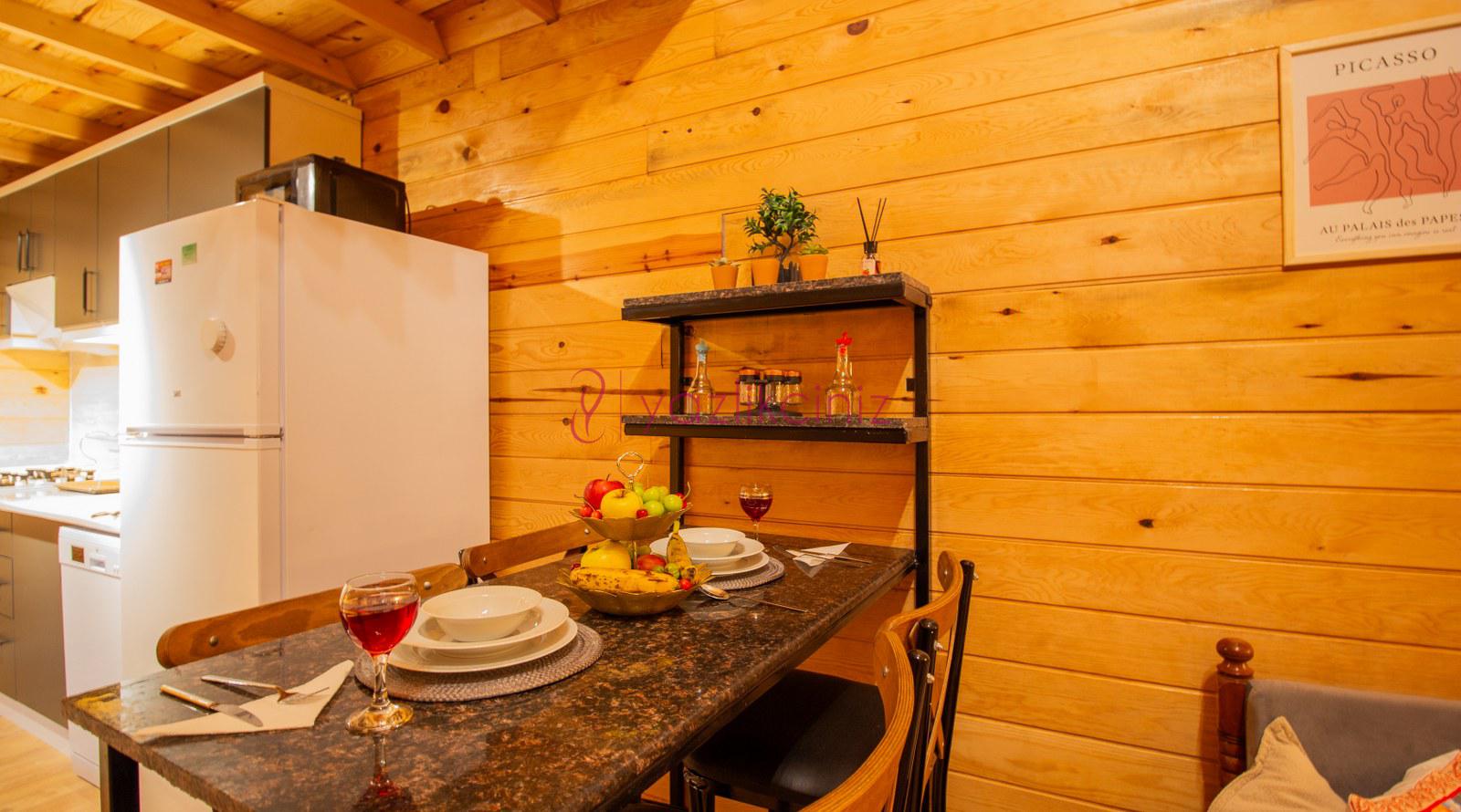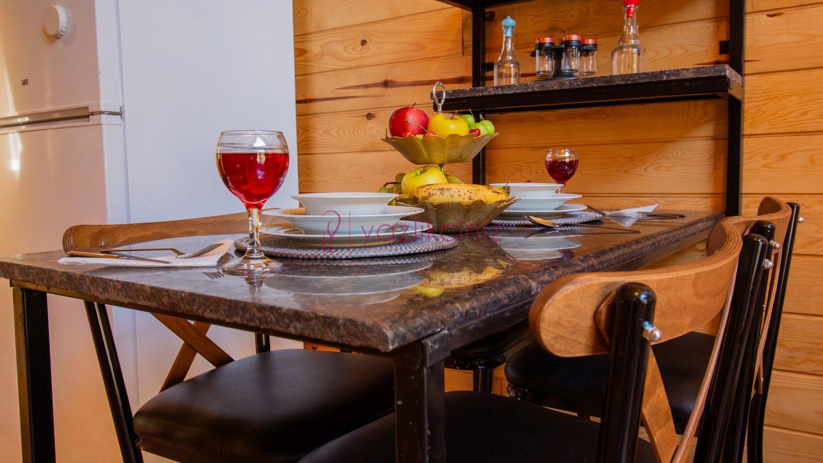 Modern açık mutfak içerisinde buzdolabı, bulaşık makinesi, fırın, ocak, mikrodalga fırın, yemek masası, yemek takımları, çatal ve bıçak takımları, tencere ve tava takımları, bardaklar bulunmaktadır.