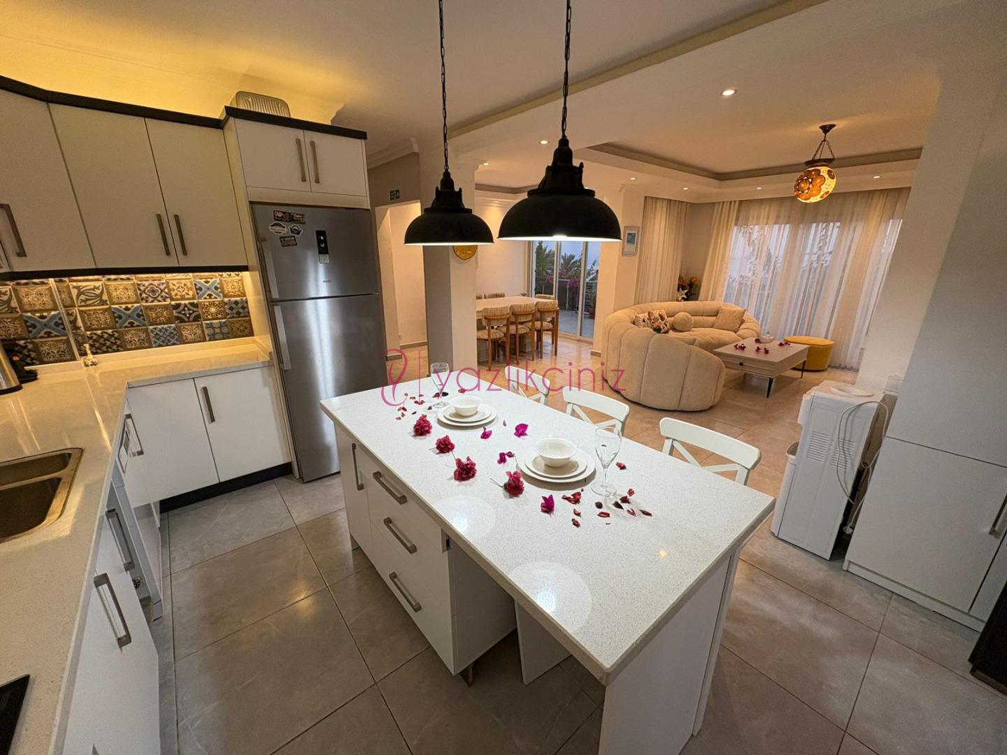 Modern Amerikan mutfakta, bulaşık makinesi, çamaşır makinesi, mikrodalga fırın, ankastre fırın, ankastre 4’lü ocak, buzdolabı, elektrikli su ısıtıcı (kettle), tencere ve tava takımı, yemek takımı, kaşık ve çatal seti ve bardaklar bulunmaktadır. Mutfak bölümünden de havuz terasına çıkılabilmektedir.