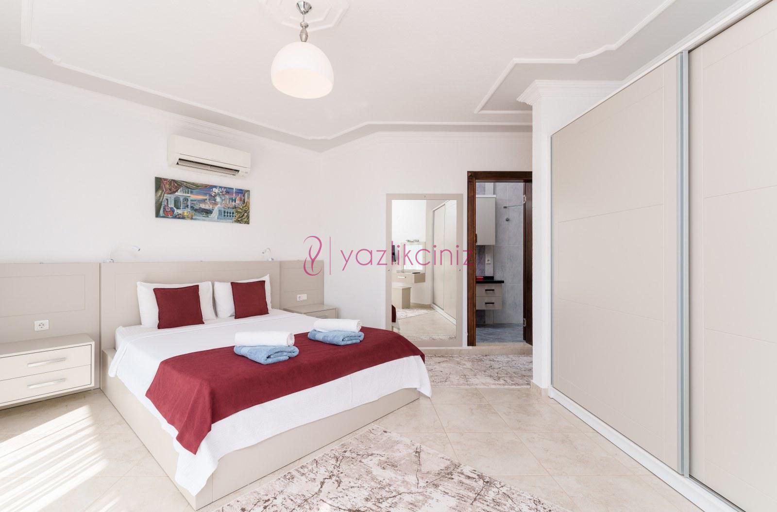 Yatak odası 1: Çİft kişilik yatak, makyaj masası, komodin, elbise dolabı, klima, ebeveyn banyosu bulunmaktadır.