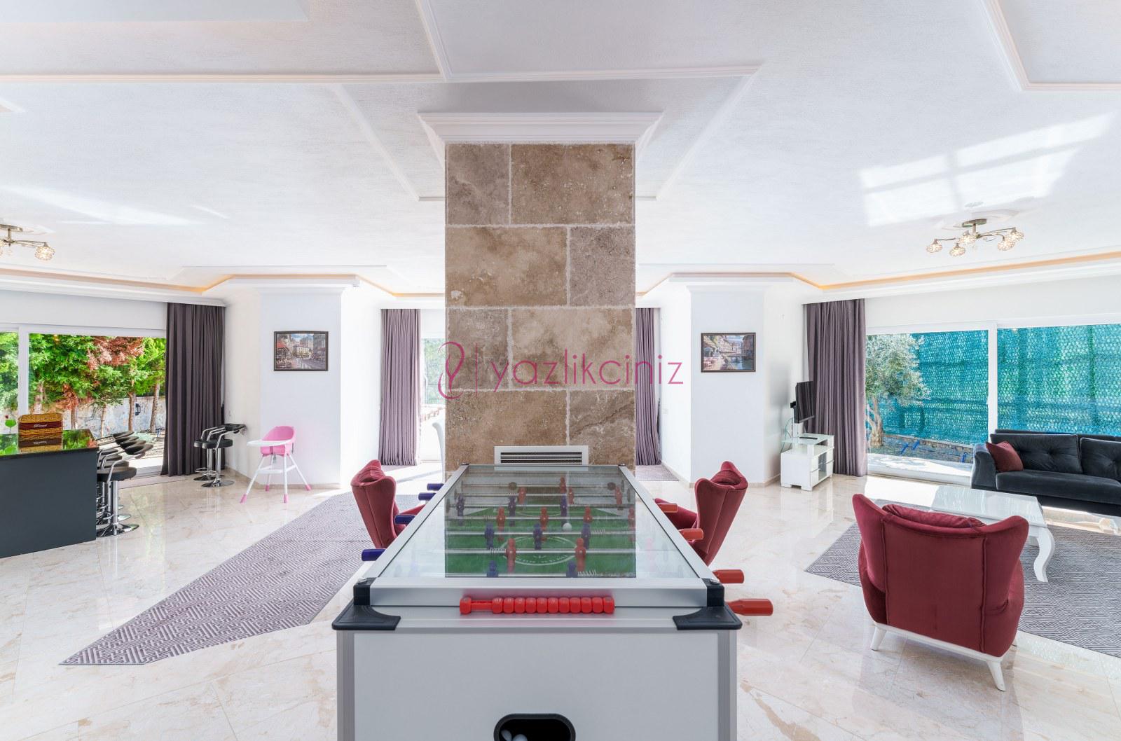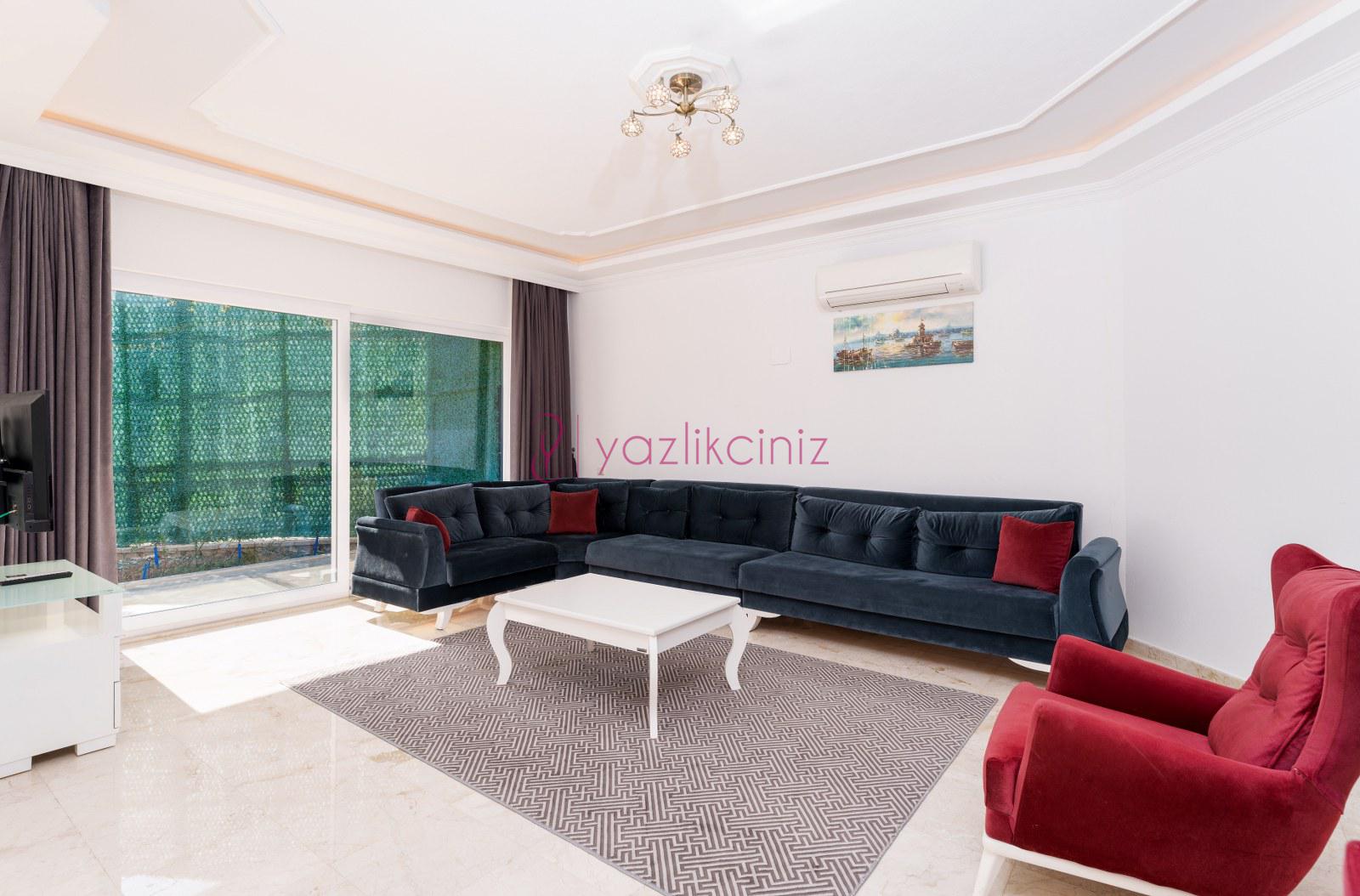 Salonunda, oturma grubu, televizyon, uydu alıcısı, klima, sehpa ve havuz terasına çıkış bulunmaktadır.