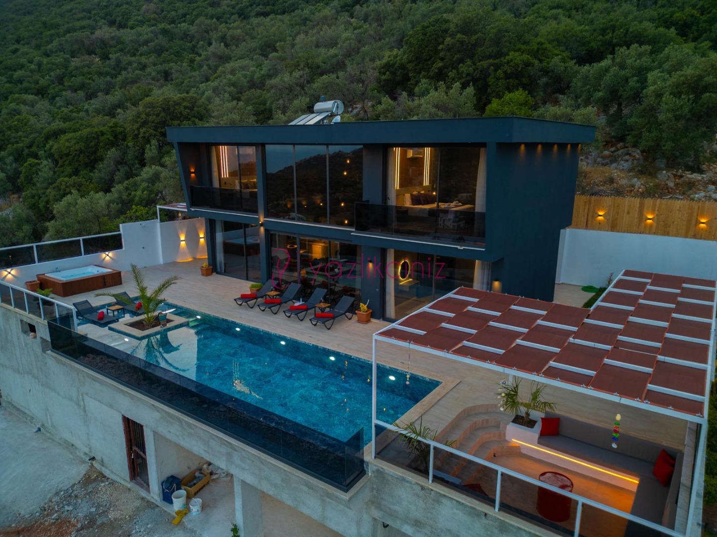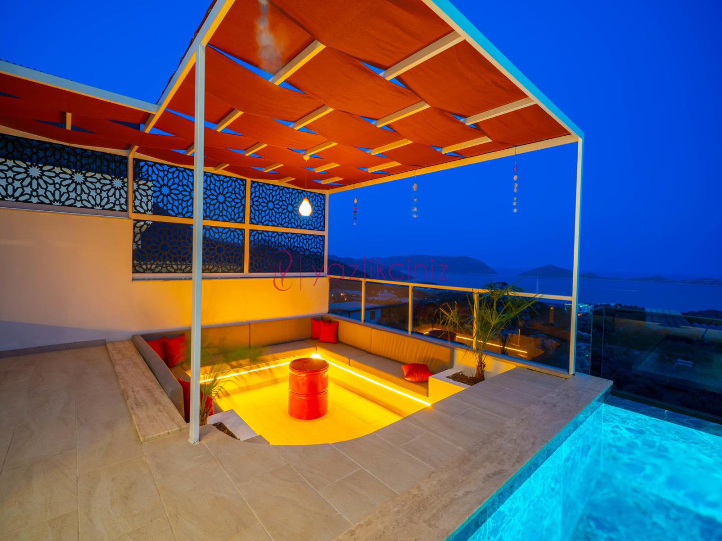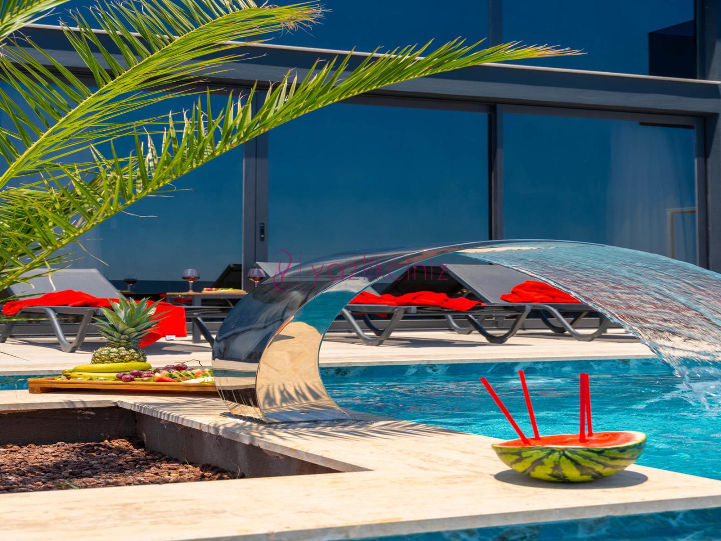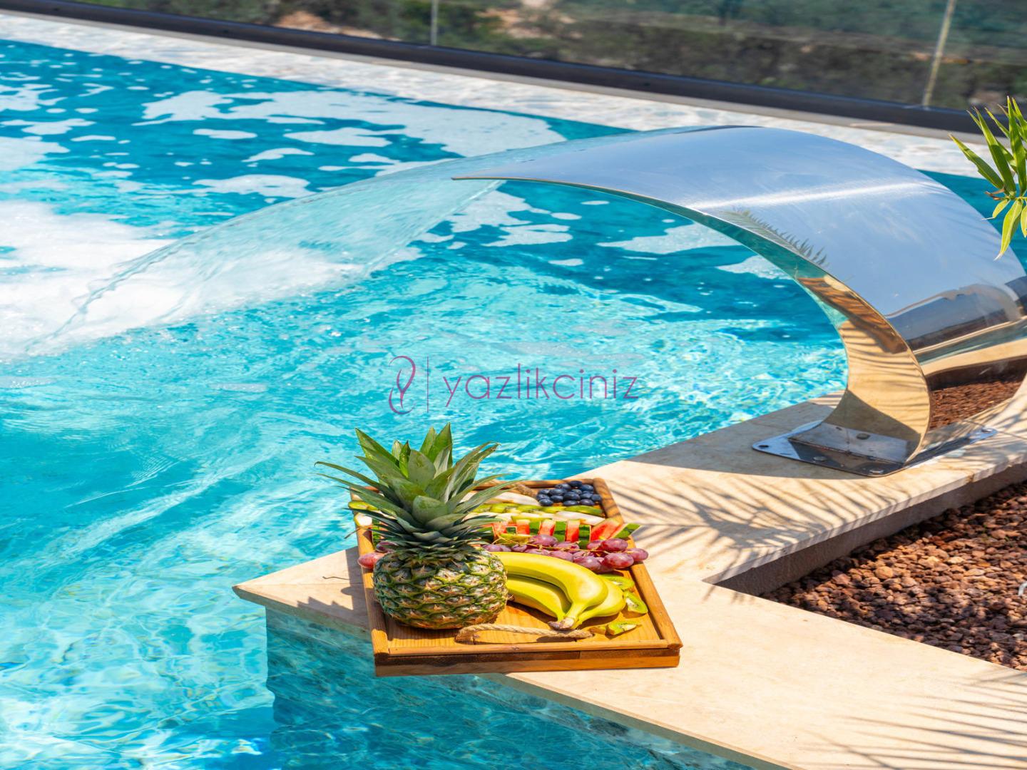 Özel yüzme havuzu, havuz başında güneşlenme alanı, oturma grubu,  barbekü, yemek masası ve sandalyeleri, salıncak bulunmaktadır.