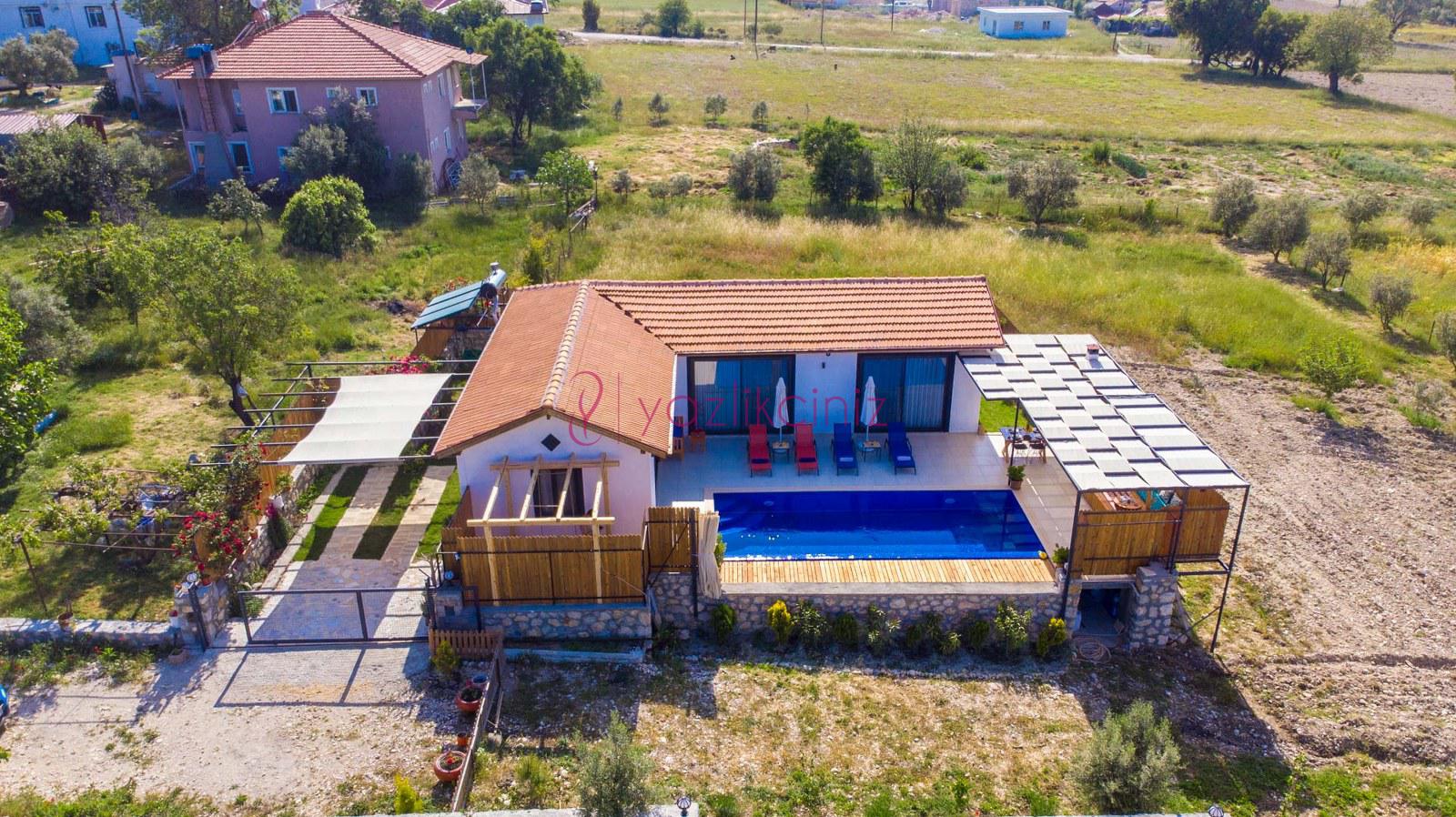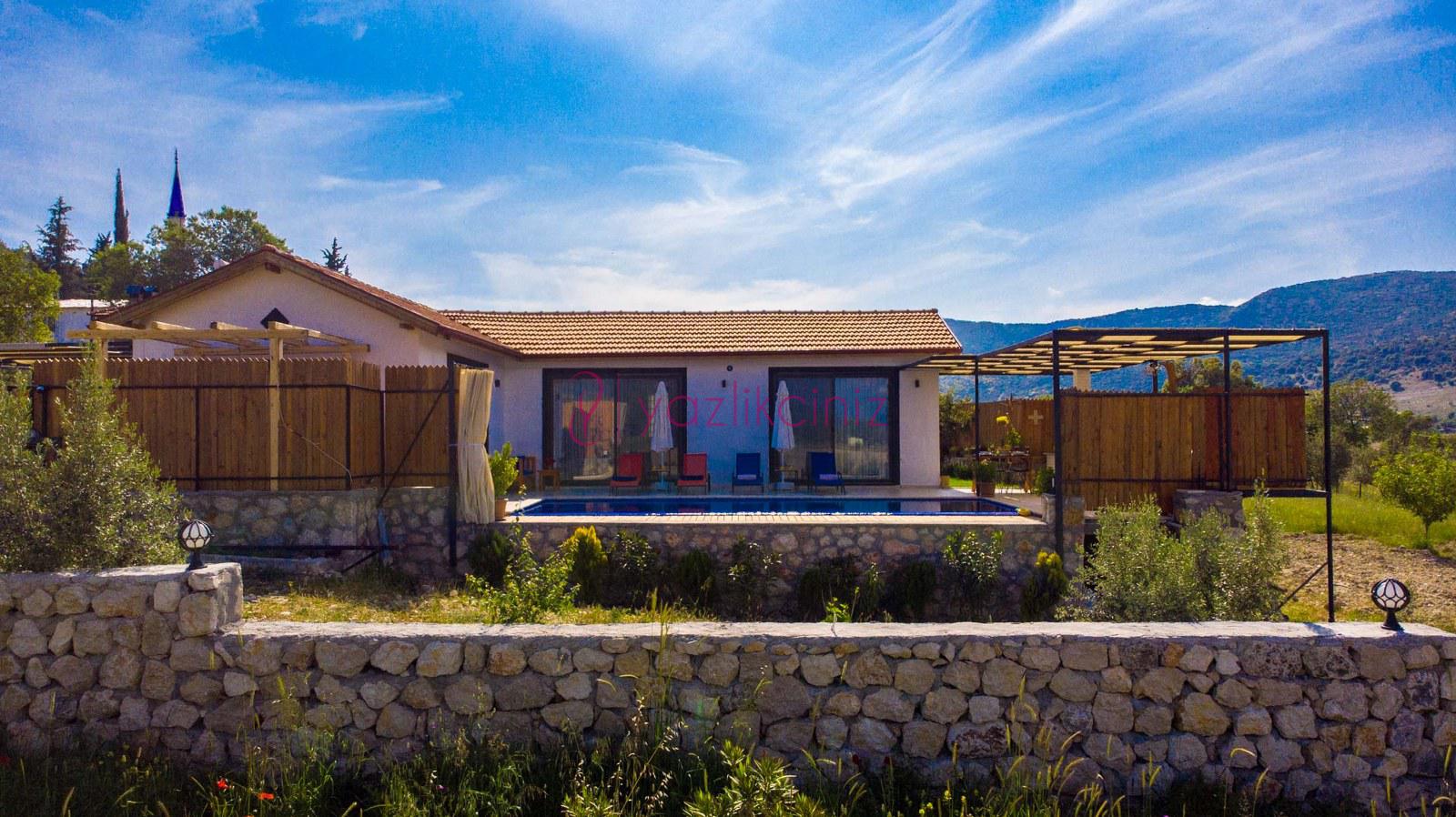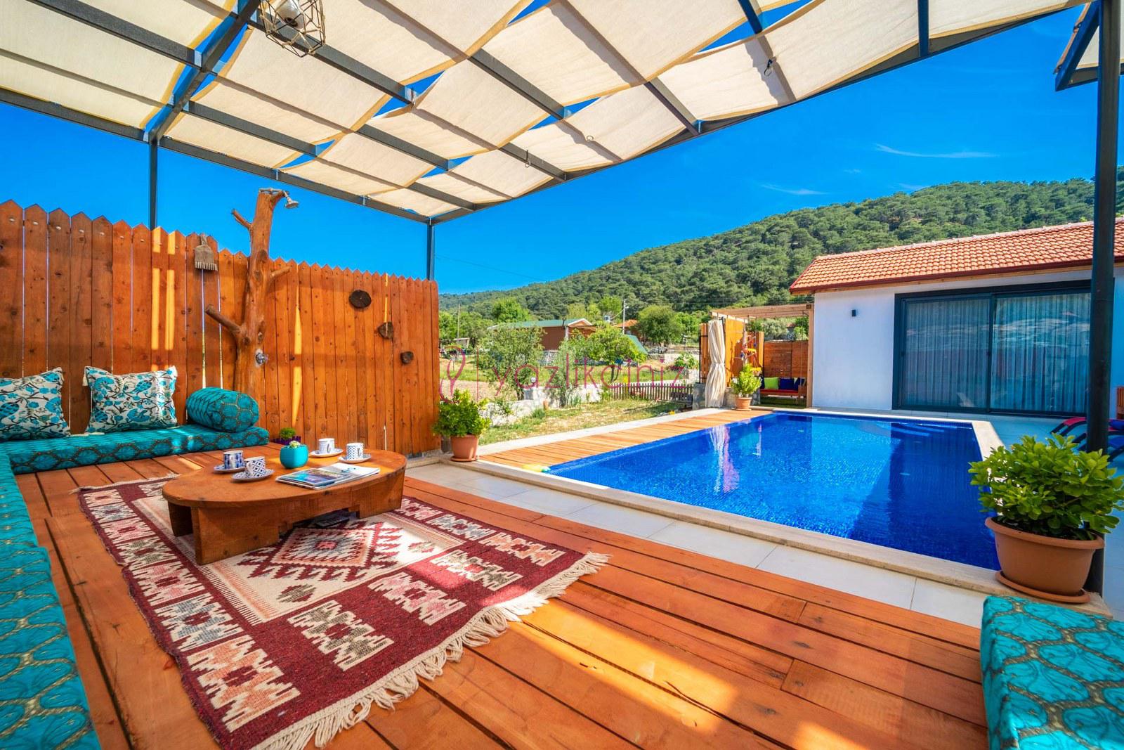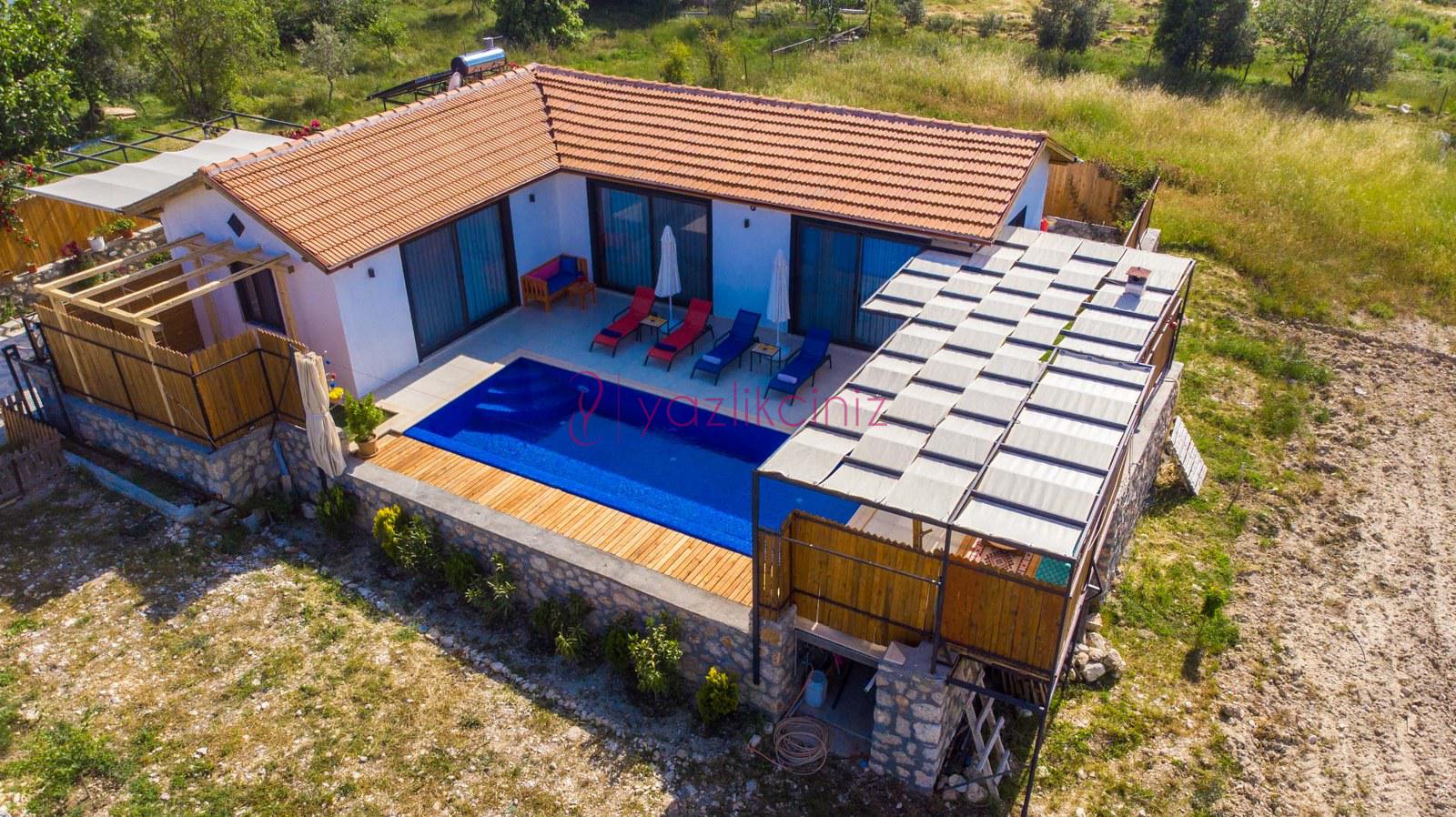 Muhafazakâr doğa içerisinde korunaklı havuzlu kiralık villa,4 kişilik 2 yatak odalı