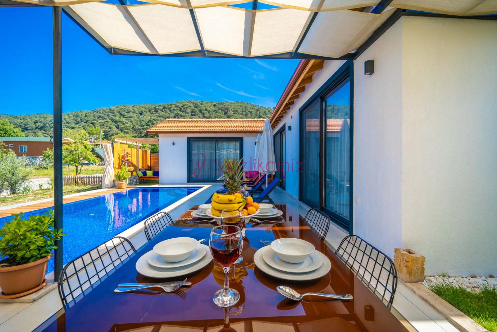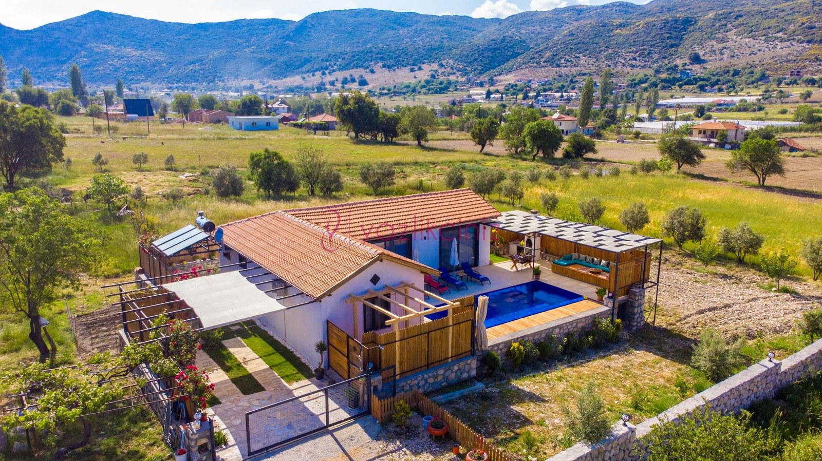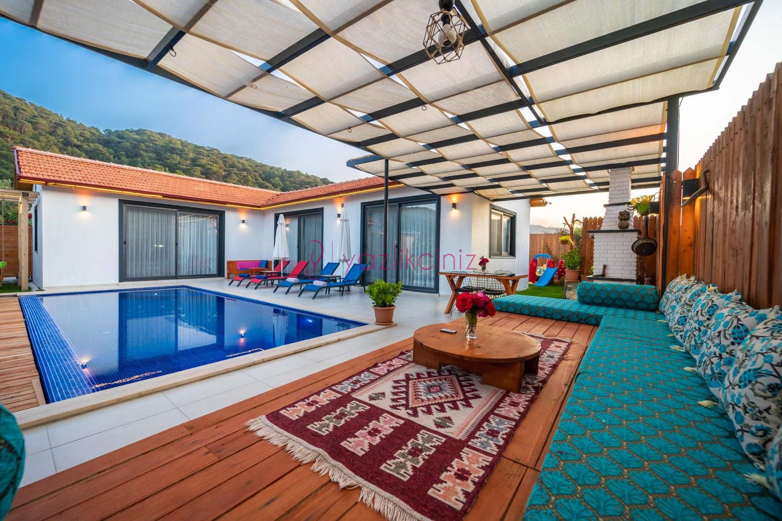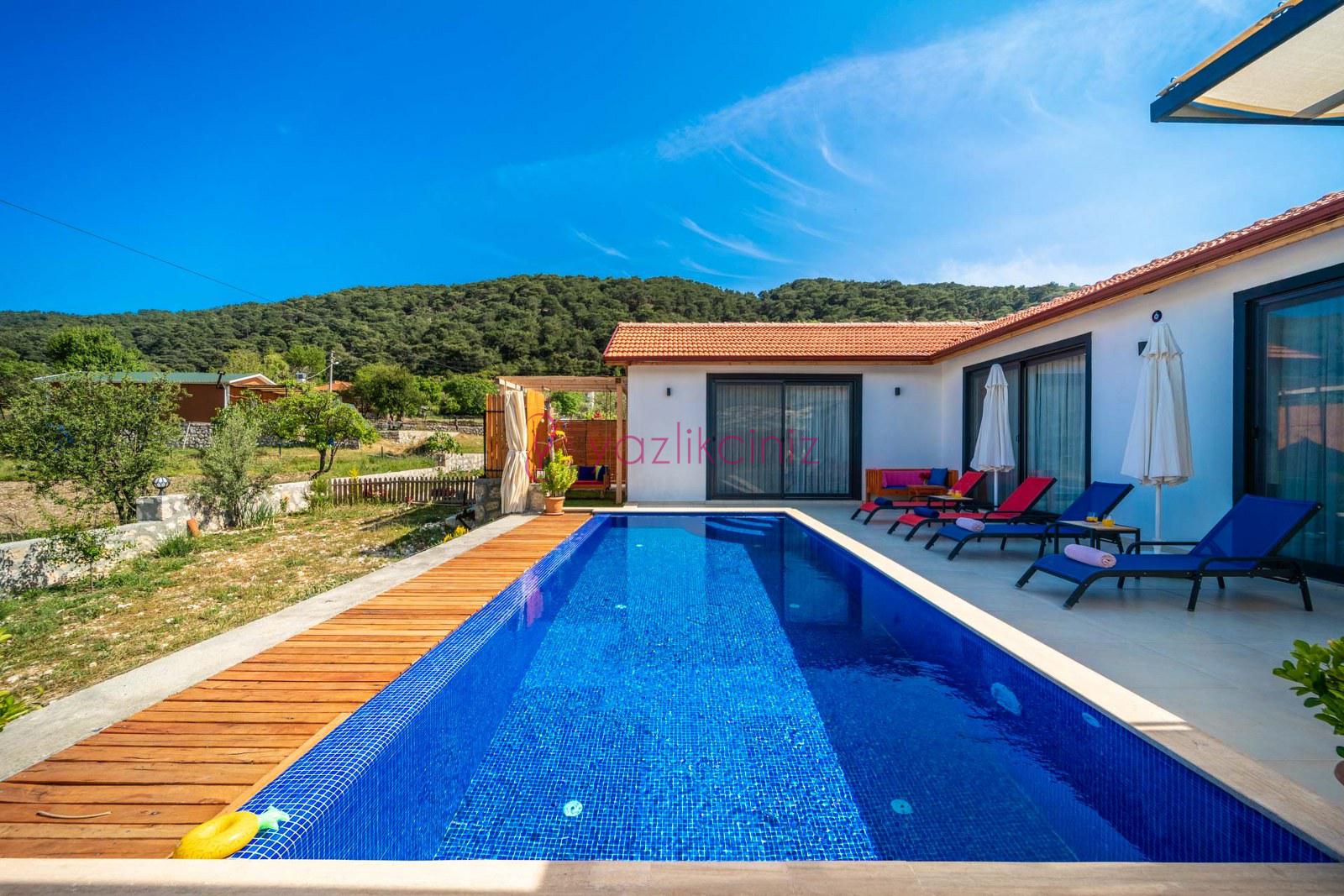 Muhafazakâr doğa içerisinde korunaklı havuzlu kiralık villa,4 kişilik 2 yatak odalı