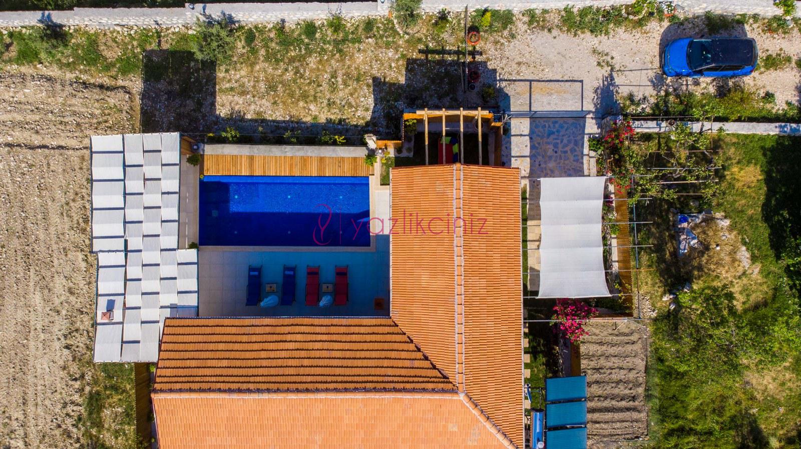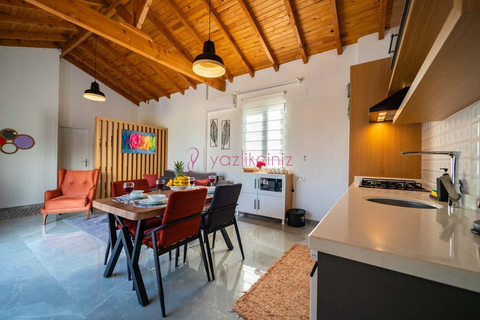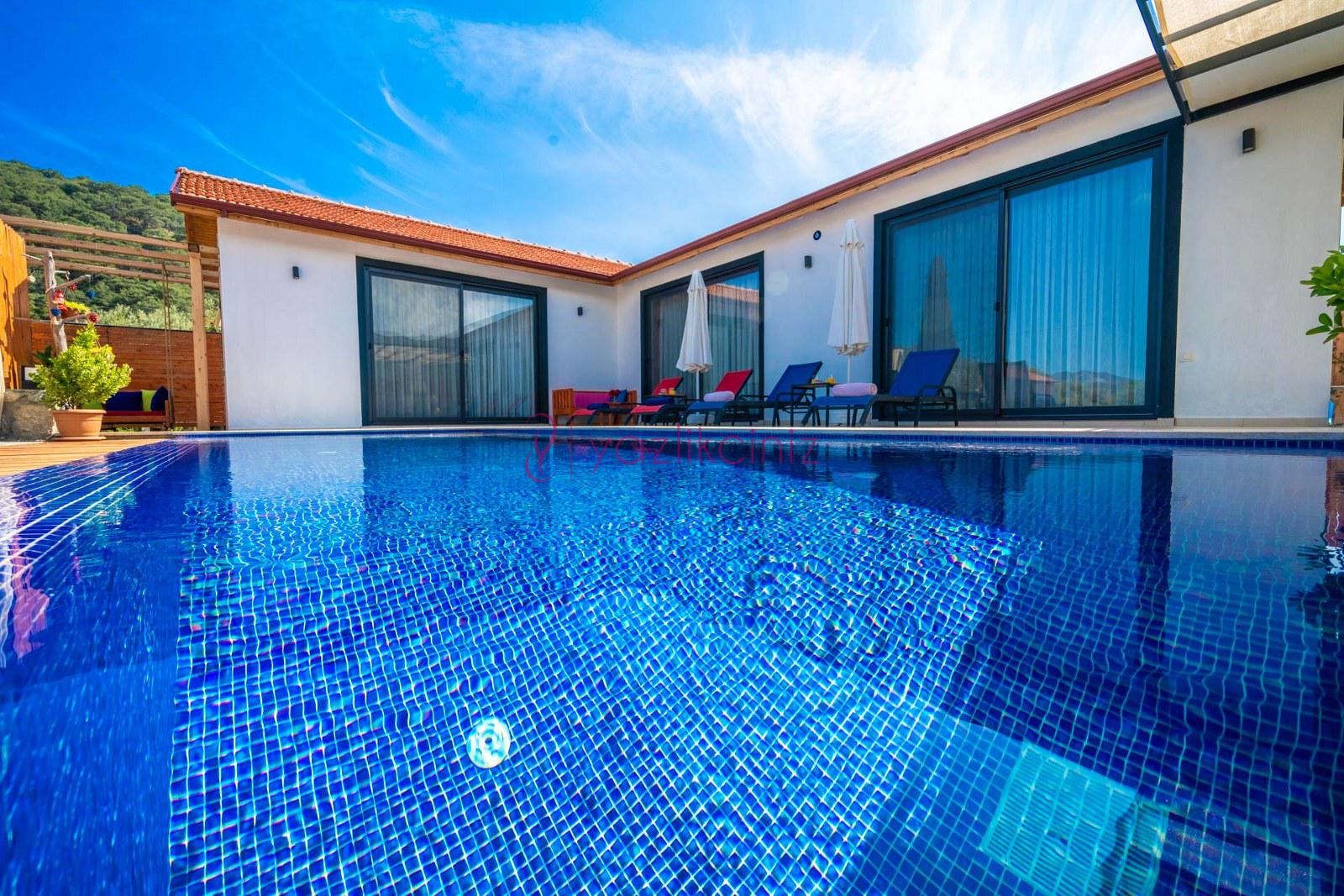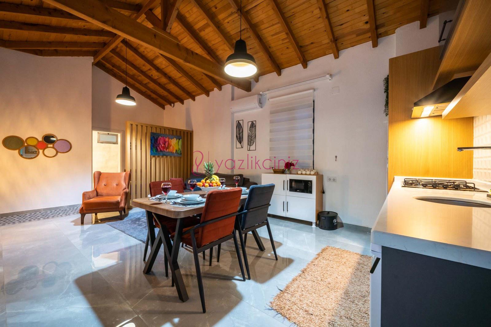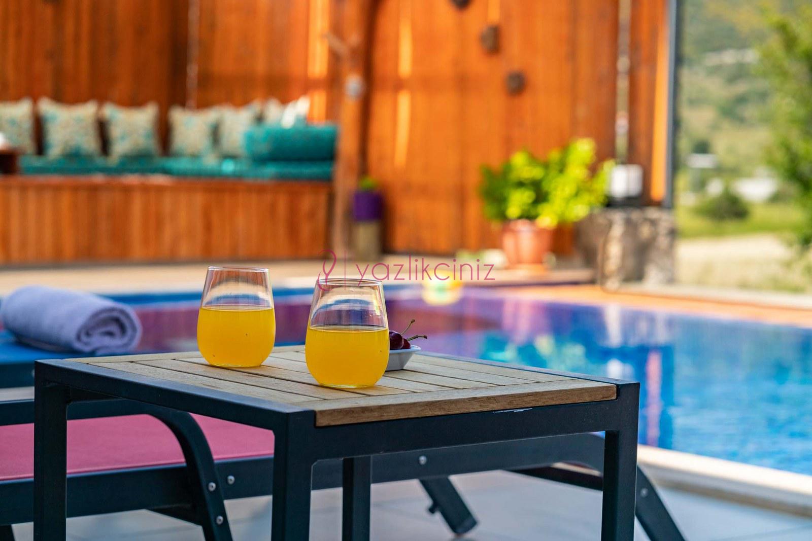 Muhafazakâr doğa içerisinde korunaklı havuzlu kiralık villa,4 kişilik 2 yatak odalı
