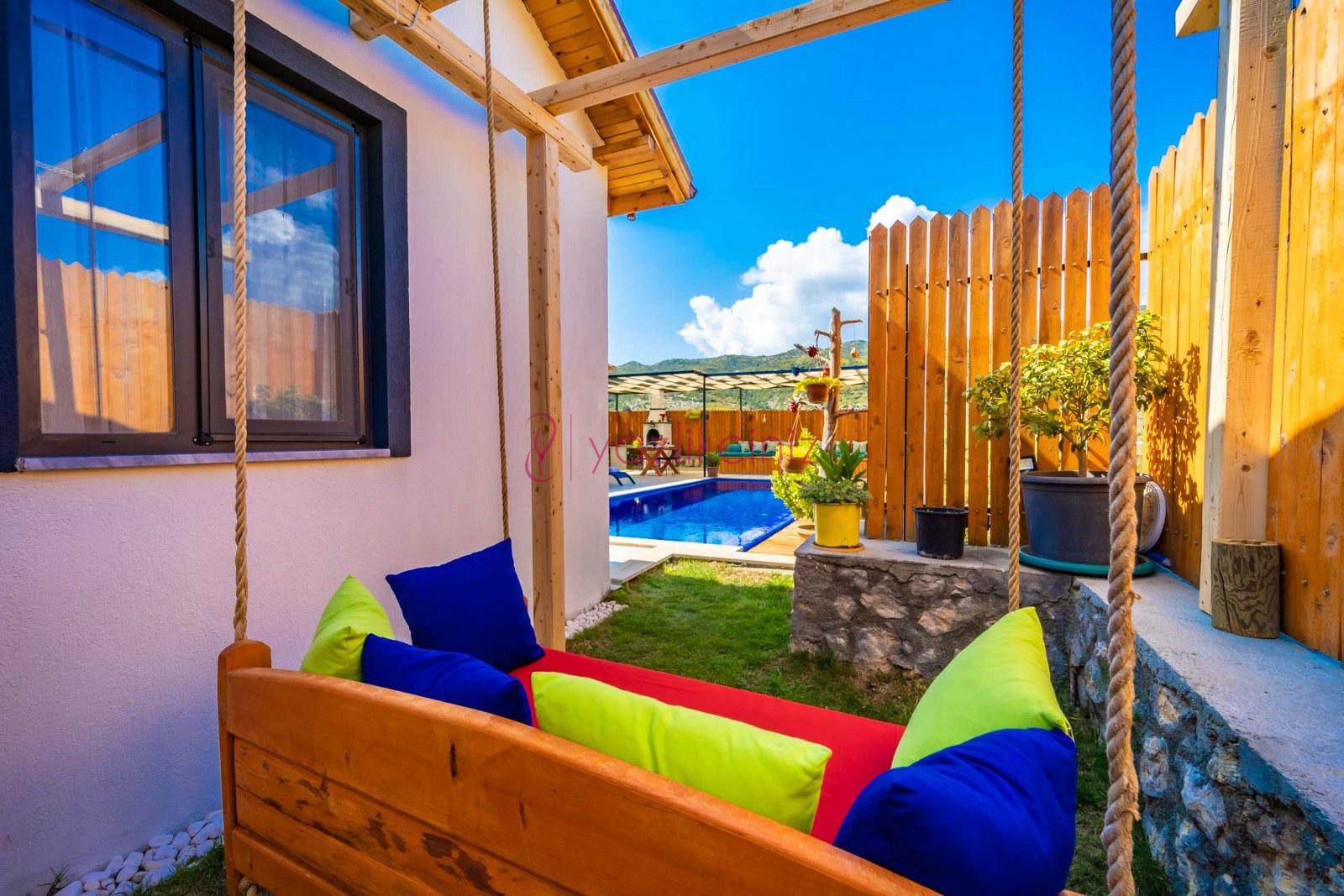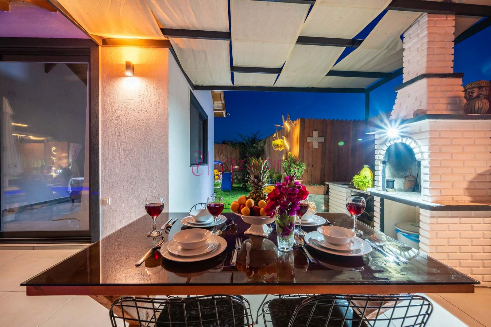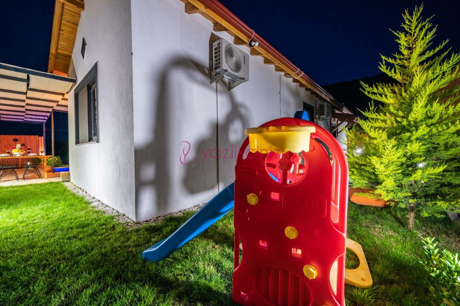 Havuz başında ve geniş bahçede, bahçe mobilyası, şezlong, şemsiye, masa, sandalye, barbekü, çocuk oyun alanı, salıncak, çardak bulunmaktadır.