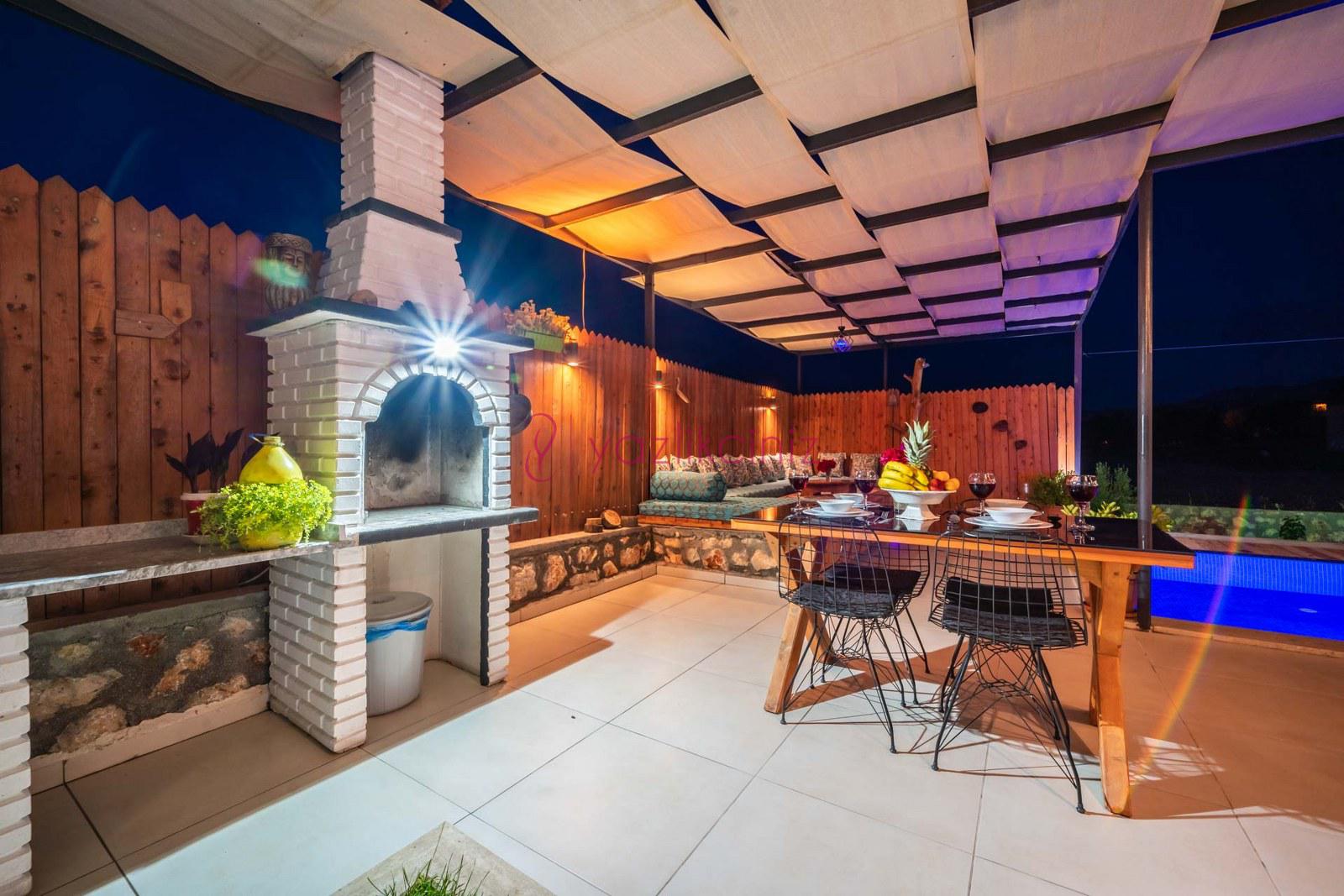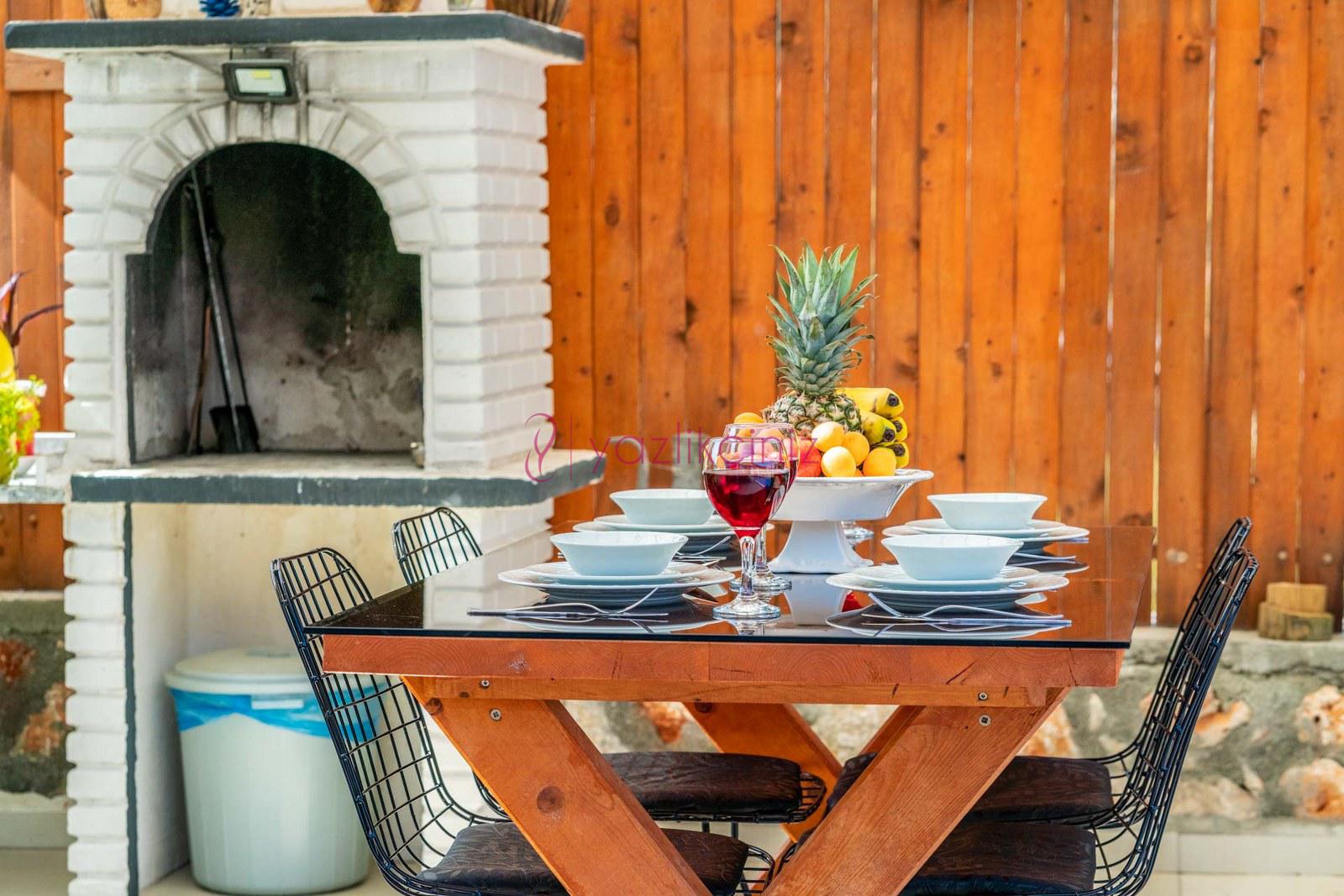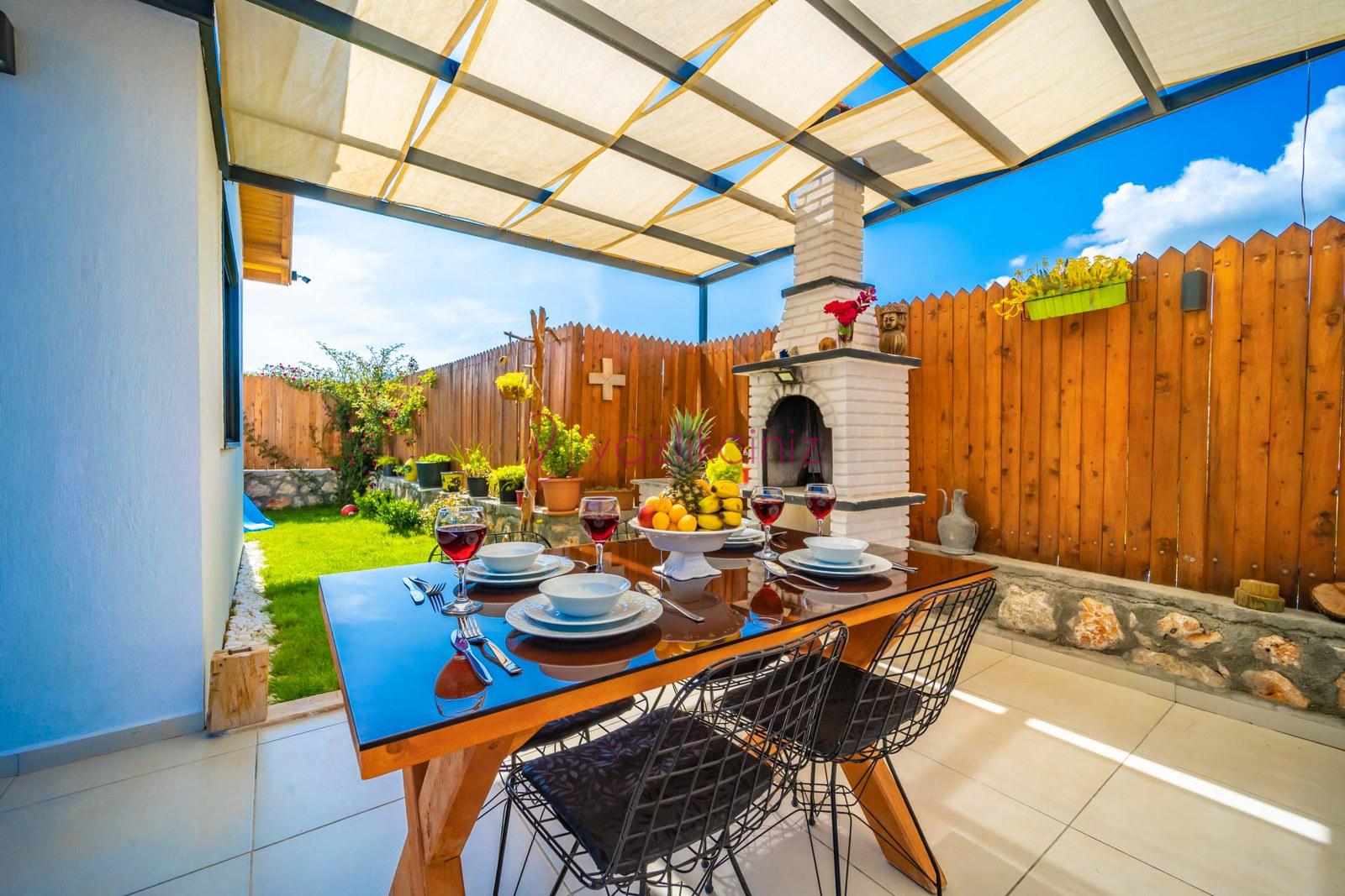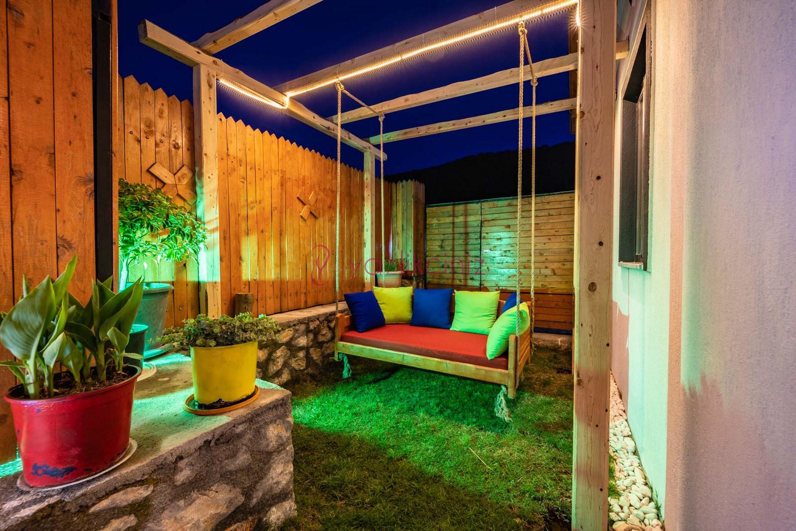 Havuz başında ve geniş bahçede, bahçe mobilyası, şezlong, şemsiye, masa, sandalye, barbekü, çocuk oyun alanı, salıncak, çardak bulunmaktadır.
