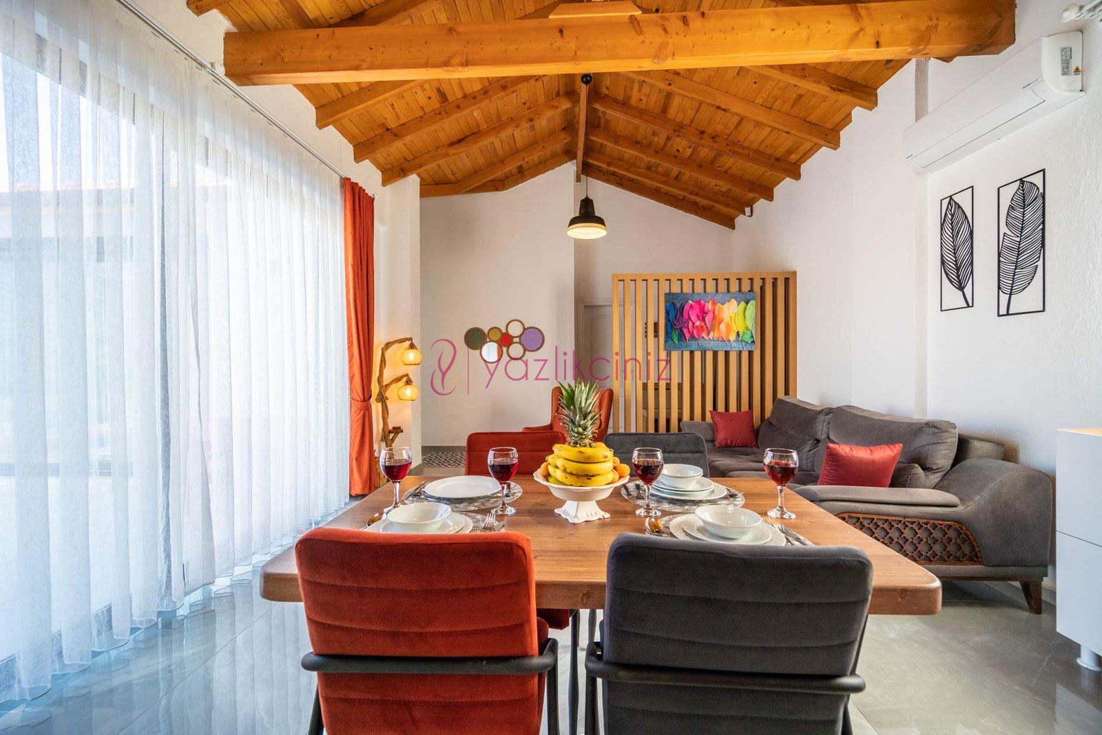 Salonunda oturma grubu, televizyon, uydu alıcısı, klima, yemek masası, ütü ve ütü masası ve havuz başına çıkış bulunmaktadır.