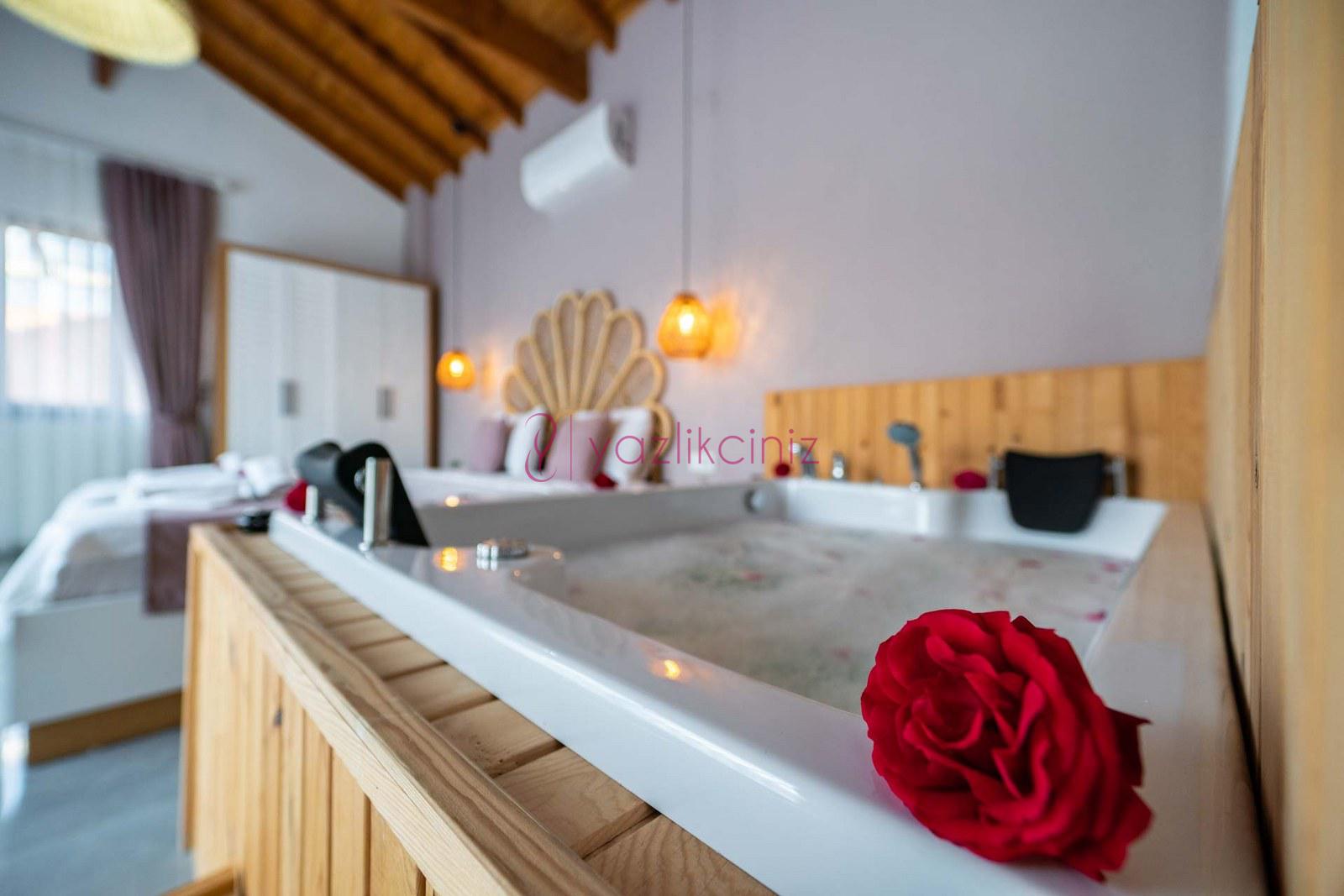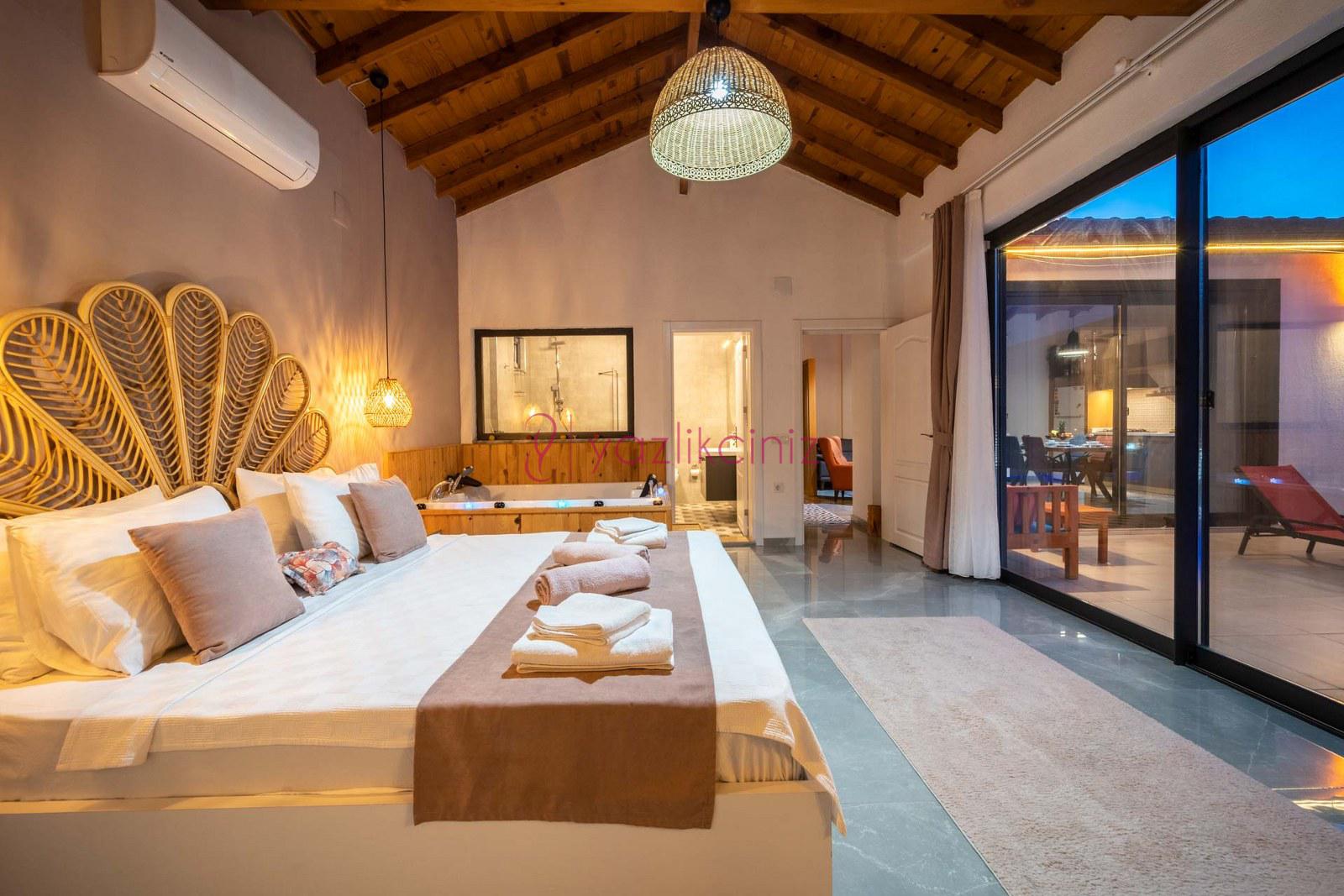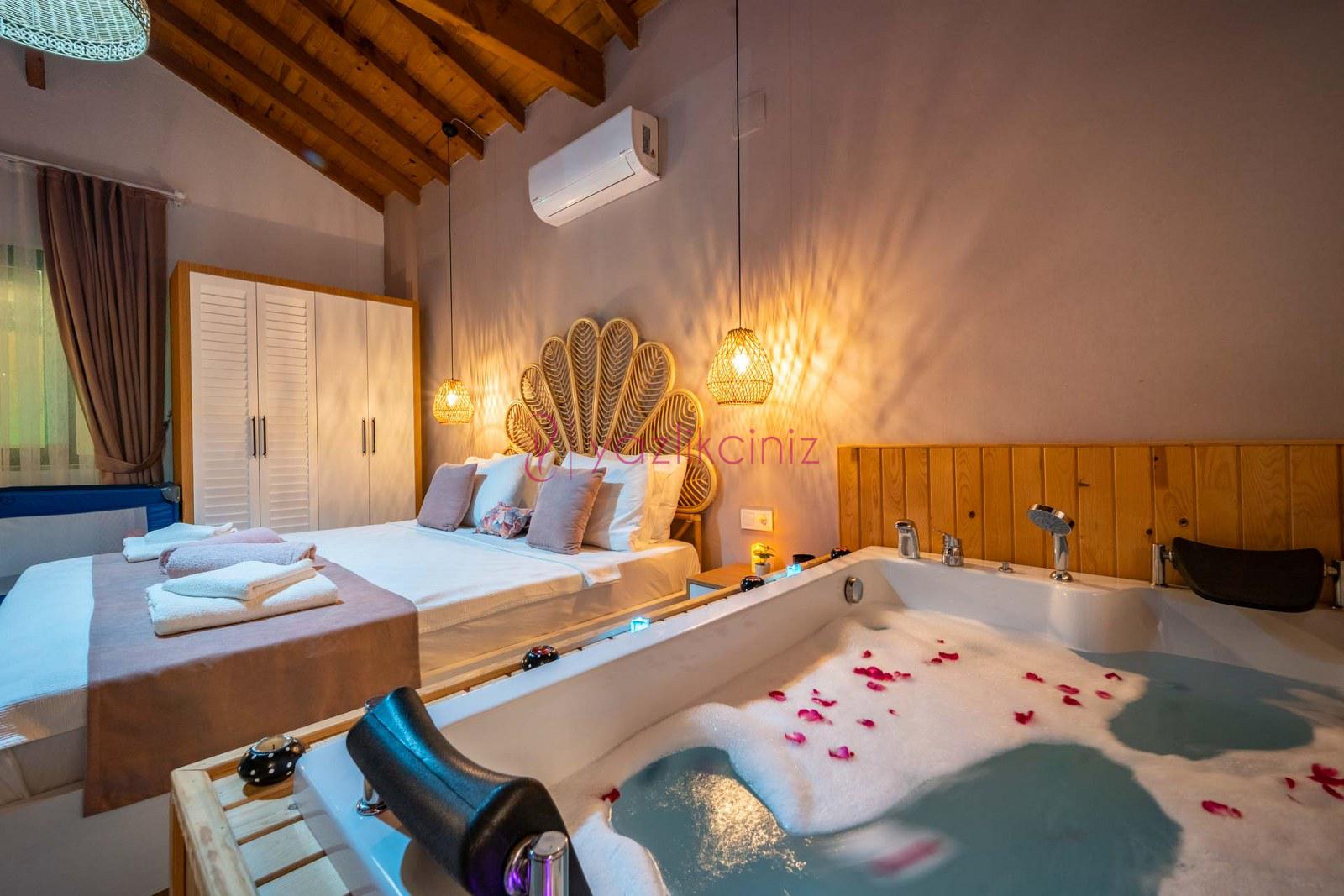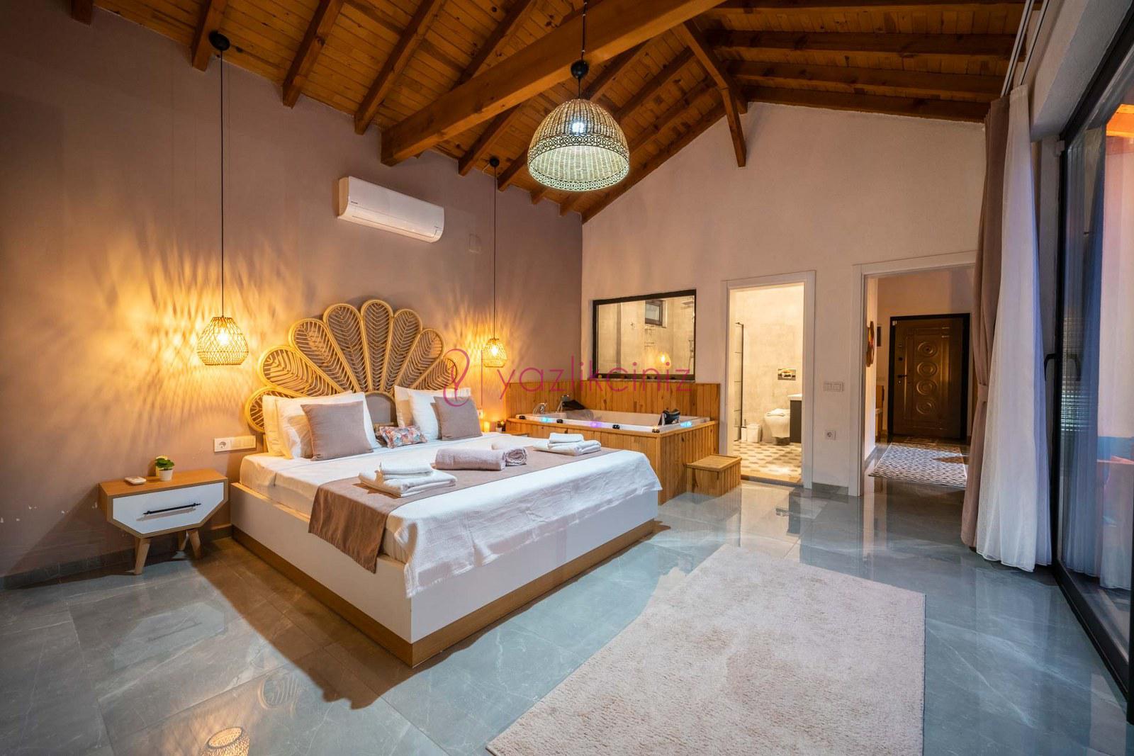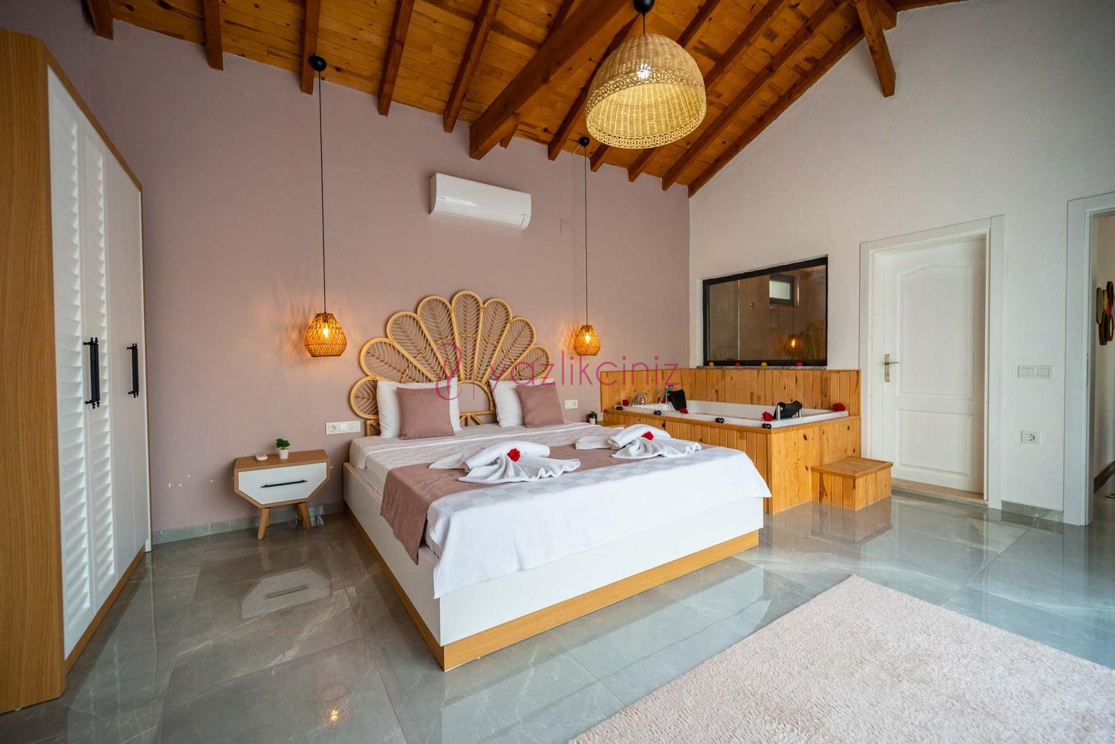 1.Yatak Odası: En-süit odada çift kişilik yatak, makyaj masası, komodin, klima, jakuzi, banyo ve lavabo, bulunmaktadır.