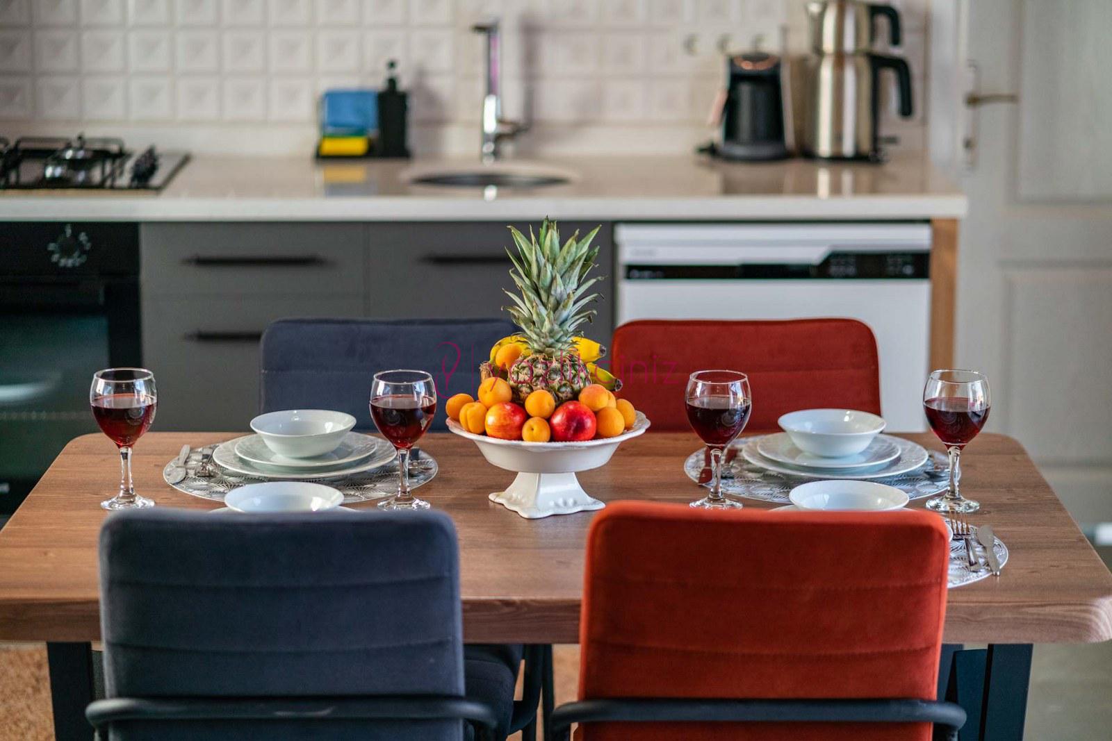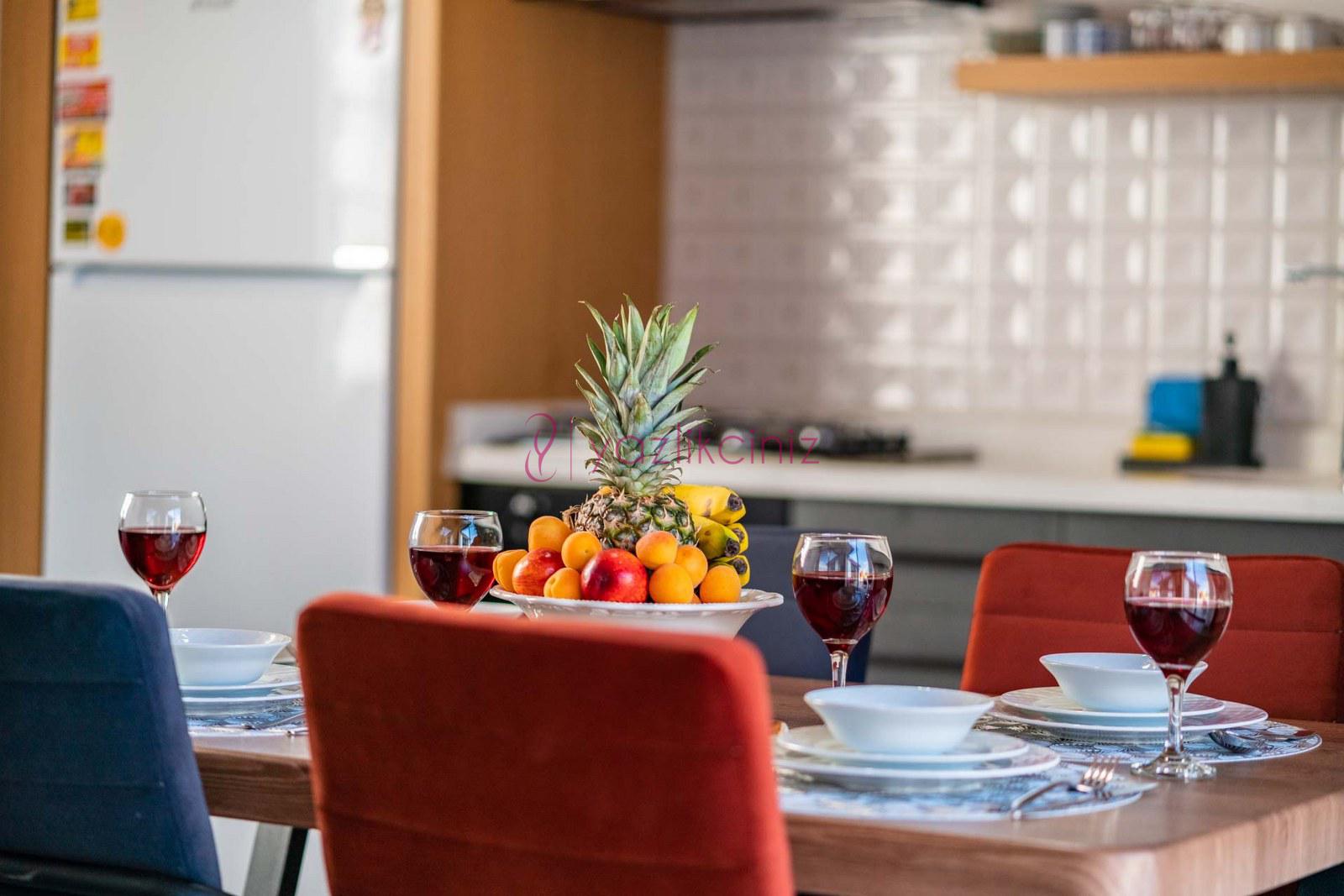 Modern dizayn edilmiş mutfakta, buzdolabı, çamaşır makinesi, bulaşık makinesi, elektrikli su ısıtıcı, mikrodalga fırın, ankastre fırın, 4 lü ocak ve havuz başına çıkış bulunmaktadır.