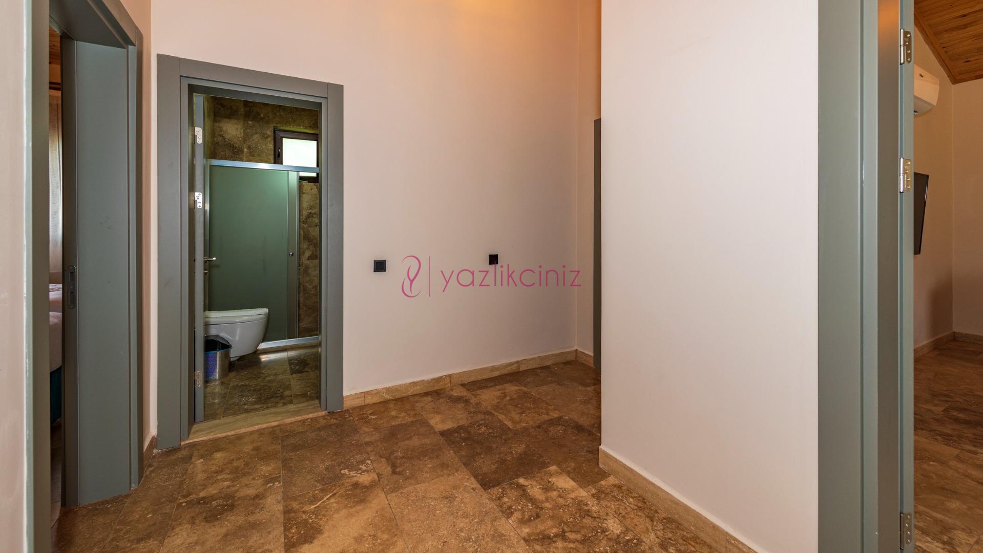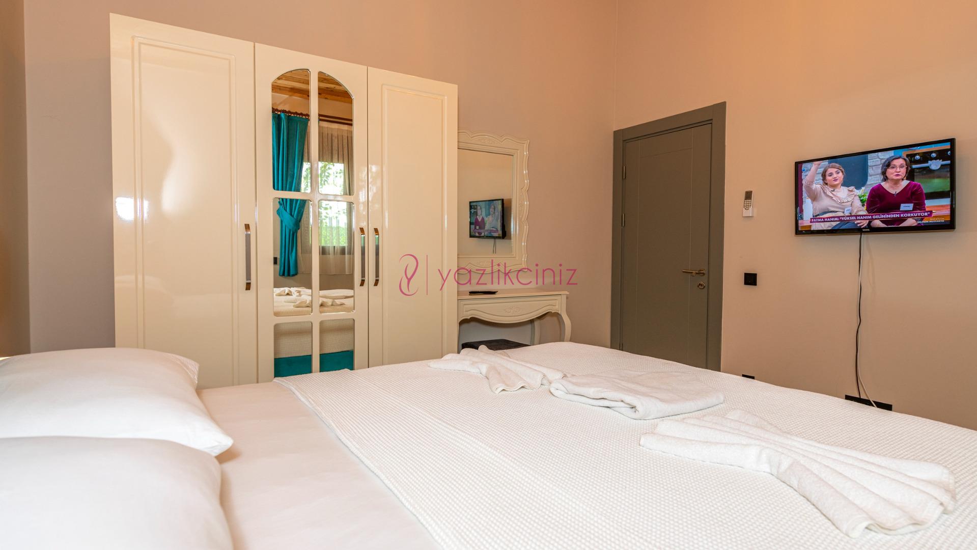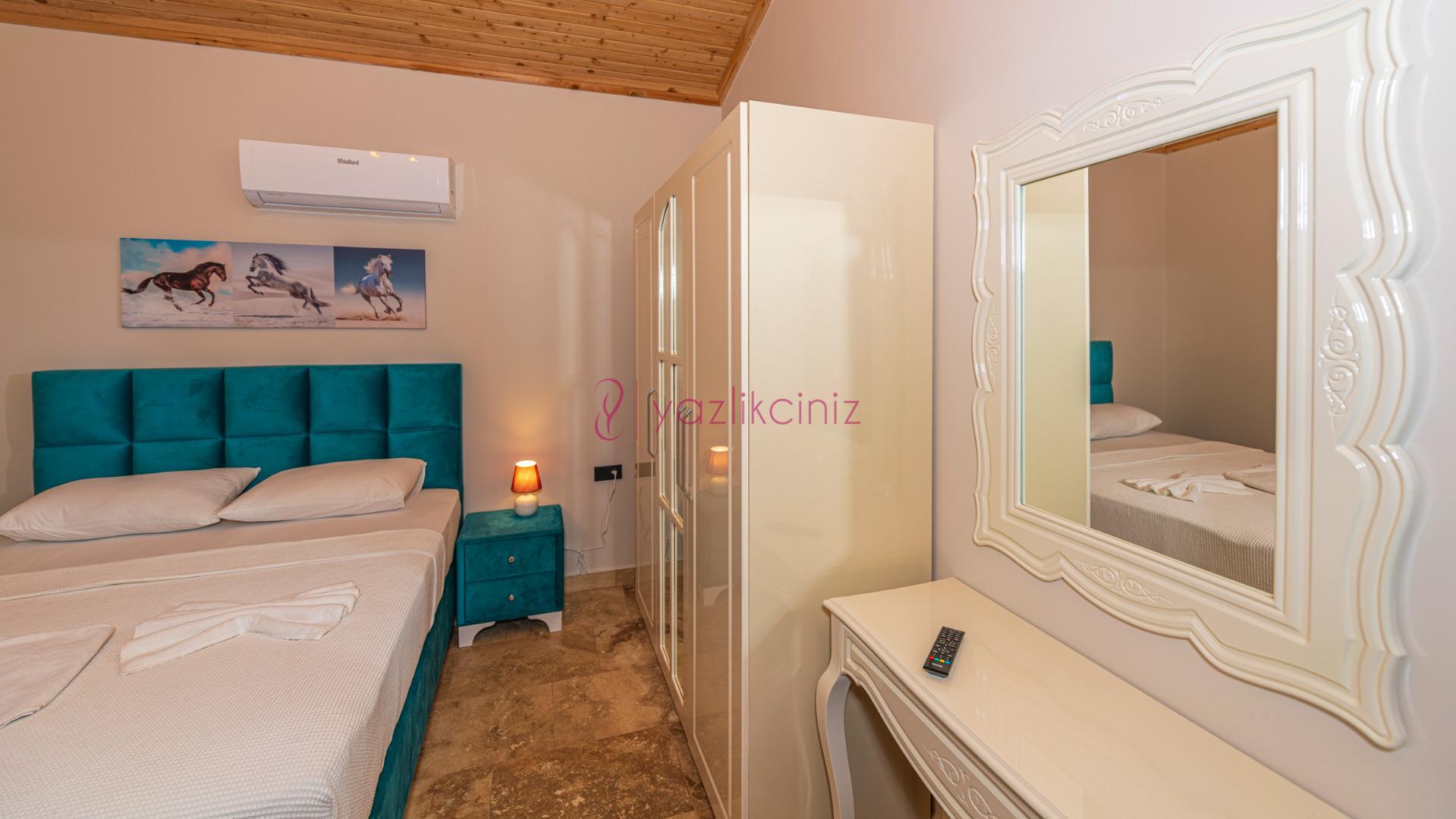 Yatak odası 1: Çift kişilik yatak, klima, komodin, elbise dolabı, makyaj masası, banyo ve tuvalet bulunmaktadır.