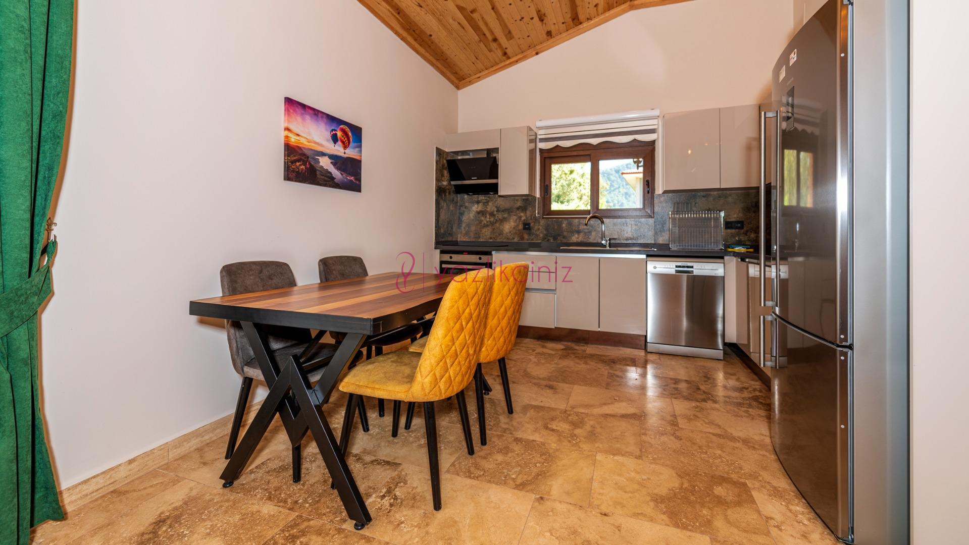 Buzdolabı, çamaşır makinesi, bulaşık makinesi fırın, mikrodalga fırın, 4 lü ocak, ketle, tost makinesi, yemek masası ve 4 kişi için mutfak takımı bulunmaktadır.
