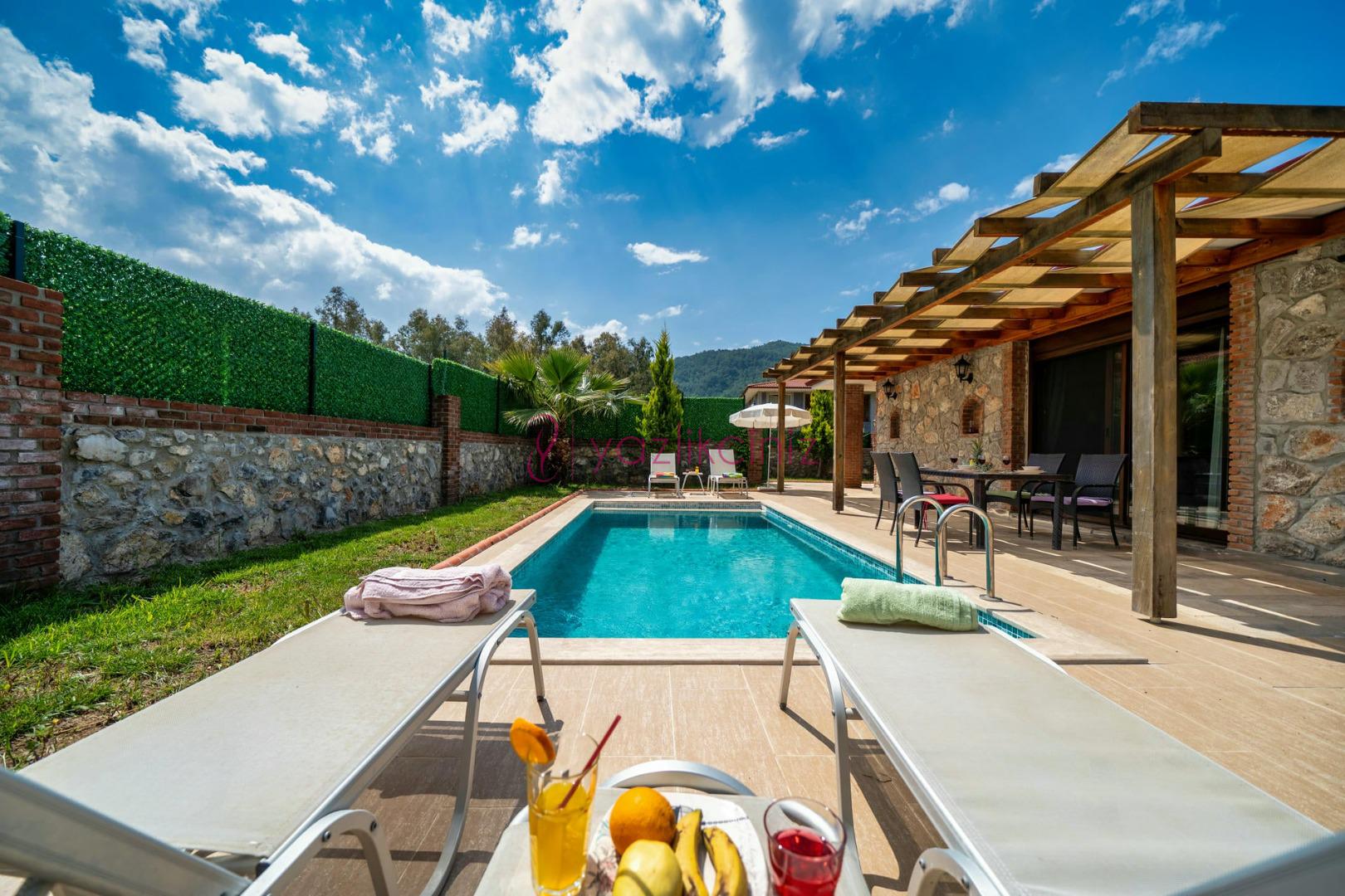 Villanın güneşlenme terası ve havuzun dış taraftan görünmemesi için gerekli önlemler alınmıştır, fakat villanın diğer bölümlerinin görünürlüğü kesin olarak garanti edilememektedir.