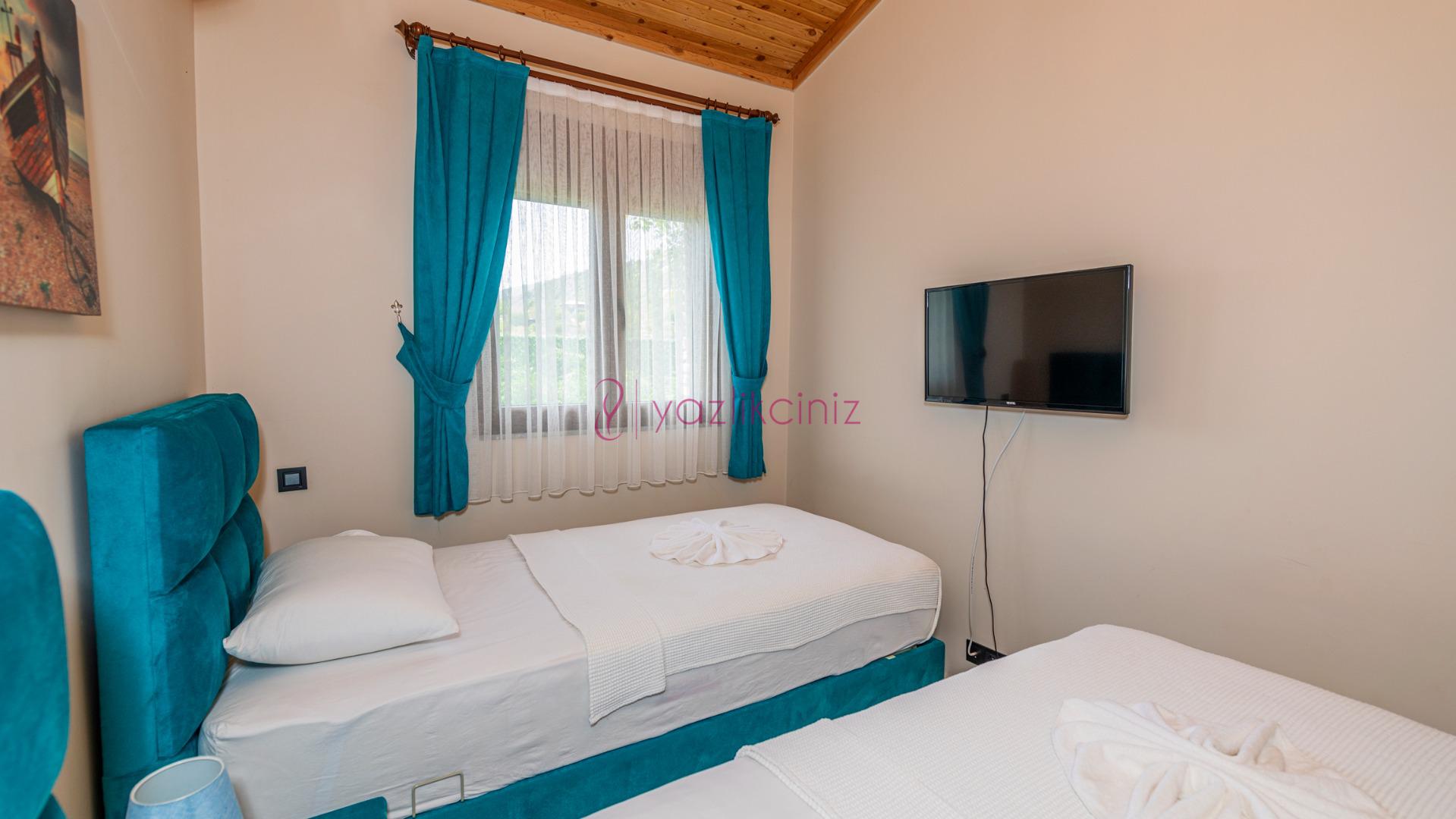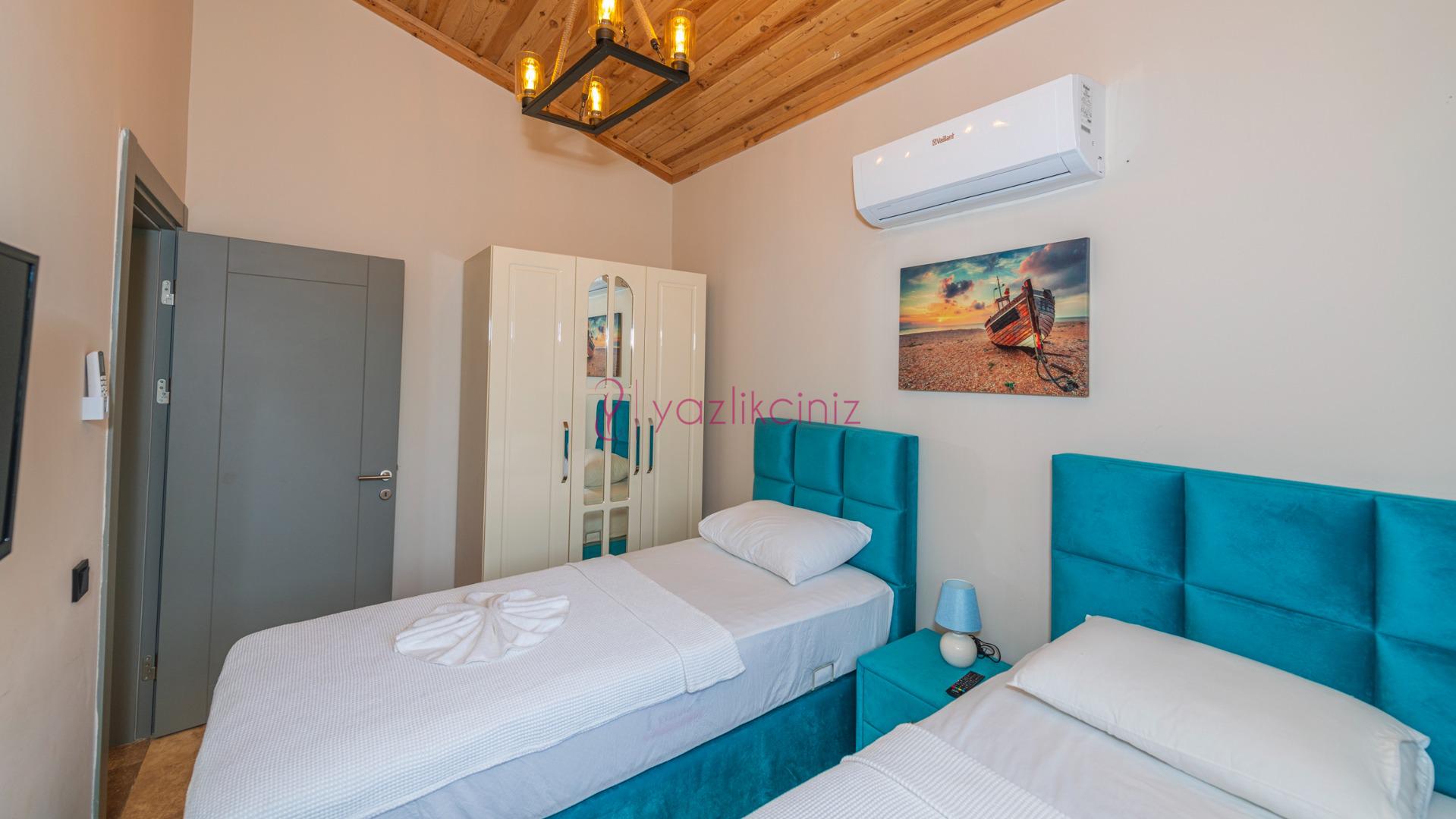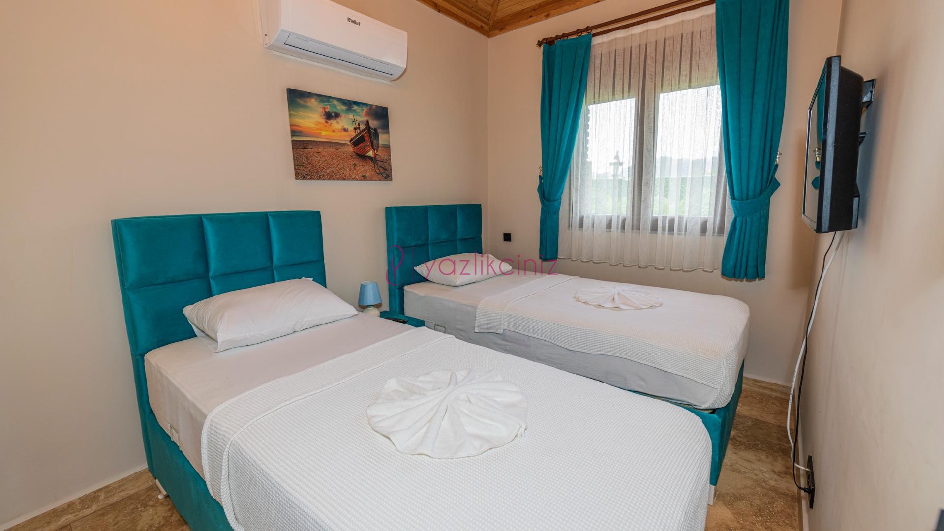Yatak odası 2: 2 Adet tek kişilik yatak, klima, komodin, elbise dolabı, banyo ve tuvalet bulunmaktadır.