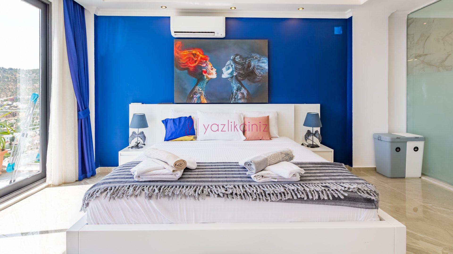 Yatak odası 1: Birinci katta bulunan suit odada çift kişilik yatak, makyaj masası, klima, elbise dolabı, komodin, jakuzi, balkon ve ebeveyn banyosu bulunmaktadır.