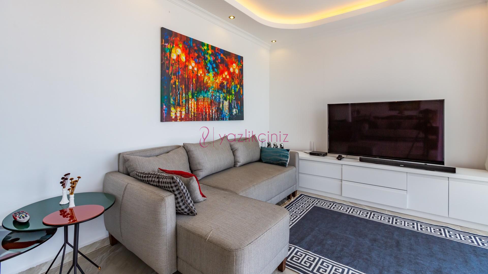 Deniz manzaralı salonunda oturma grubu, plazma TV, uydu alıcısı, klima, lavabo, ütü ve ütü masası ve tuvalet bulunmaktadır.