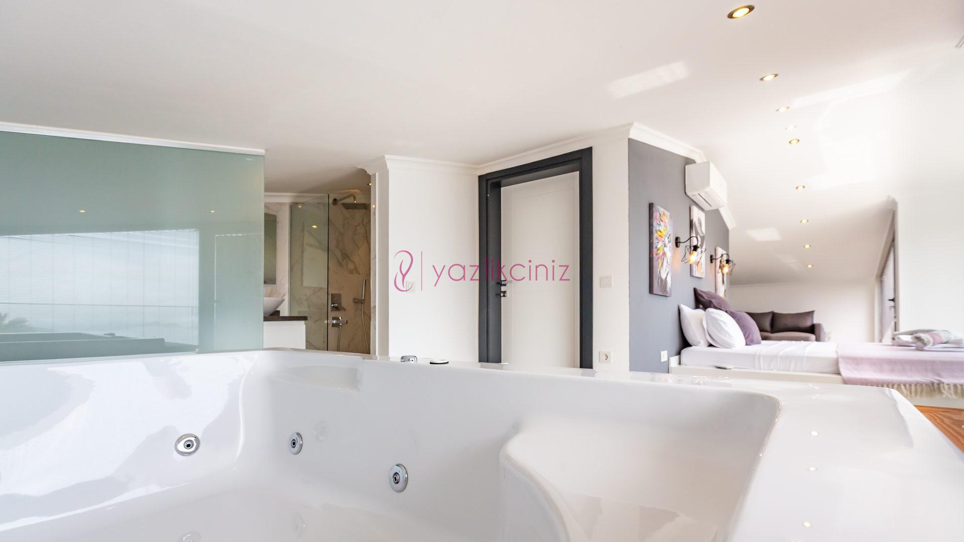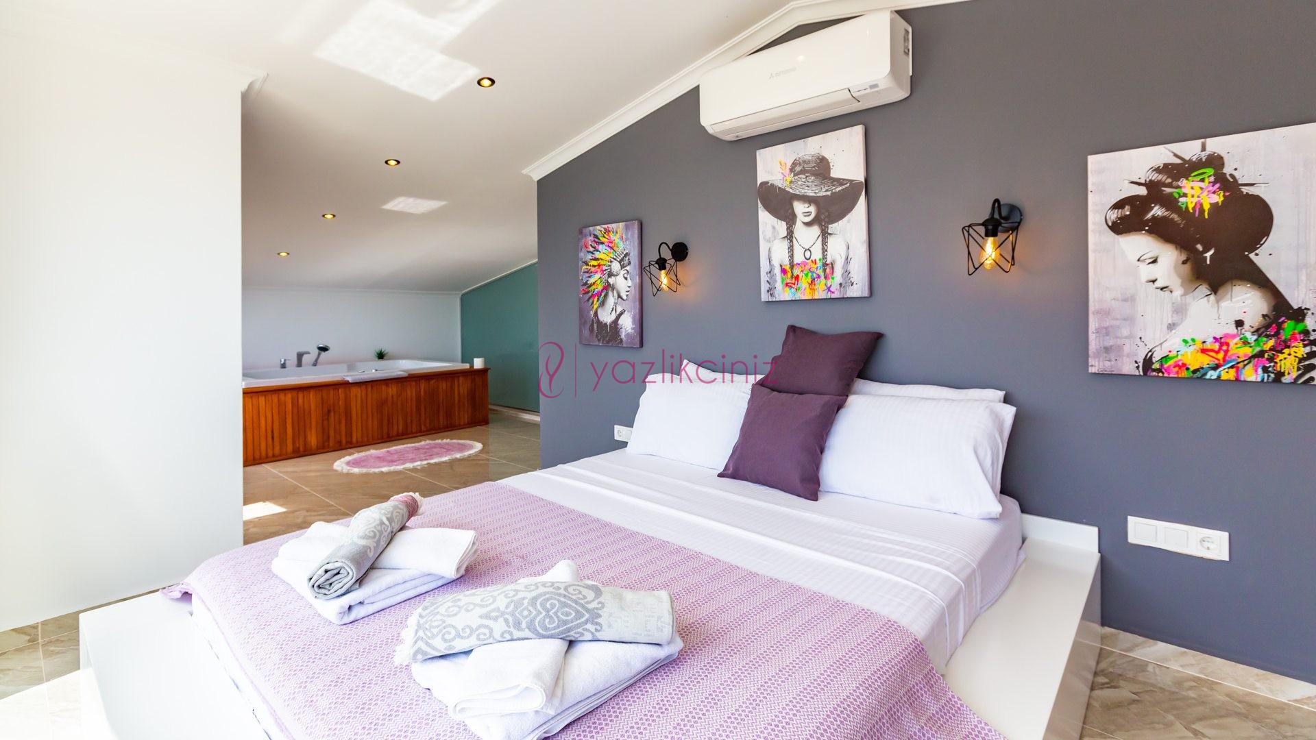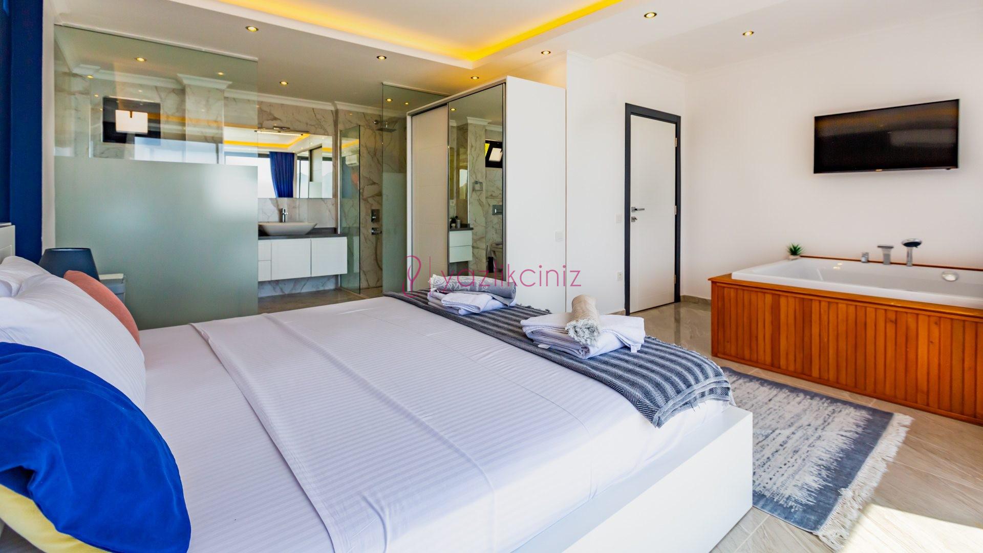 Yatak odası 3: İkinci katta bulunan suit odamızda çift kişilik yatak, makyaj masası, klima, elbise dolabı, komodin, jakuzi, balkon ve ebeveyn banyosu bulunmaktadır.