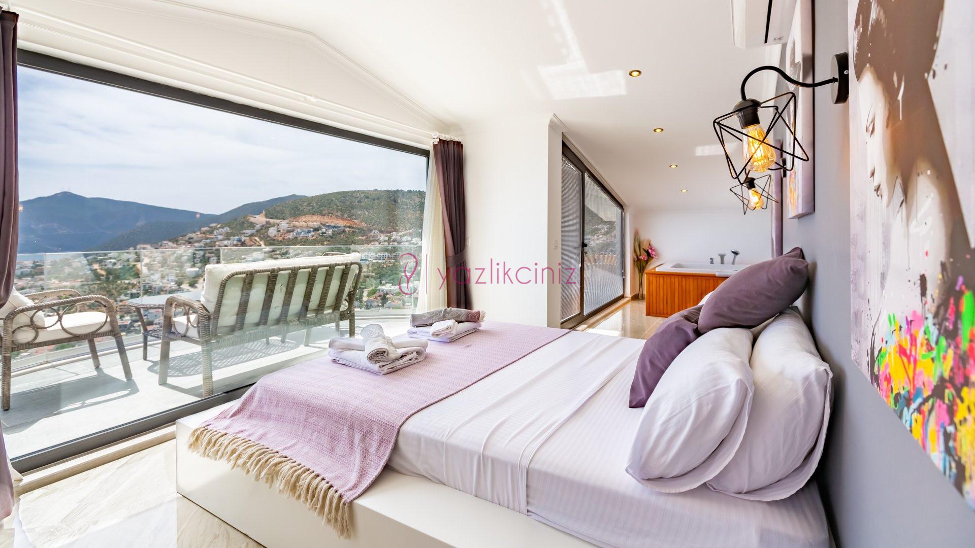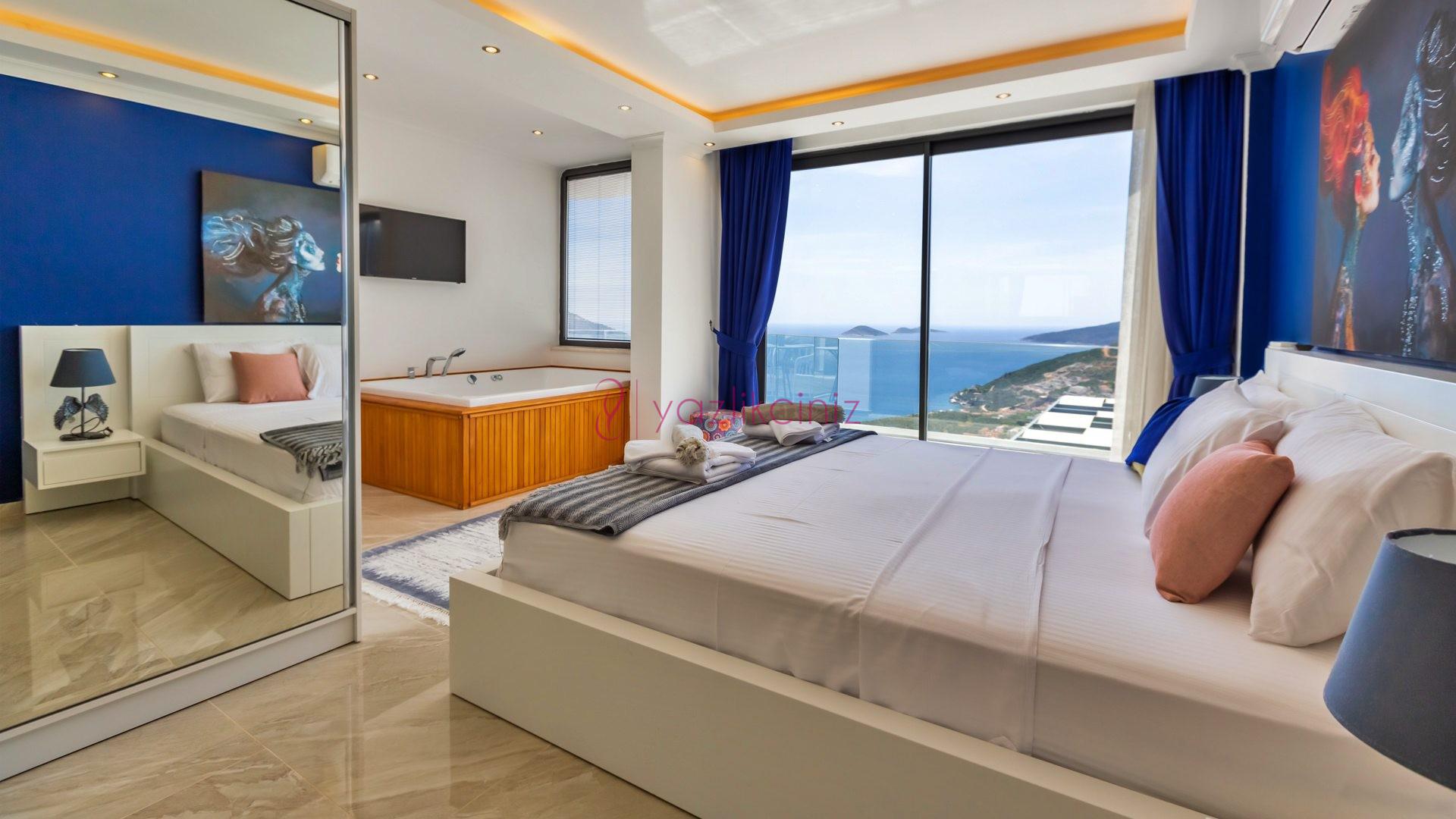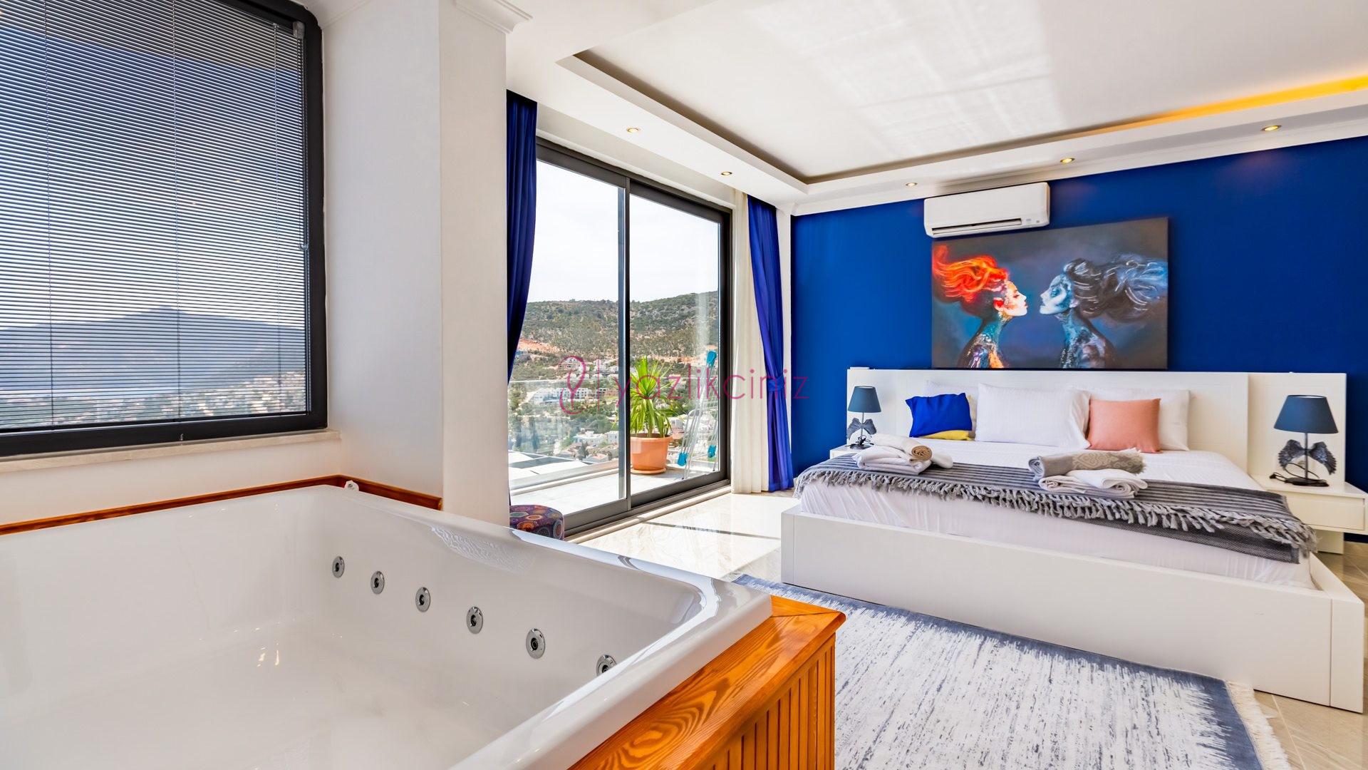 Yatak odası 3: İkinci katta bulunan suit odamızda çift kişilik yatak, makyaj masası, klima, elbise dolabı, komodin, jakuzi, balkon ve ebeveyn banyosu bulunmaktadır.