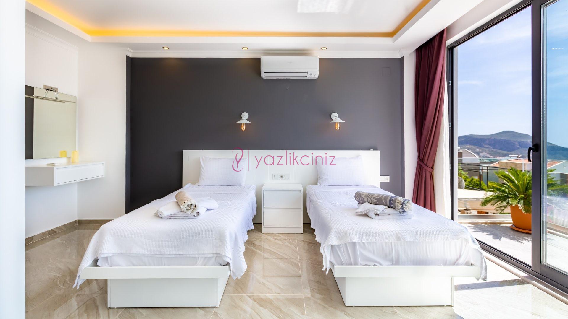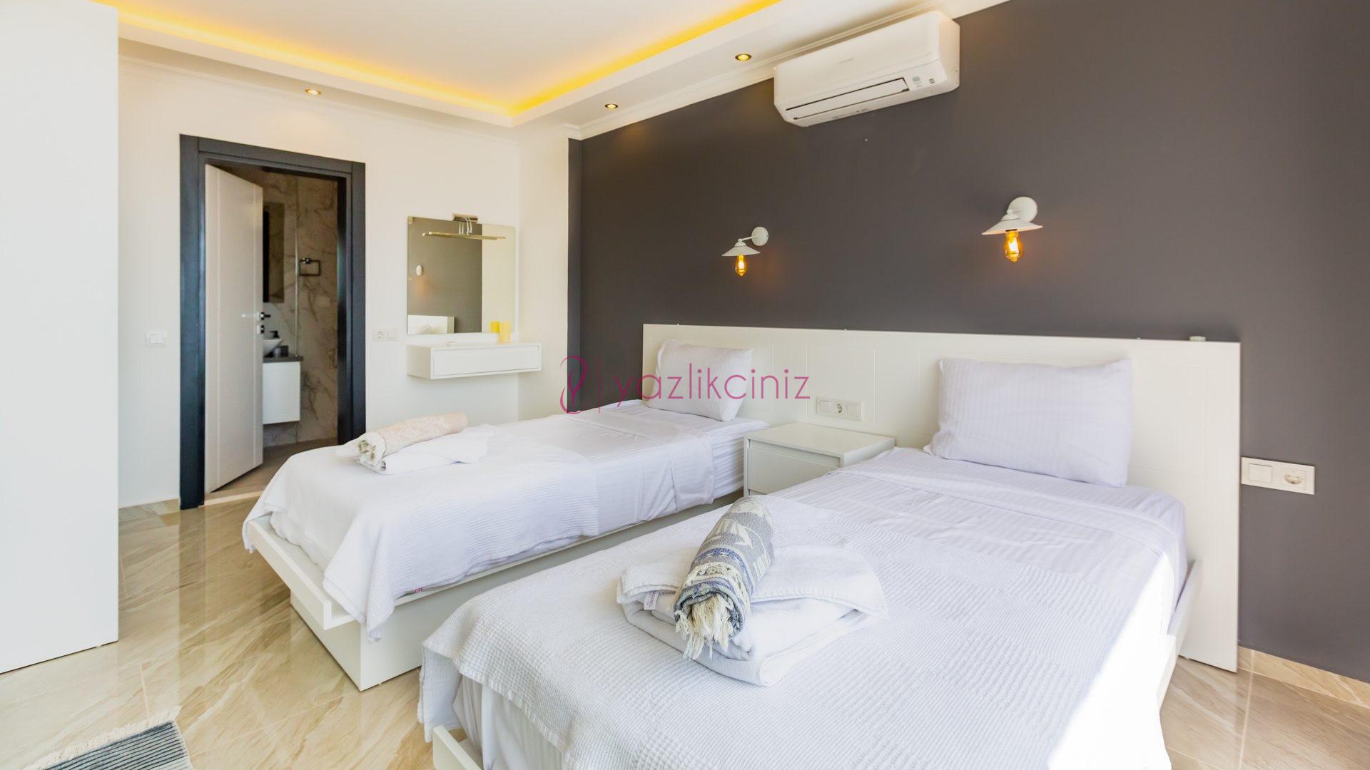 Yatak odası 2: Birinci katta bulunan ikinci suit odamızda 2 adet tek kişilik yatak, makyaj masası, klima, elbise dolabı, komodin, balkon ve ebeveyn banyosu bulunmaktadır.
