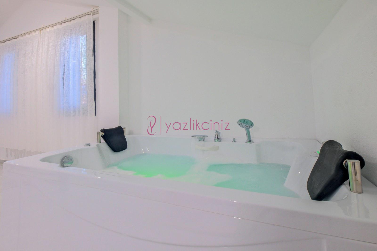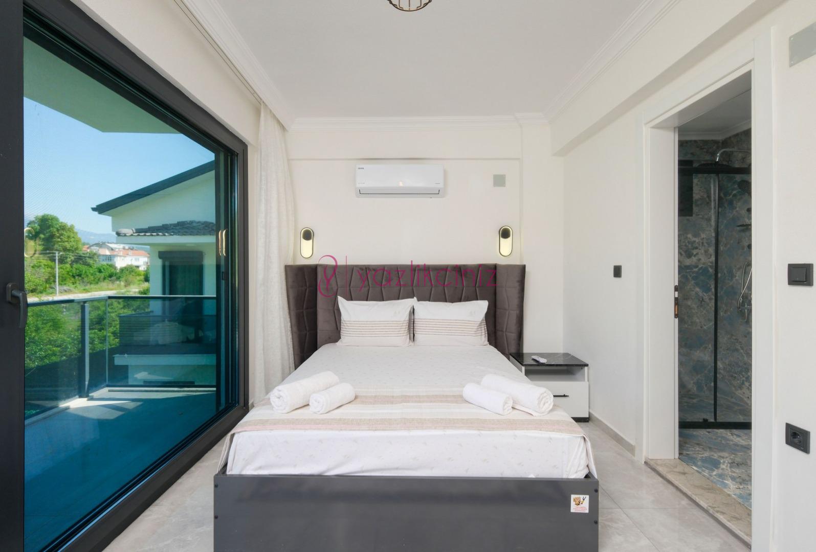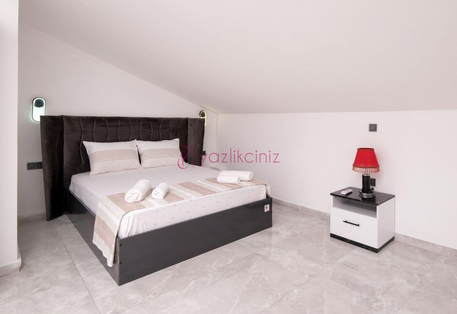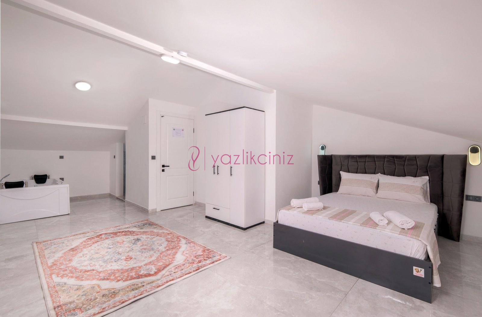 2. Yatak Odası: En süit odada çift kişilik yatak, jakuzi, elbise dolabı,klima, komodin, televizyon, tuvalet ve banyo bulunmaktadır.