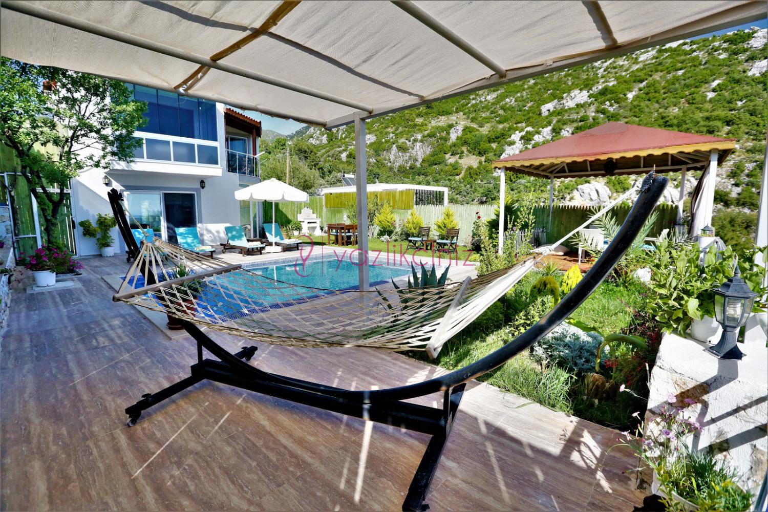 Havuz terasında özel yüzme havuzu, şezlonglar, güneş şemsiyesi, masa ve sandalyeler, tas barbekü bulunmaktadır.