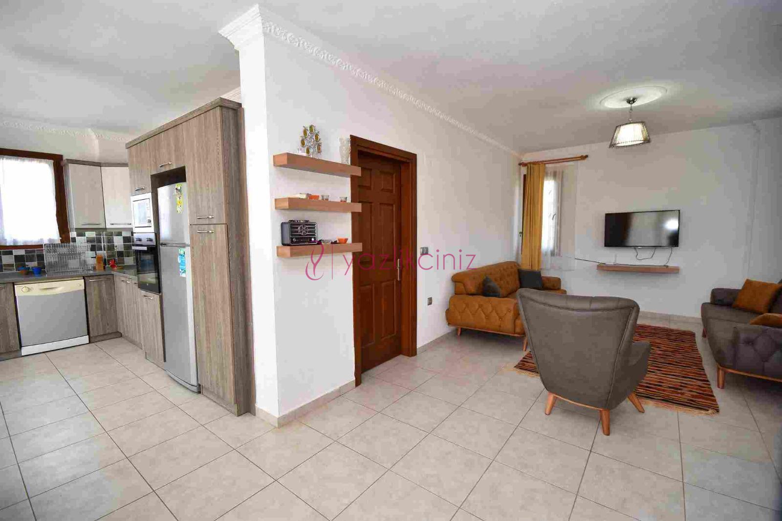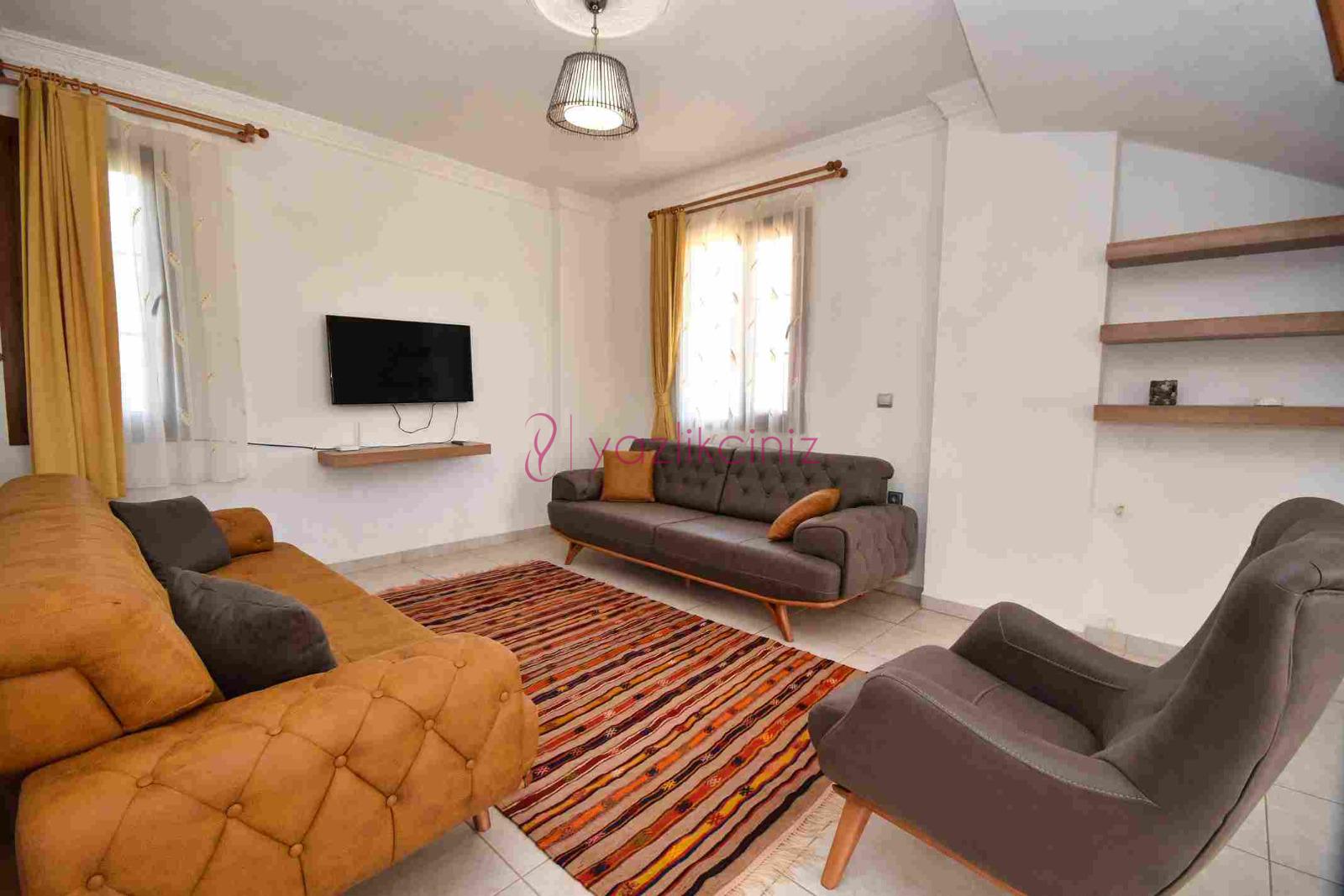 Oturma grubu, televizyon, orta sehpa, yemek masası, klima, havuz terasına çıkış bulunmaktadır.