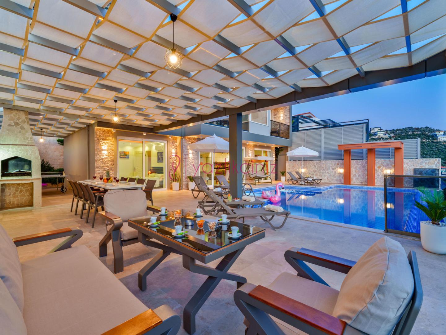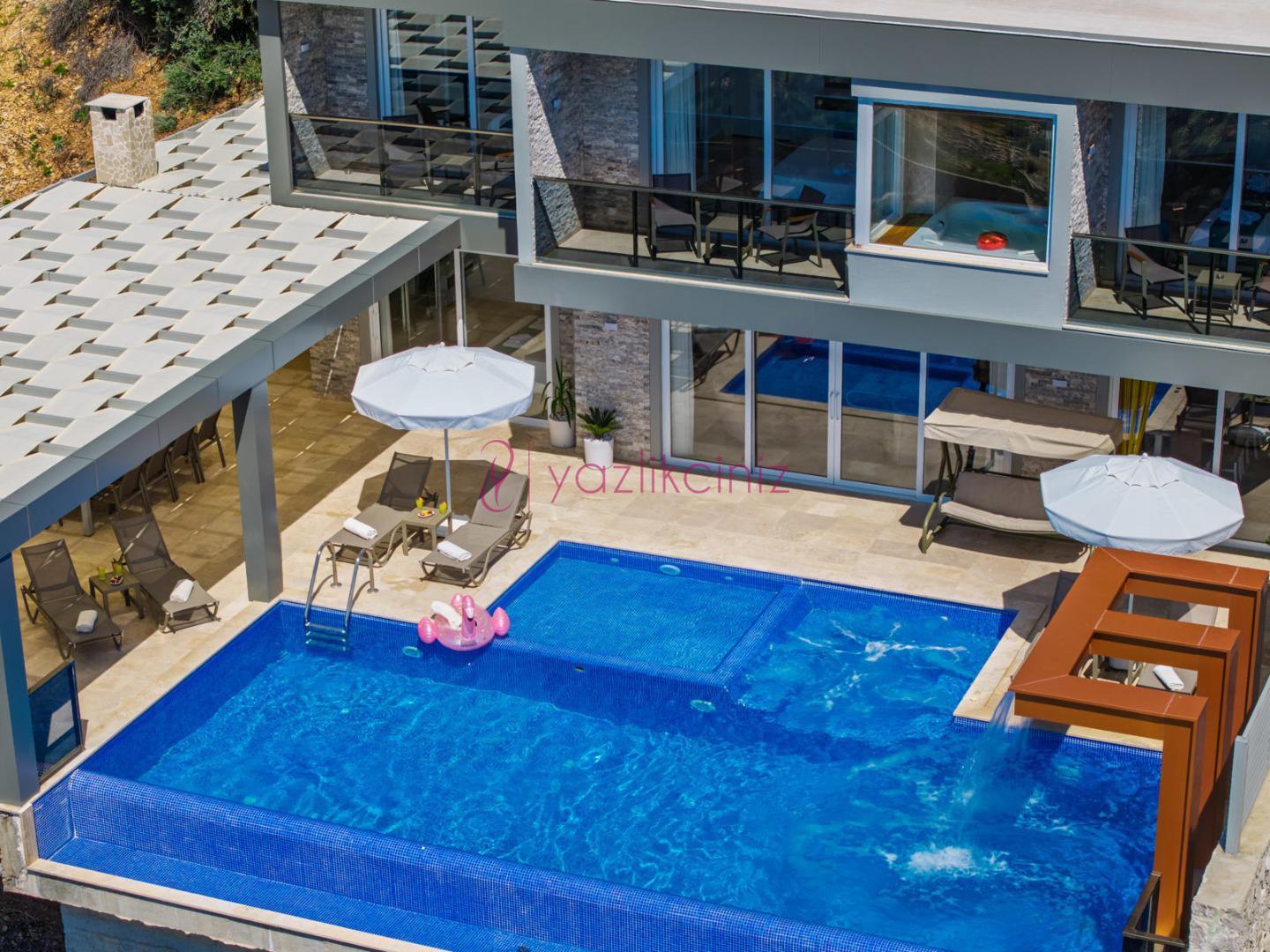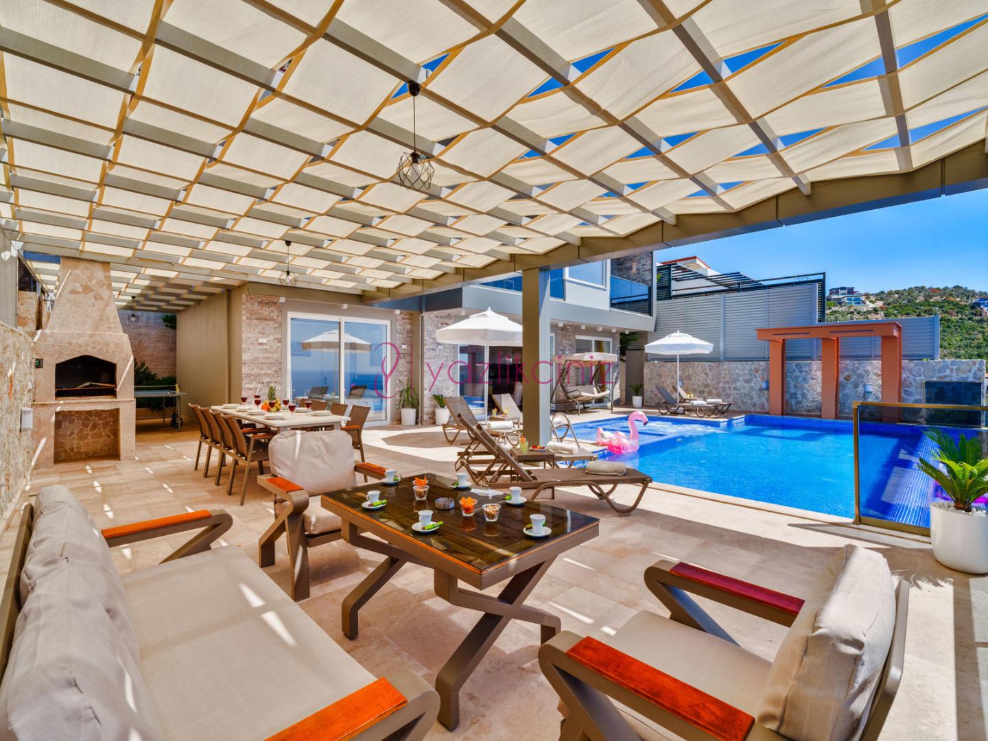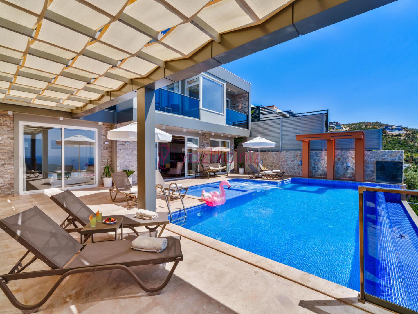 Bahçe içerisinde özel yüzme havuzu, şezlonglar, güneş şemsiyesi, bahçe mobilyaları, barbekü bulunmaktadır.