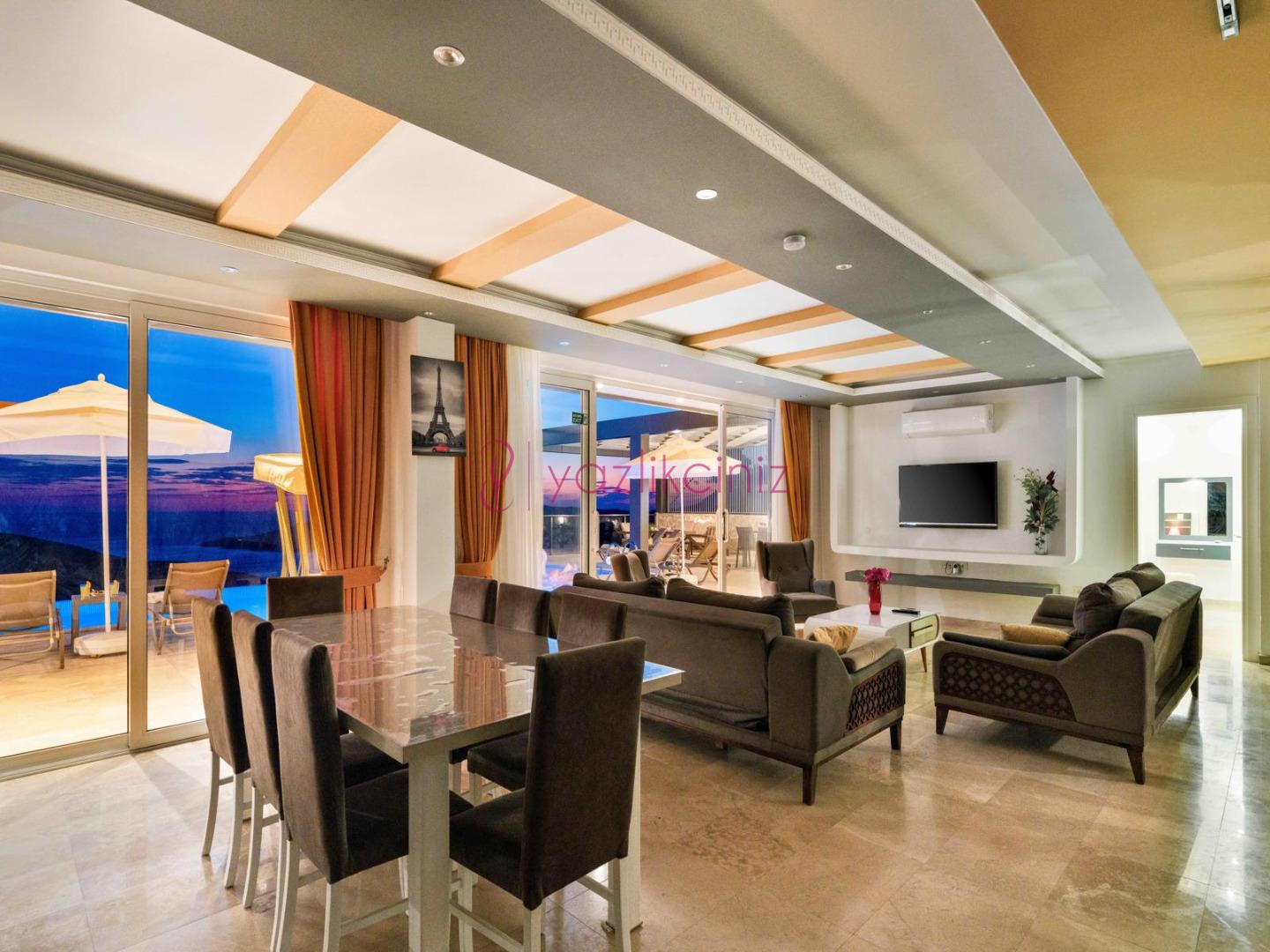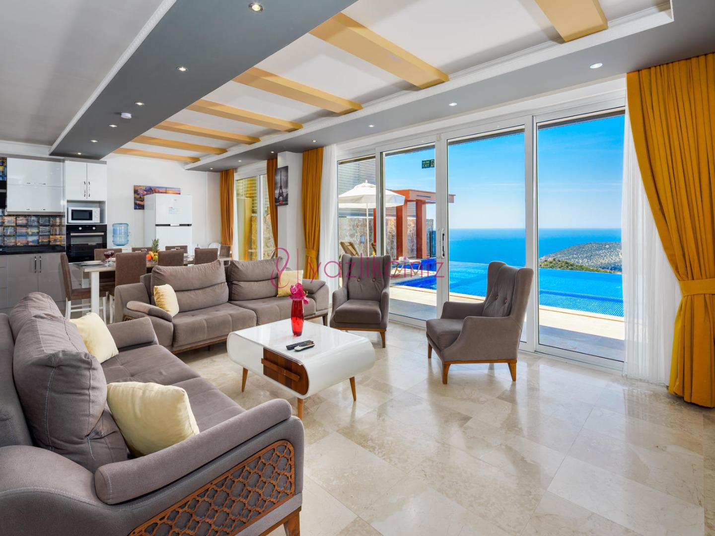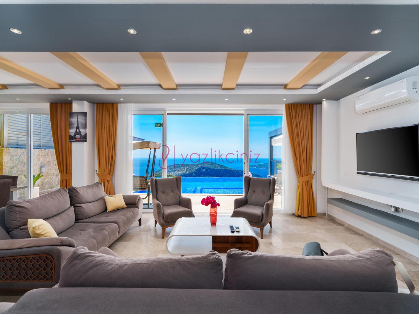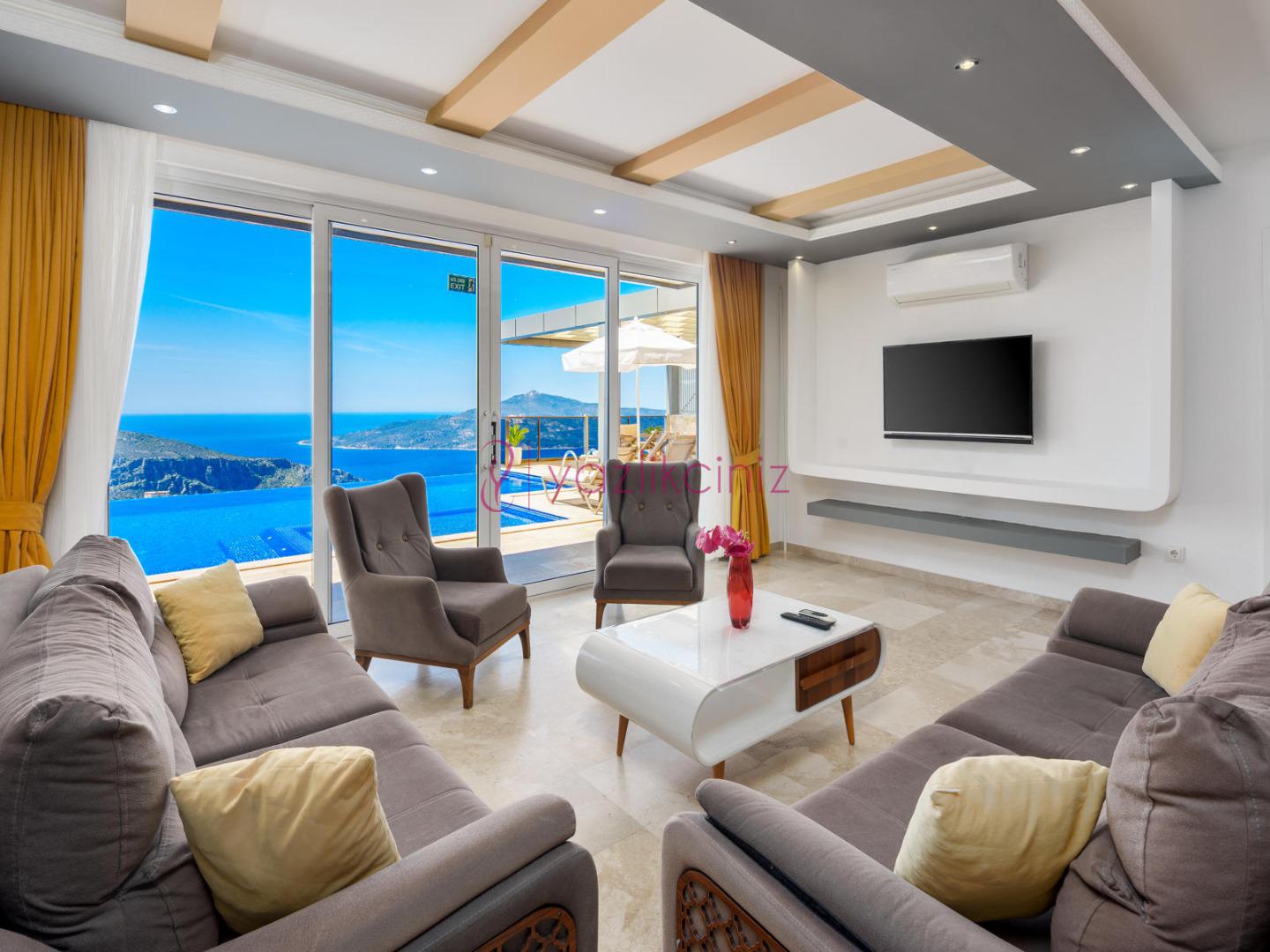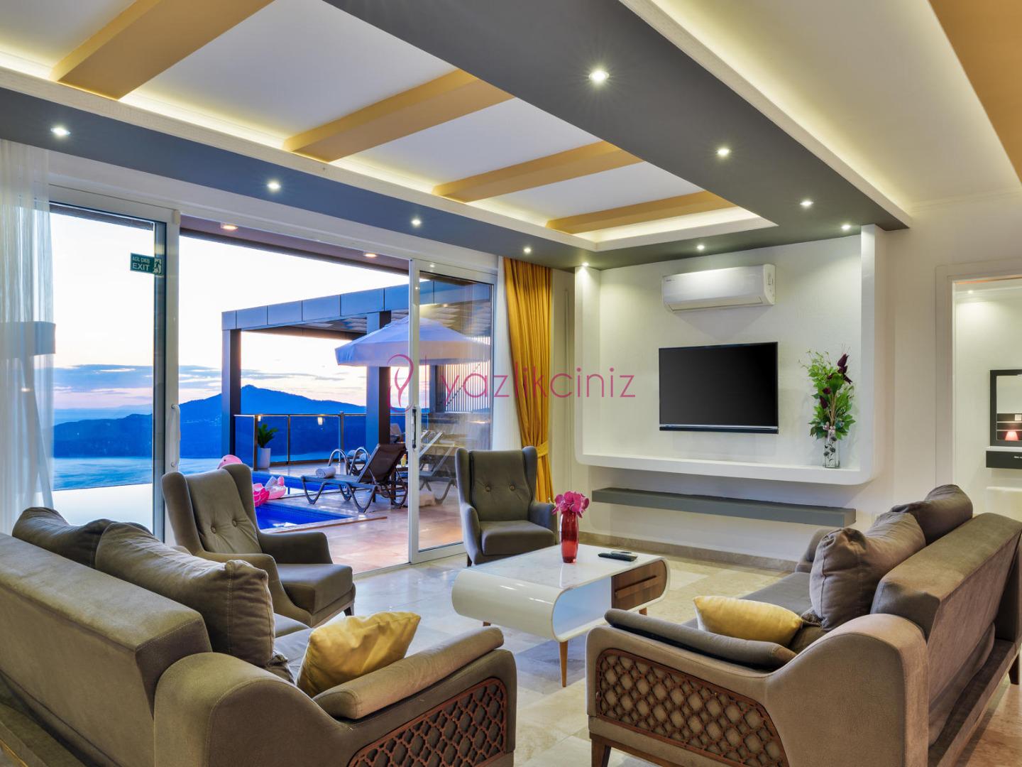 Salon içerisinde oturma grubu, TV, klima, sehpa bulunmaktadır. Havuz terasına çıkış yapılabilmektedir.