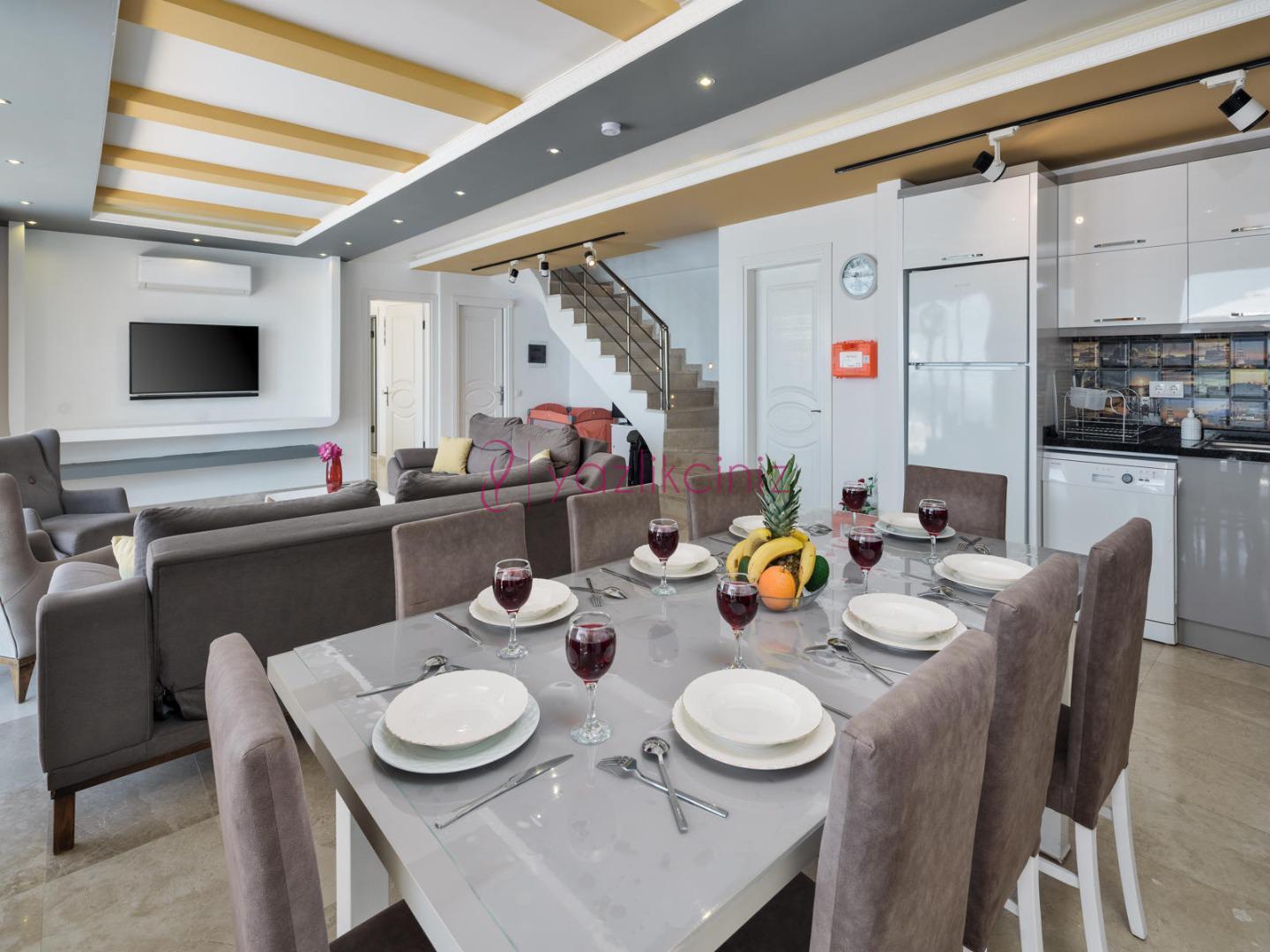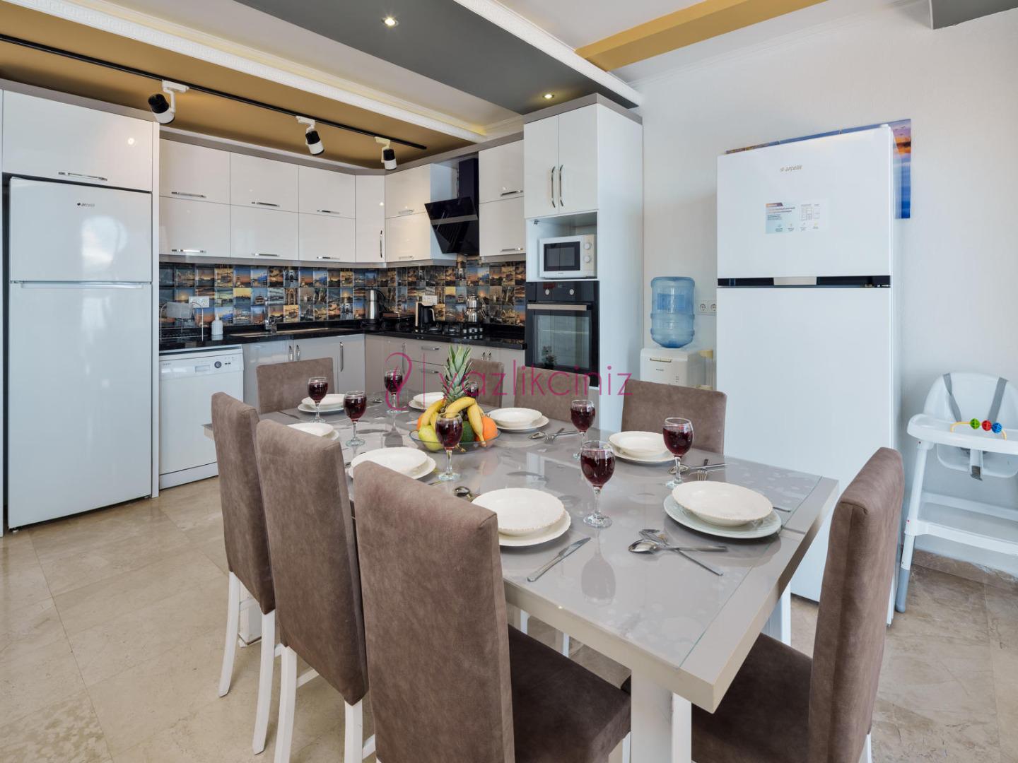 Modern Amerikan mutfak içerisinde buzdolabı, bulaşık makinesi, fırın, ocak, mikrodalga fırın, tost makinesi, yemek masası, yemek takımları, çatal ve bıçak takımları, tencere ve tava takımları, bardaklar bulunmaktadır.