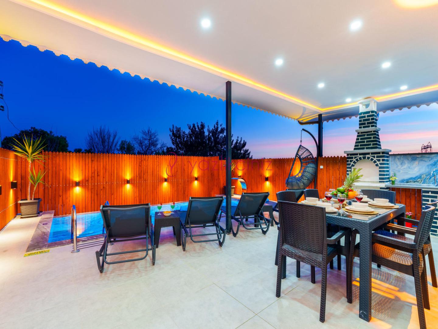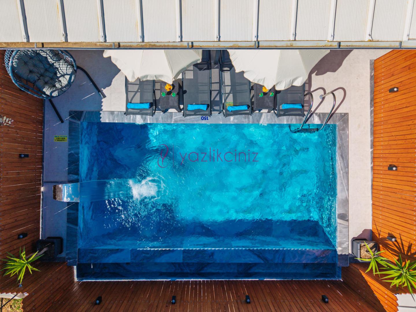 Havuz Terasında; korunaklı özel yüzme havuzu, şezlong, şemsiye, köşk, salıncak, masa tenisi, bilardo masası, yemek masası, bahçe oturma grubu, barbekü alanı bulunmaktadır.