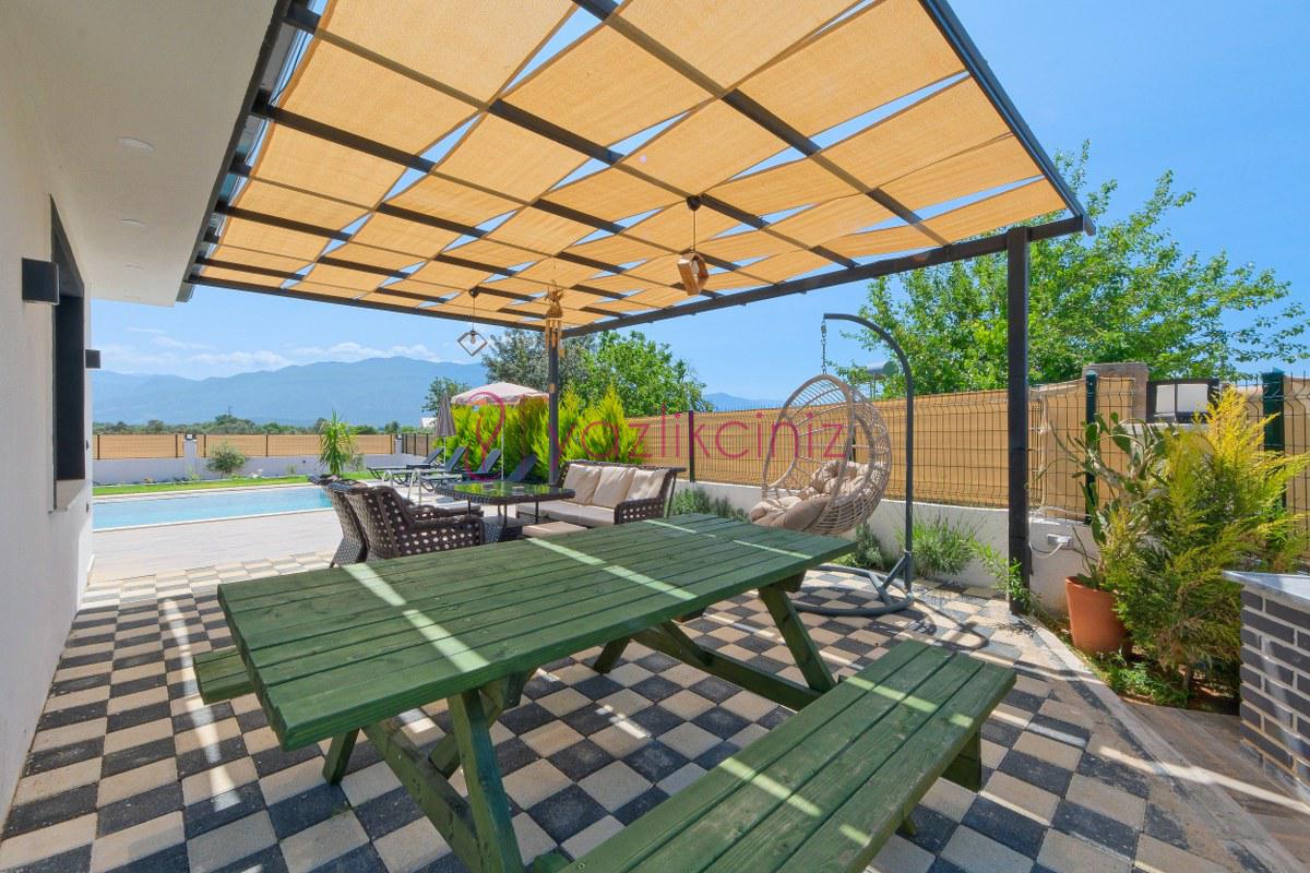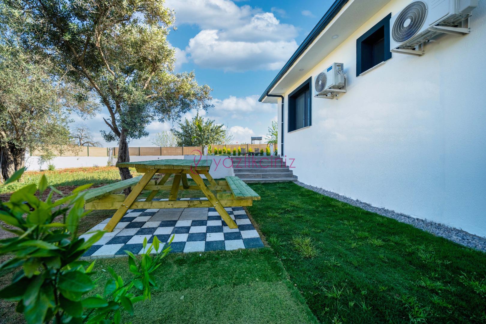 Şemsiye, şezlong, salıncak, barbekü, masa tenisi, çocuk oyun alanı, yemek masası bulunmaktadır.