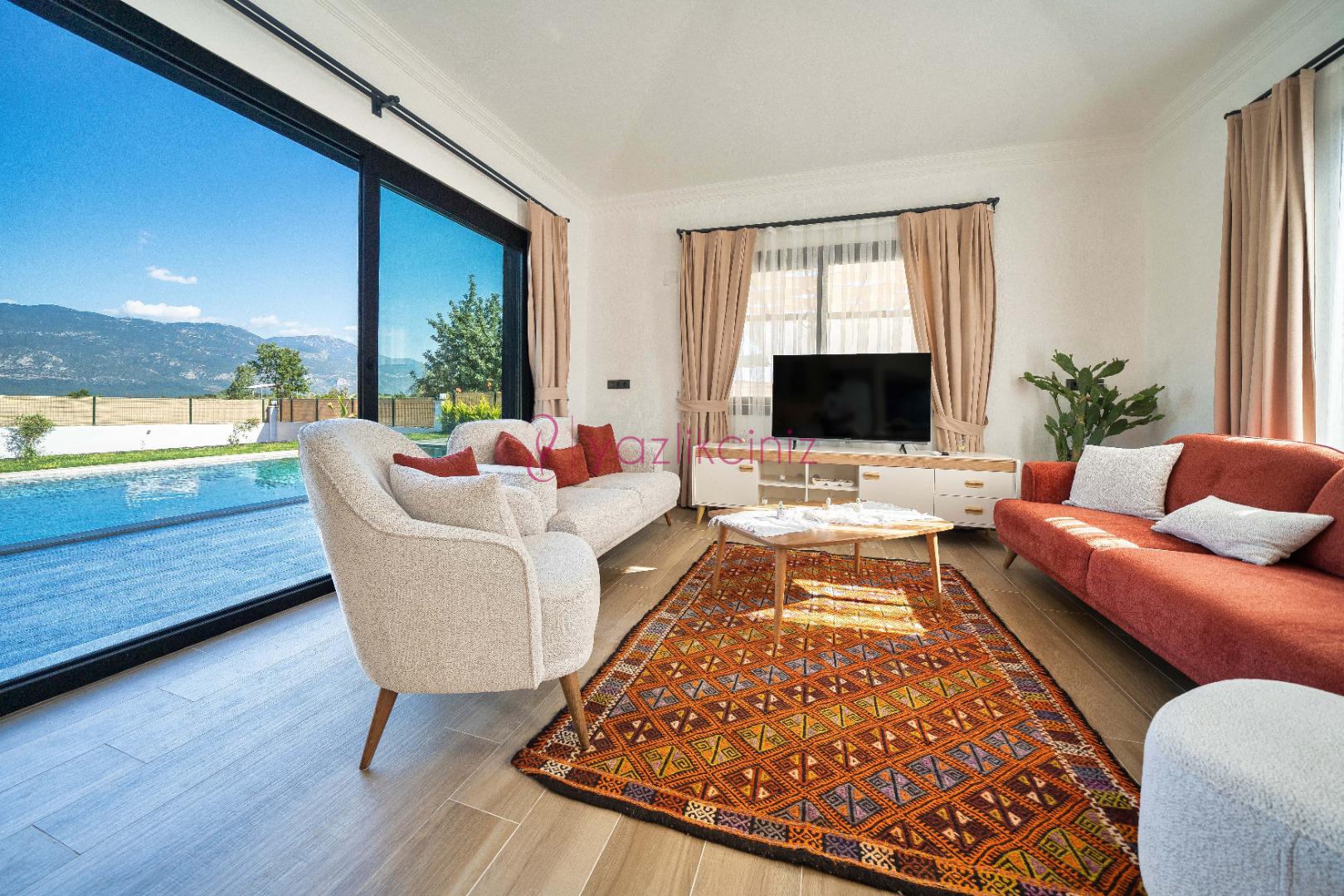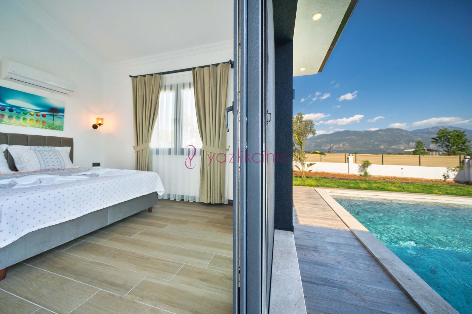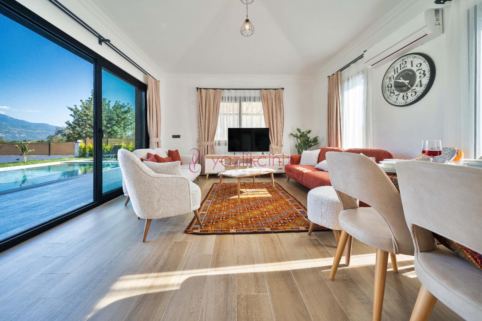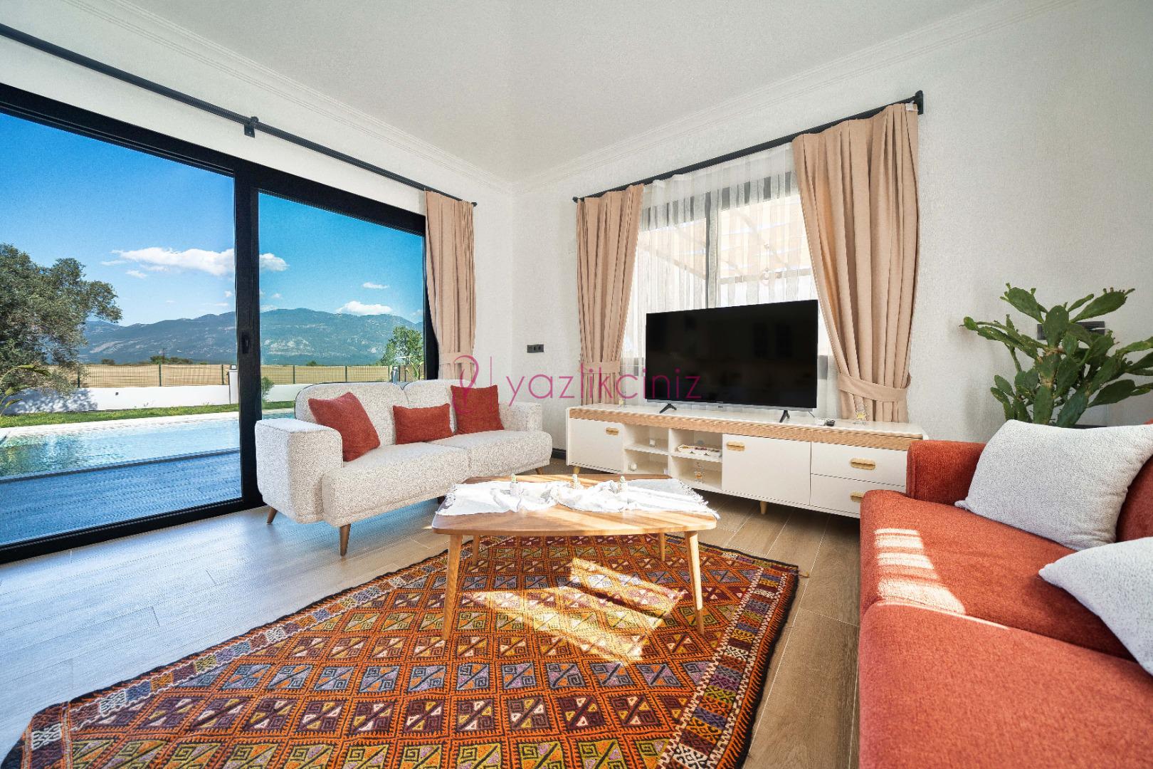 Havuz manzarası karşısında oturma grubumuz, televizyon, uydu alıcısı, orta sehpa, klima, havuz terasına çıkış bulunmaktadır.