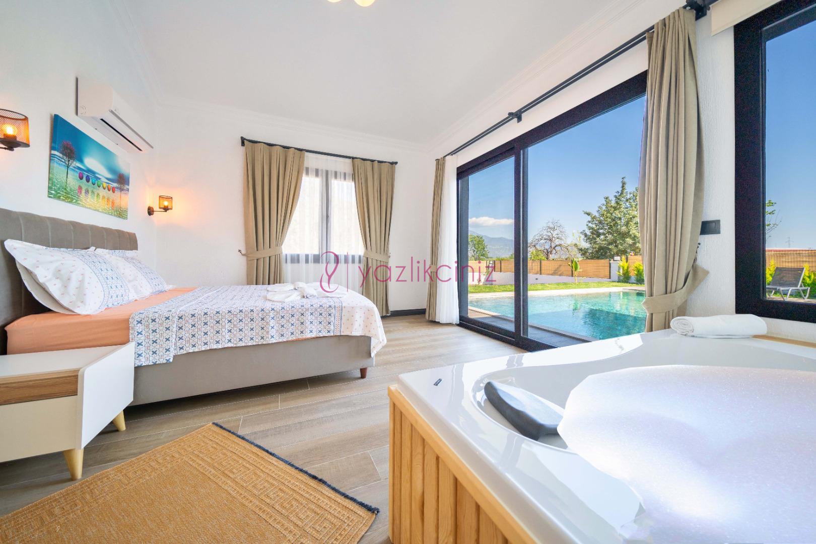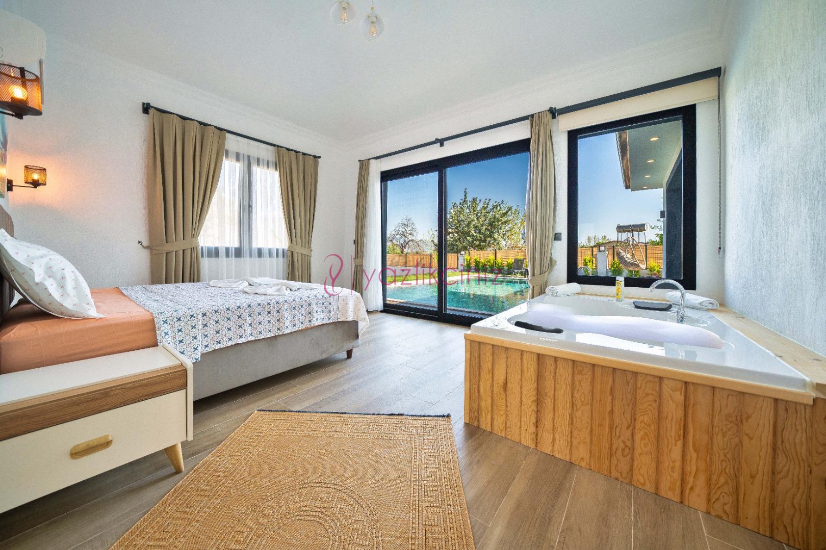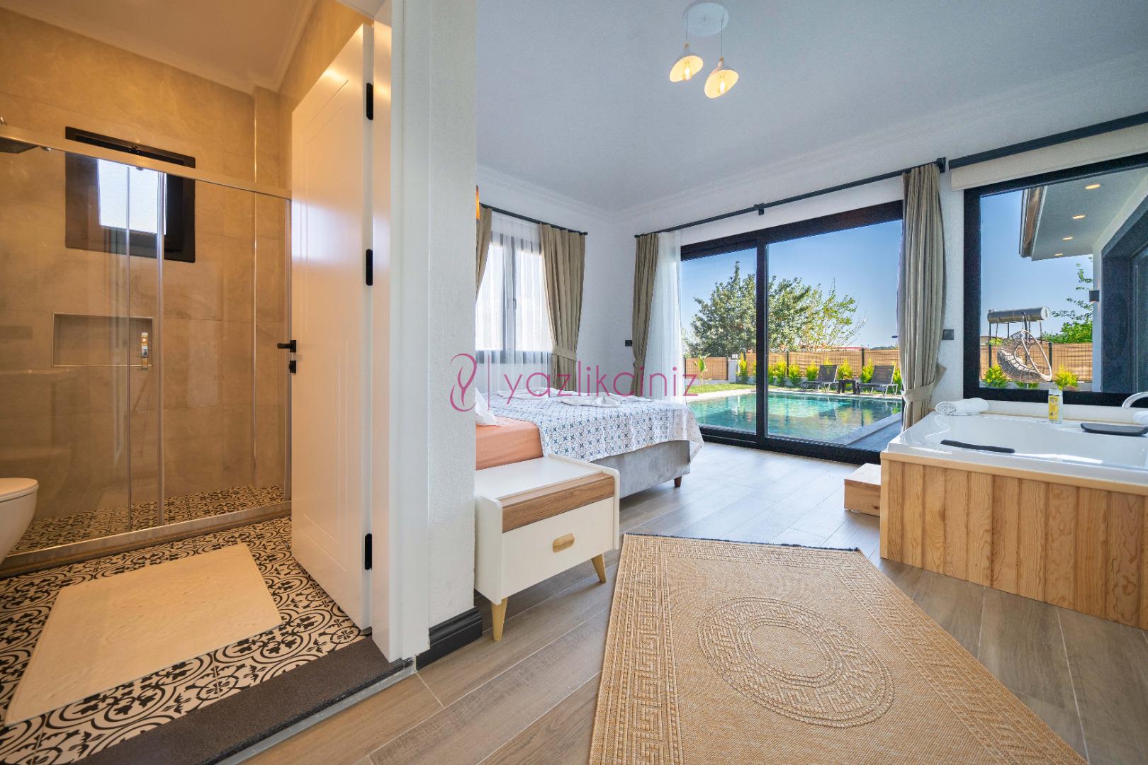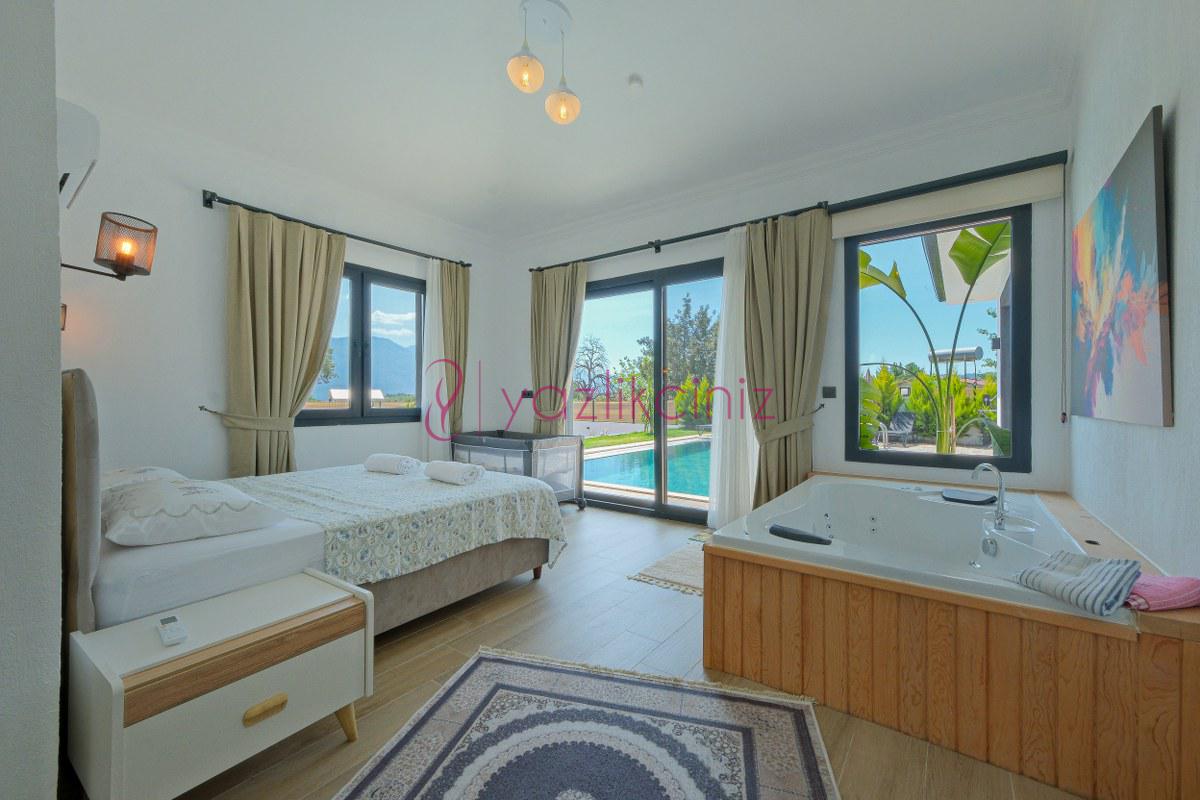 Havuz manzarası karşısında oturma grubumuz, televizyon, uydu alıcısı, orta sehpa, klima, havuz terasına çıkış bulunmaktadır.