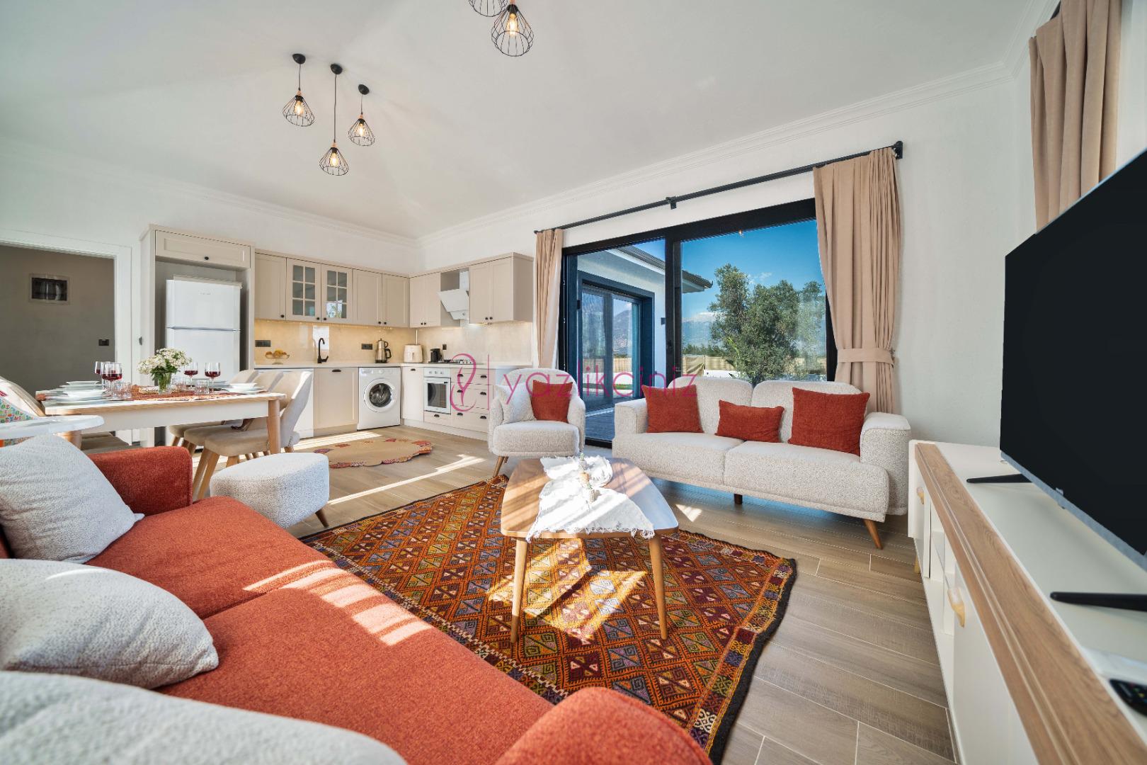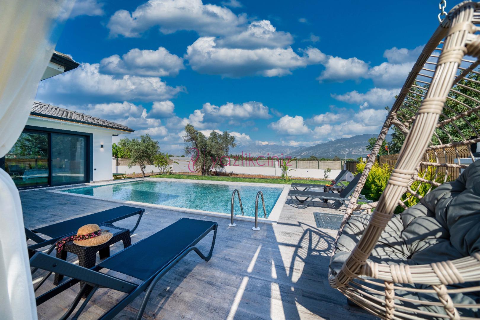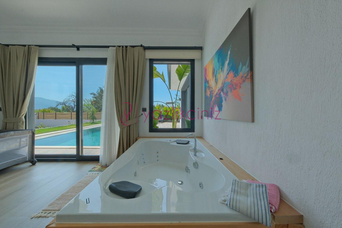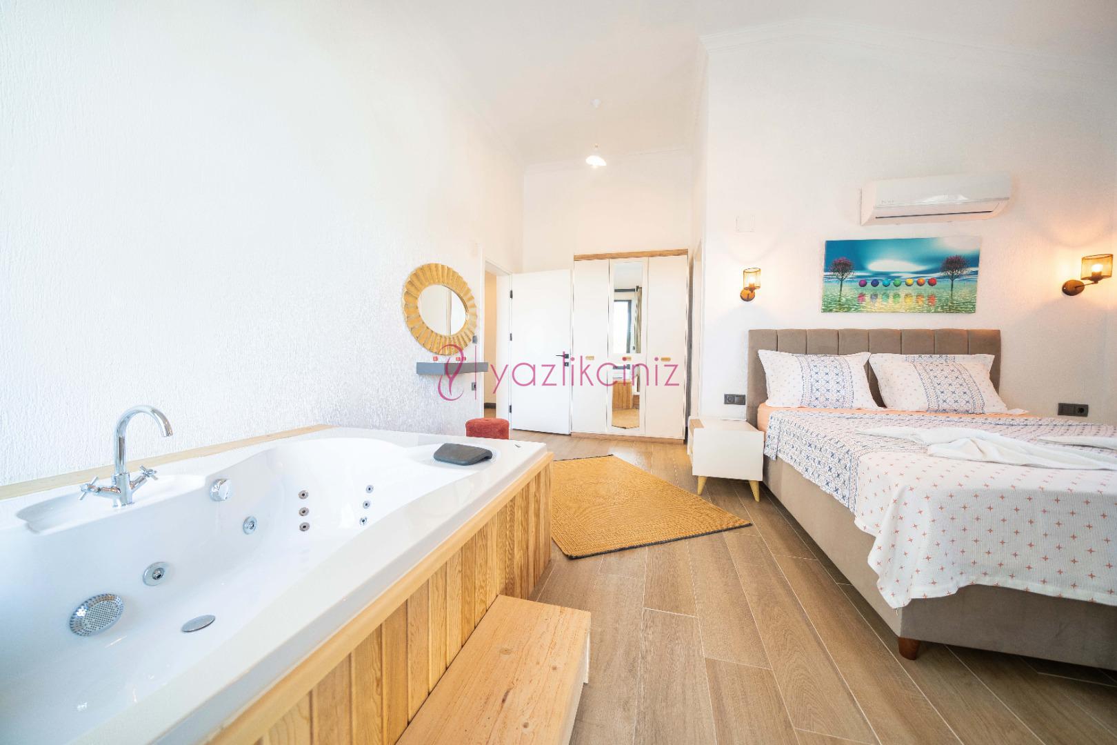 Havuz manzarası karşısında oturma grubumuz, televizyon, uydu alıcısı, orta sehpa, klima, havuz terasına çıkış bulunmaktadır.