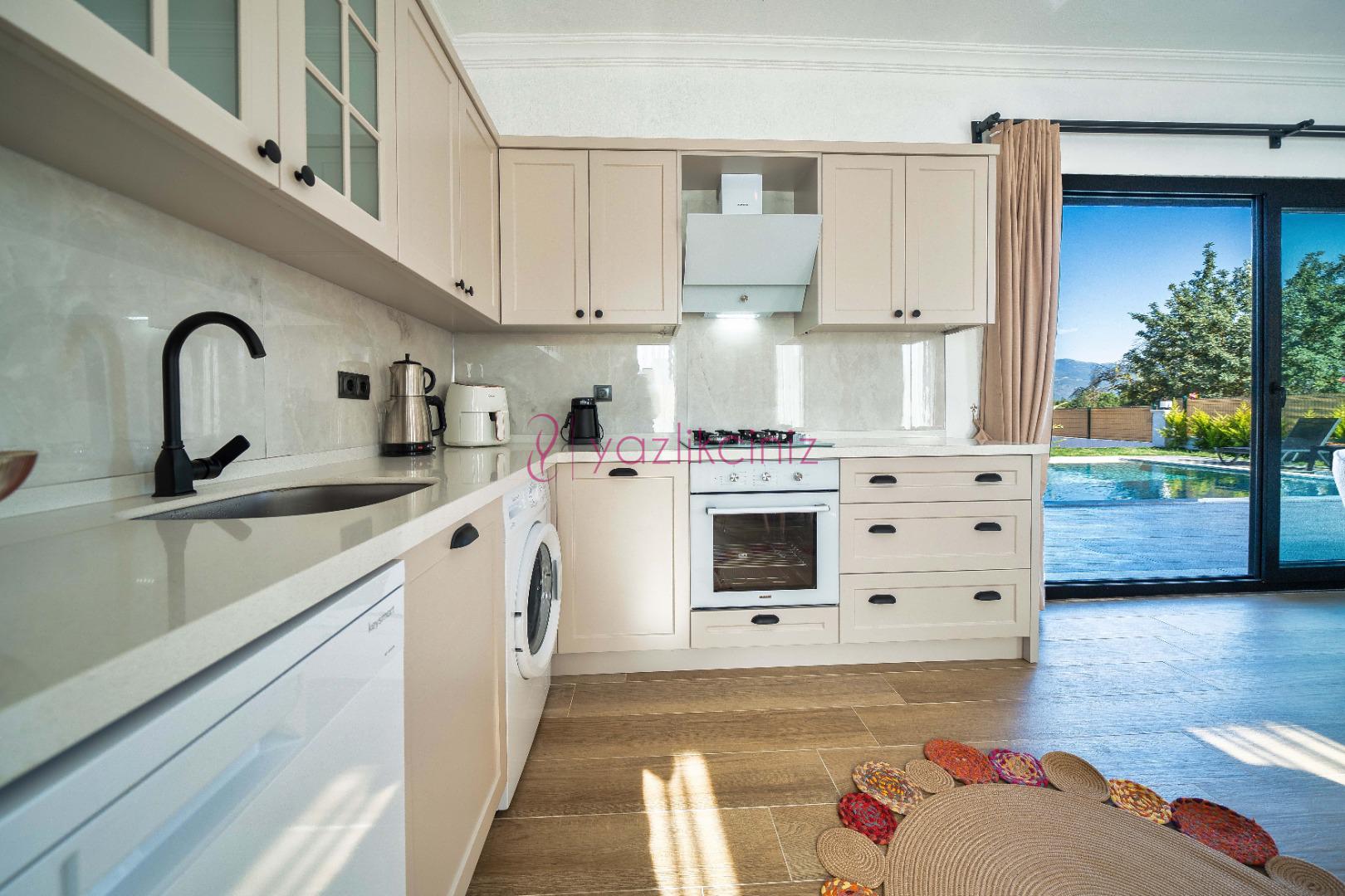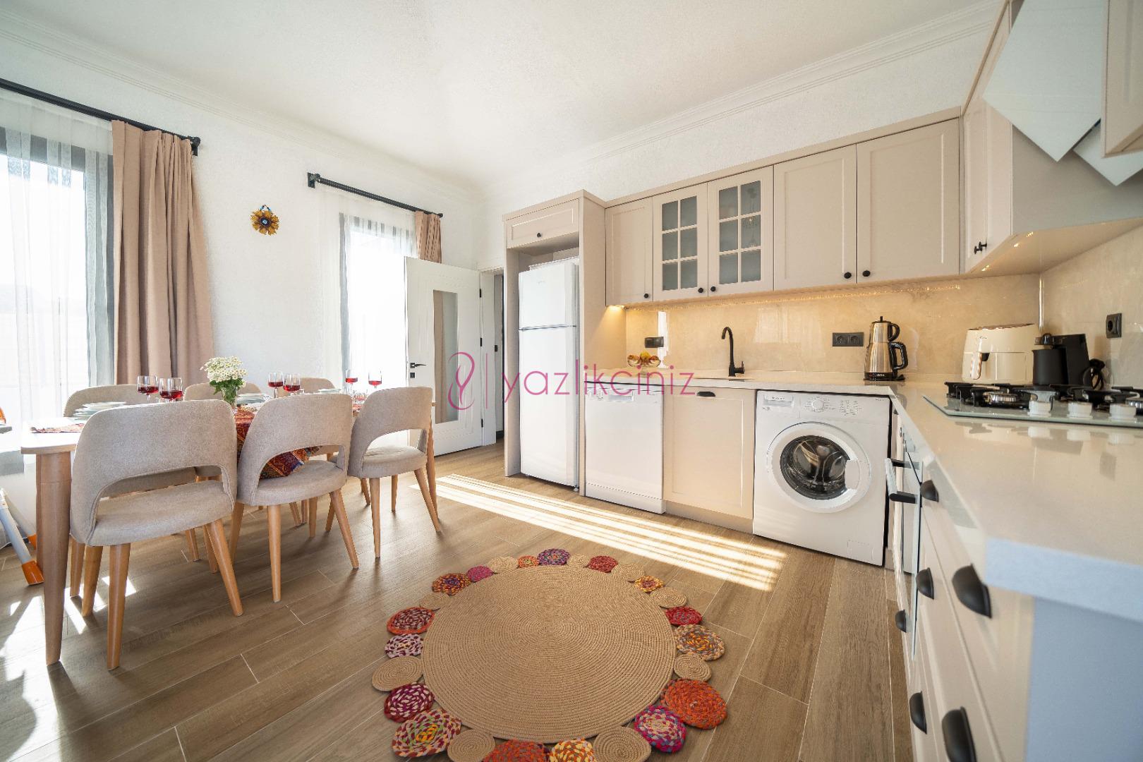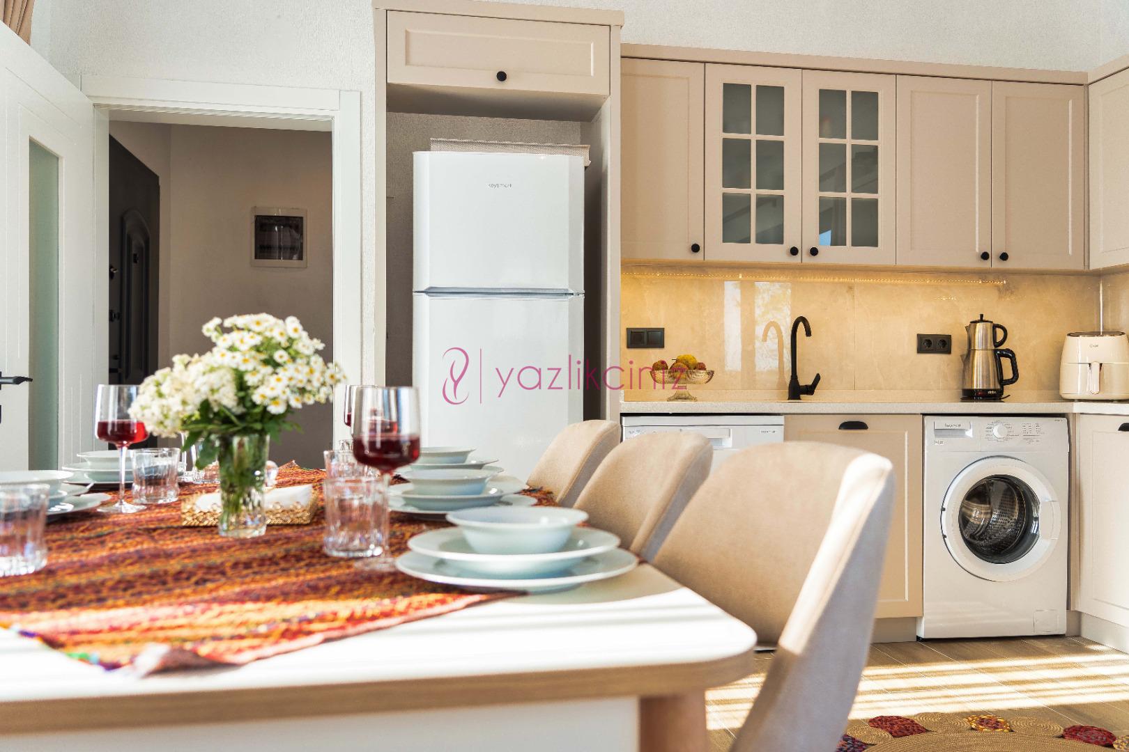Amerikan mutfak, buzdolabı, bulaşık makinesi, çamaşır makinesi, fırın, 4’lü ocak (ankastre), yemek masası, kahve makinesi, elektrikli su ısıtıcı, tava tencere vb. mutfak ekipmanları, yemek takımı bulunmaktadır.
