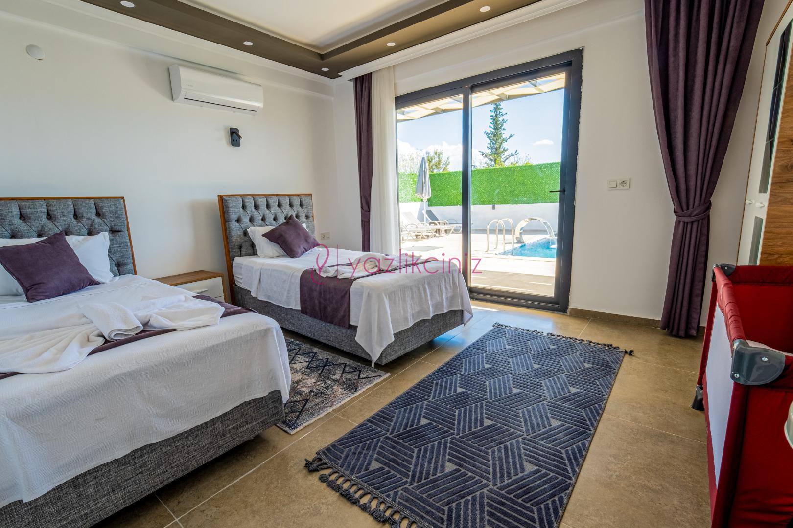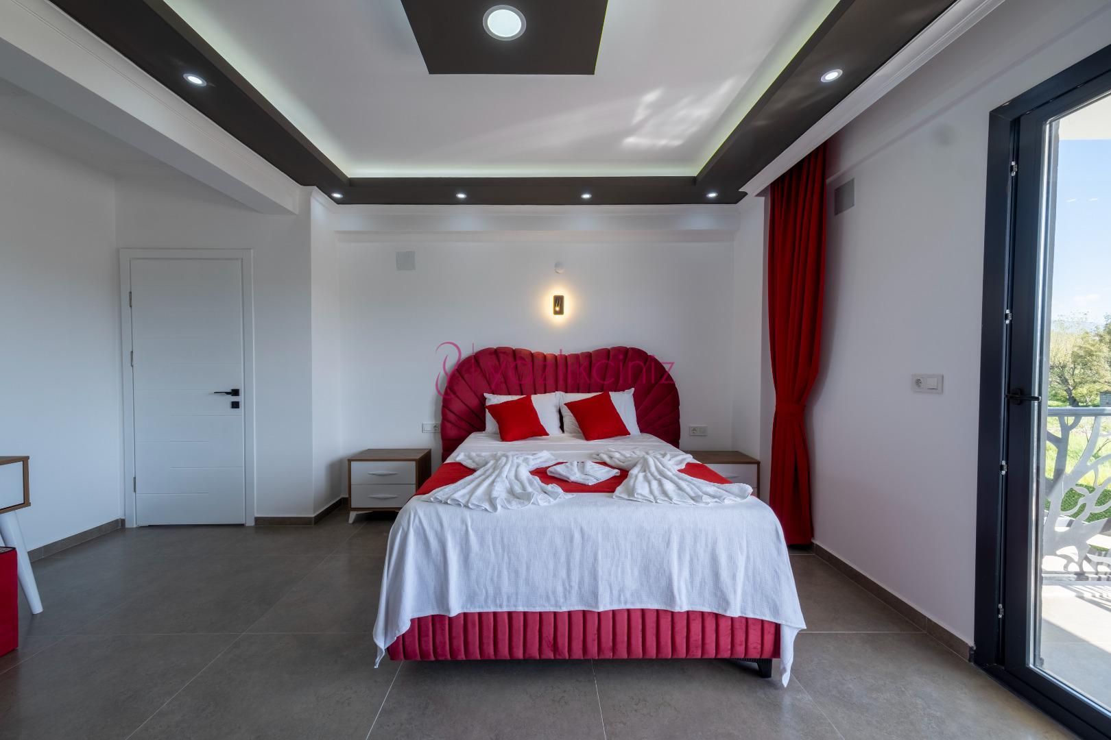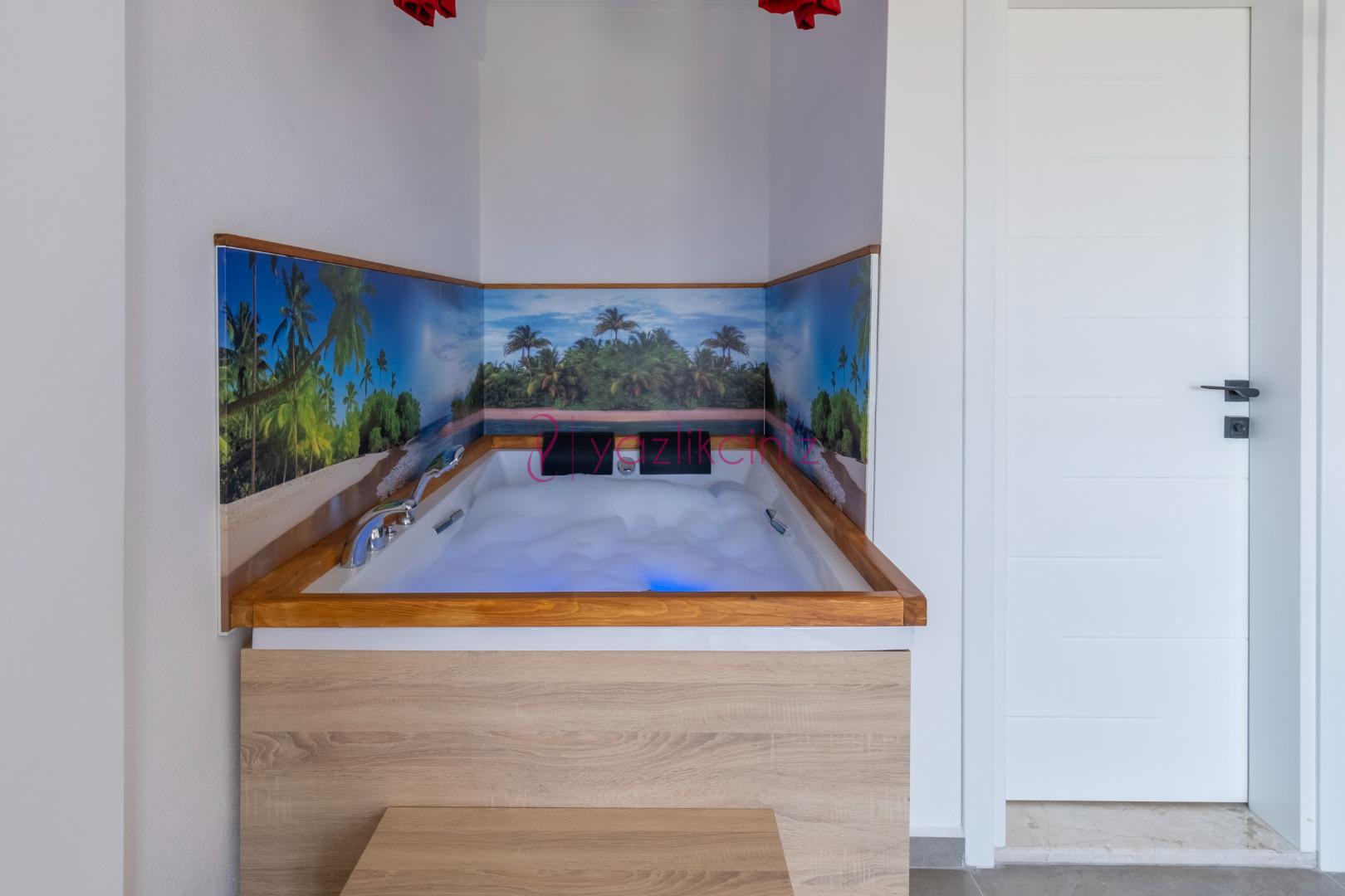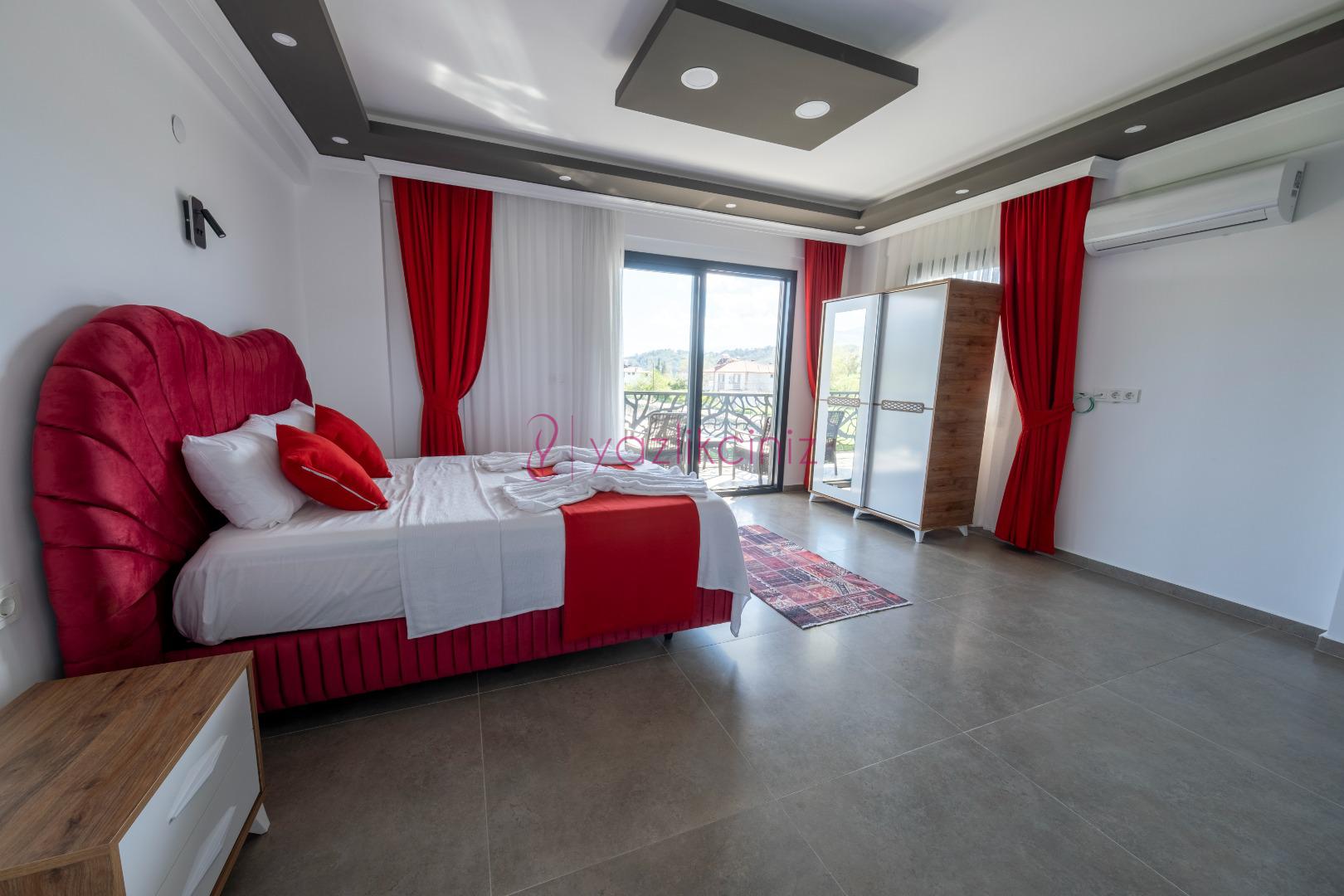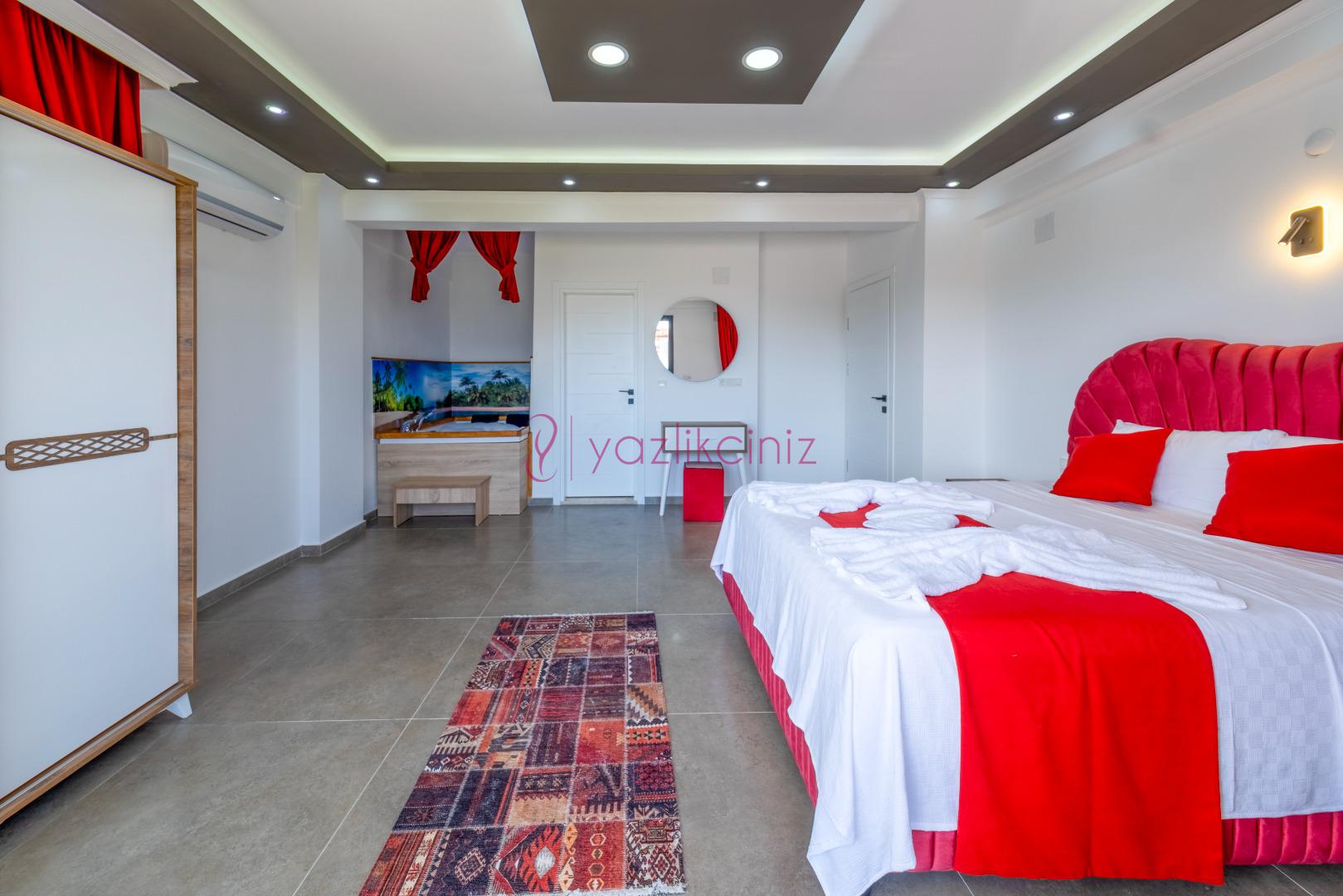1. Yatak odası: Çift kişilik yatak, makyaj masası,klima, elbise dolabı, komodin, jakuzi, kapalı havuz, şömine, tuvalet, banyo bulunmaktadır.