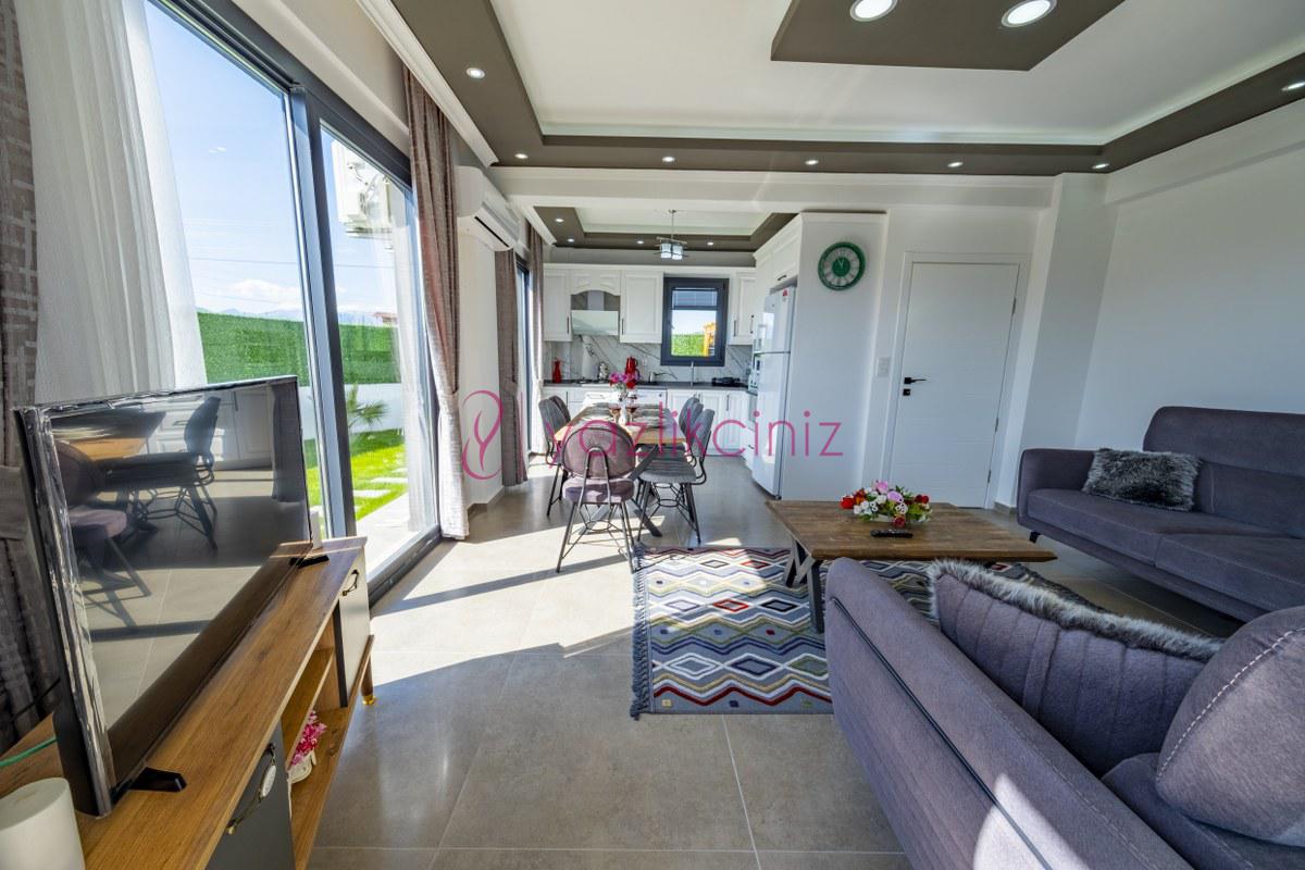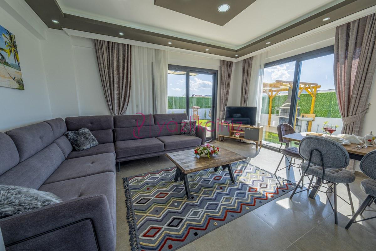 Oturma grubu, plazma televizyon, uydu alıcısı, orta sehpa, havuz alanına çıkış bulunmaktadır.