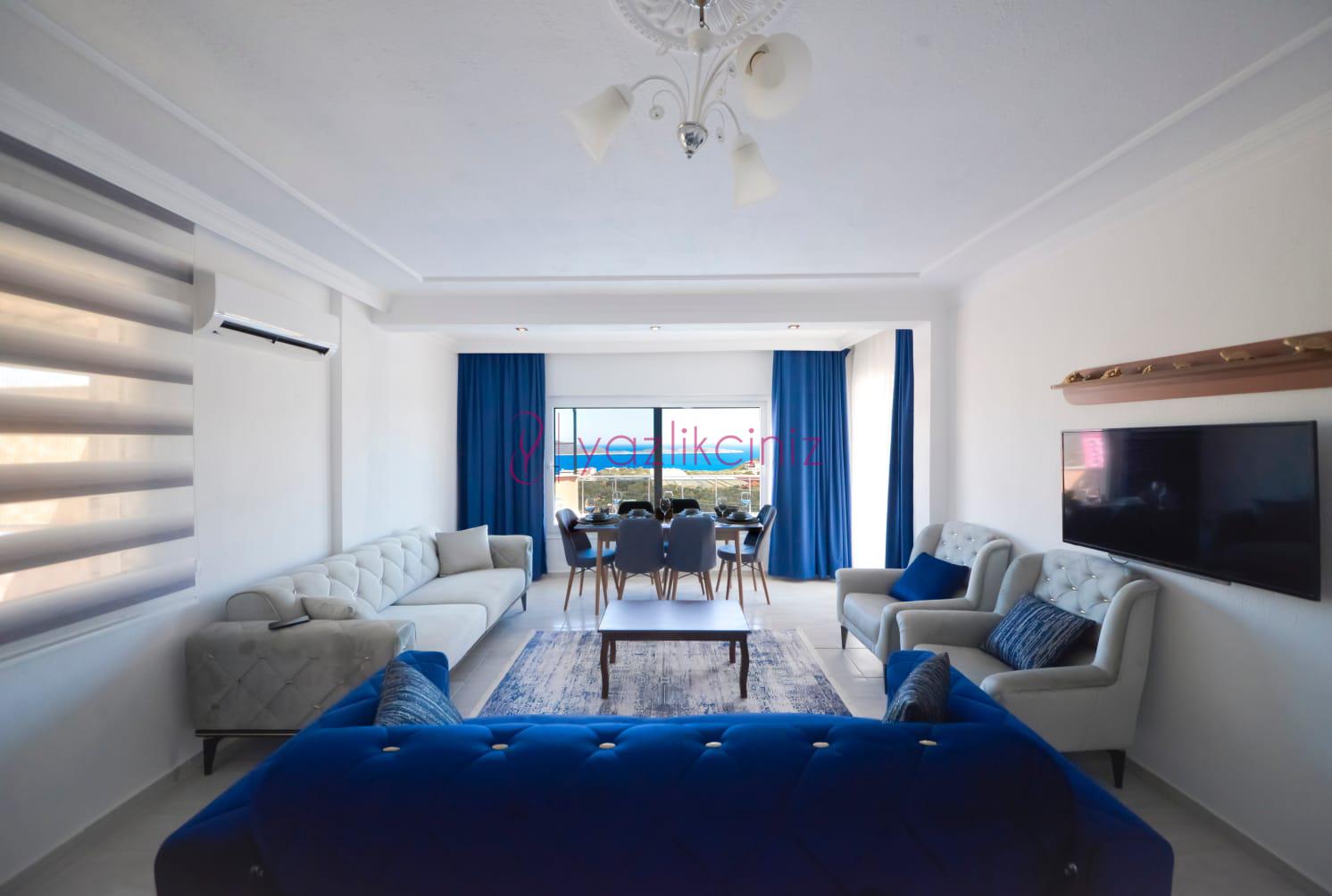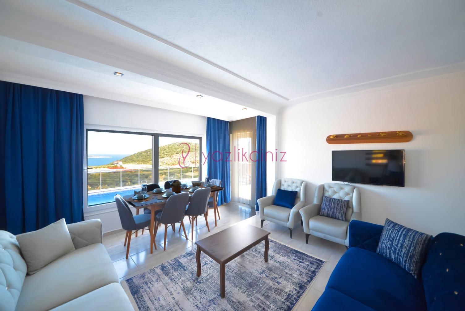 Oturma grubu, uydu alıcı, televizyon, klima, havuza çıkış bulunmaktadır.