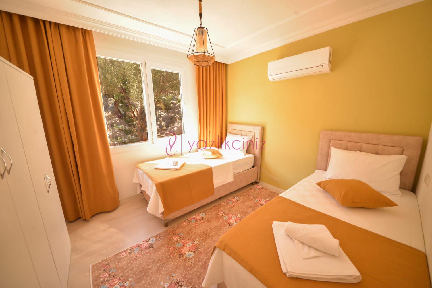3. Yatak Odası: 2 adet tek kişilik yatak, komodin, elbise dolabı, makyaj masası, klima bulunmaktadır. (ortak tuvalet banyo.)