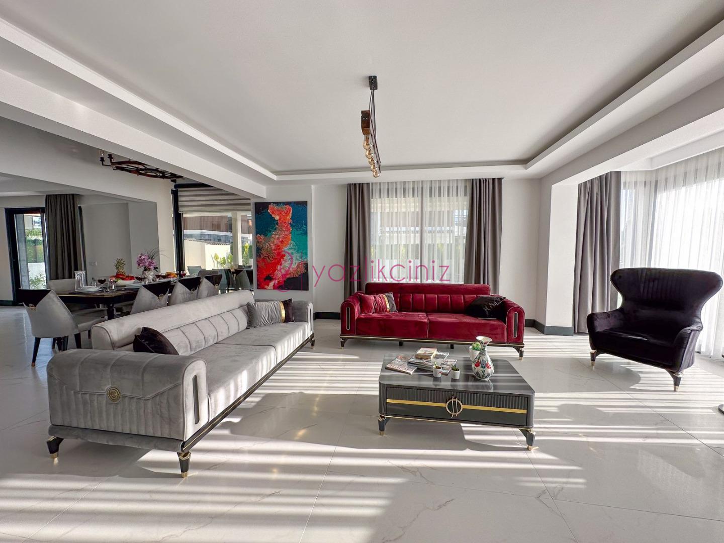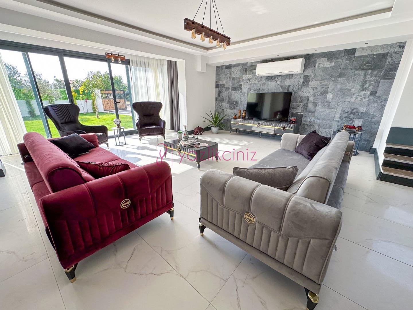 Salon içerisinde konforlu oturma grubu, sehpa, televizyon, uydu alıcı, klima. Salondan havuz terasına çıkış bulunmaktadır.