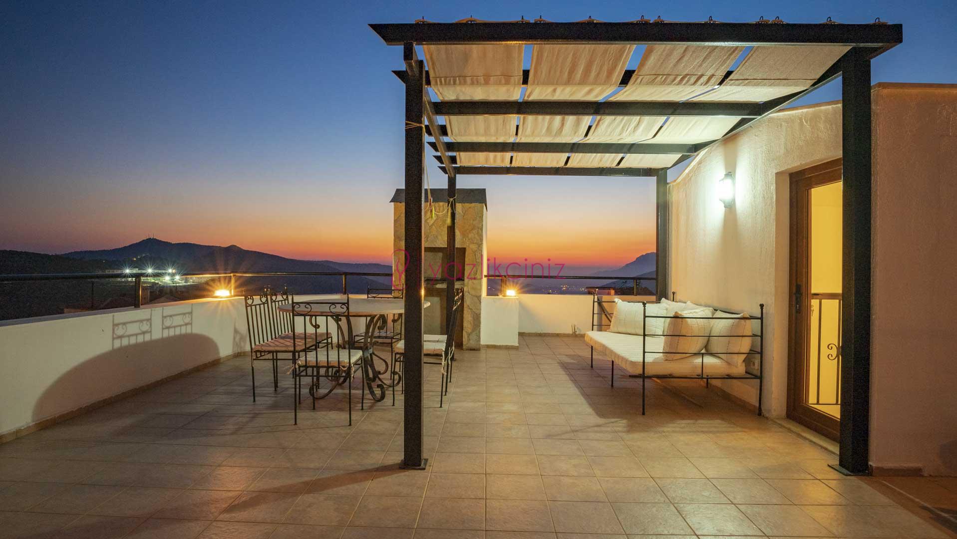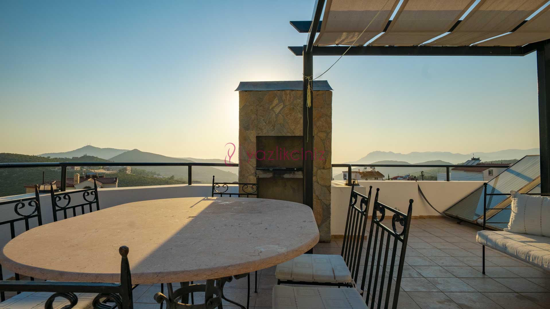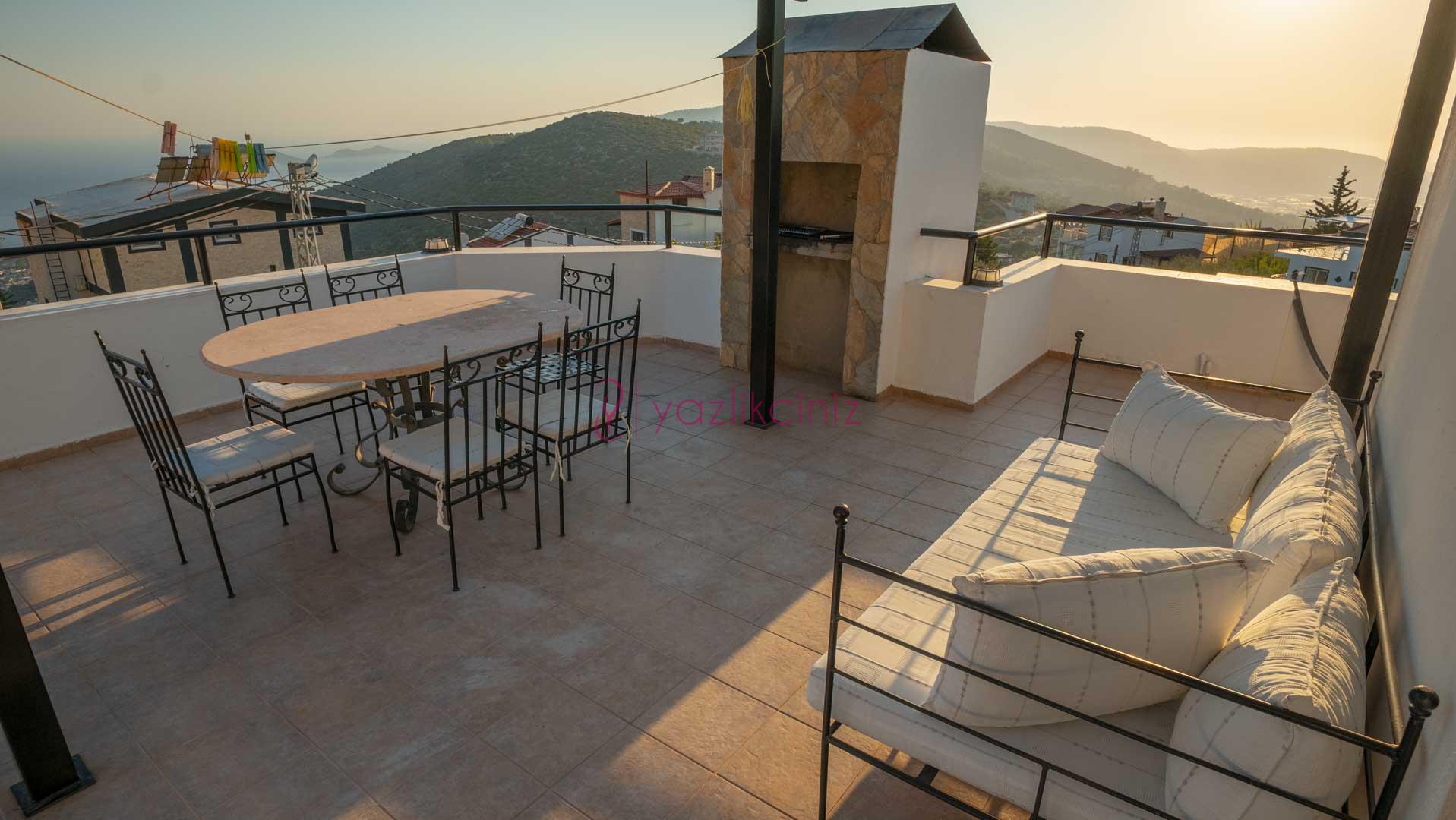 Şezlong, şemsiye, mangal, masa ve sandalyeler bulunmaktadır.