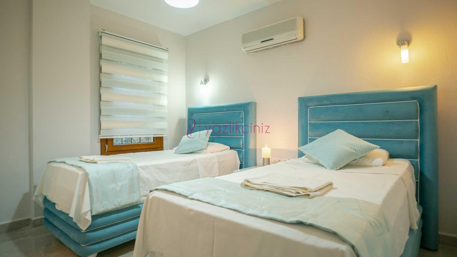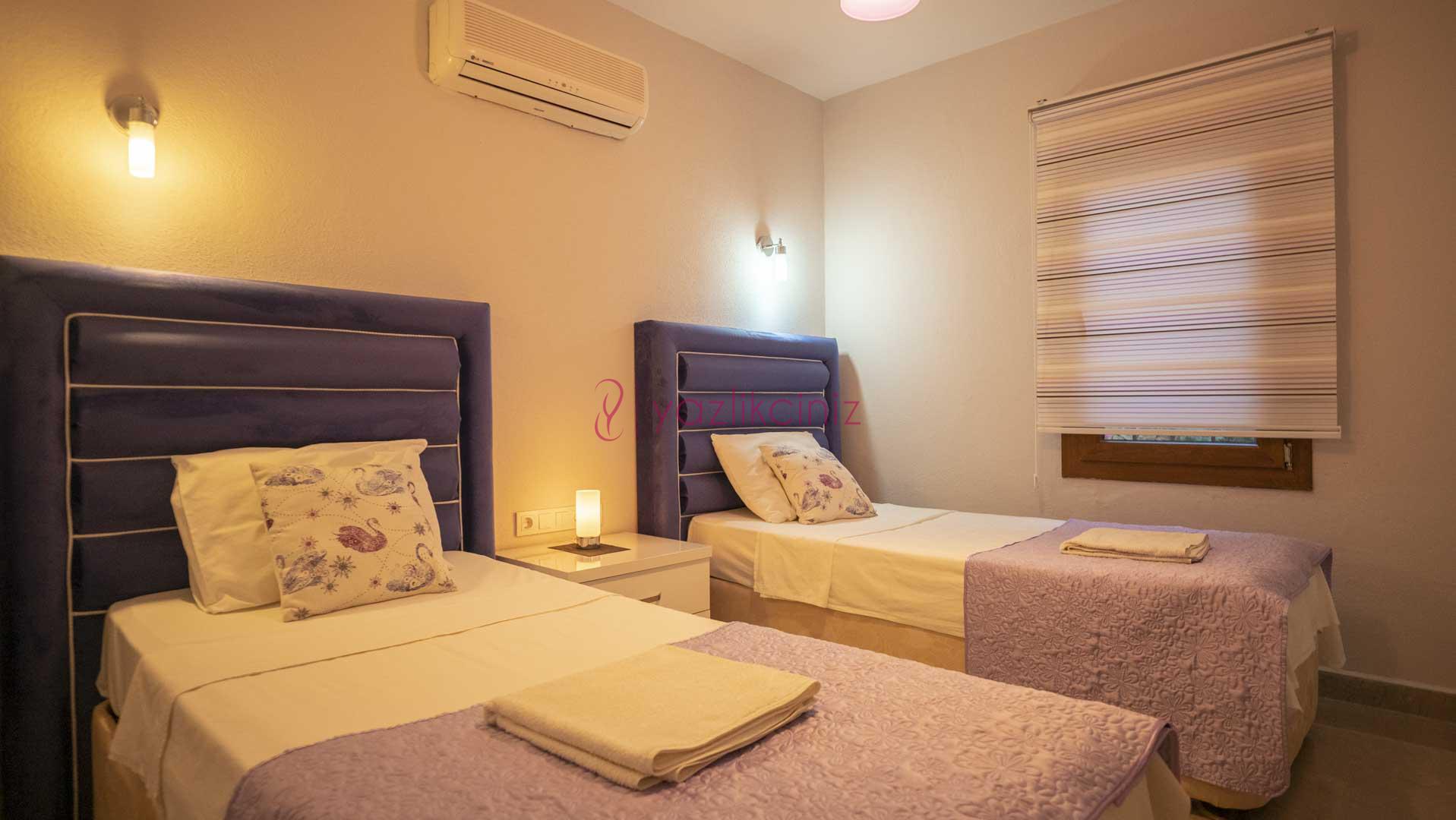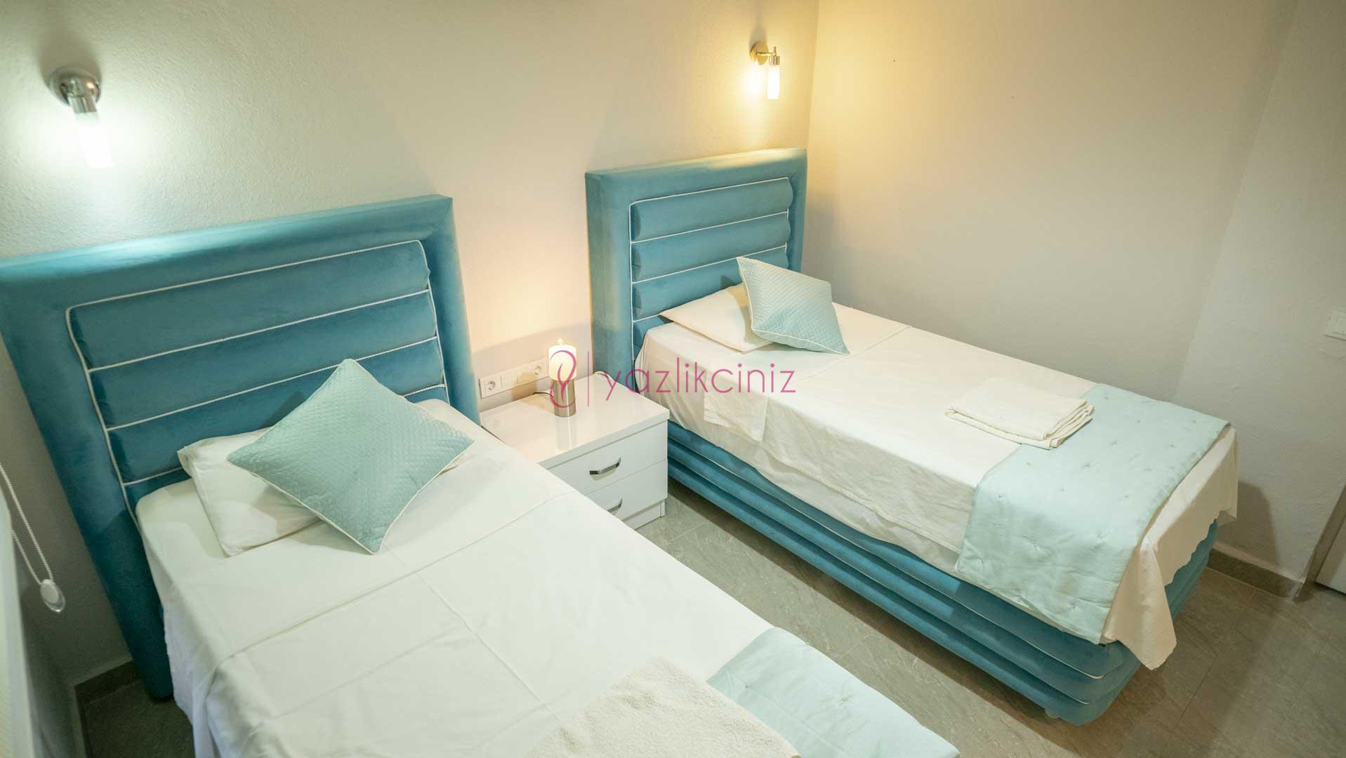 3. Yatak Odası: 2 adet tek kişilik yatak, komodin, elbise dolabı, makyaj masası, puf, klima, banyo ve wc bulunmaktadır.